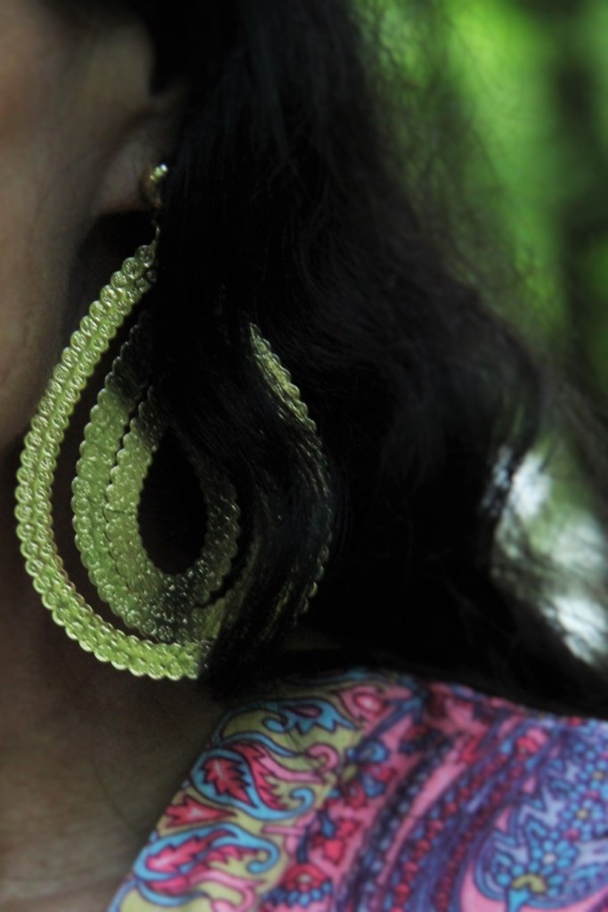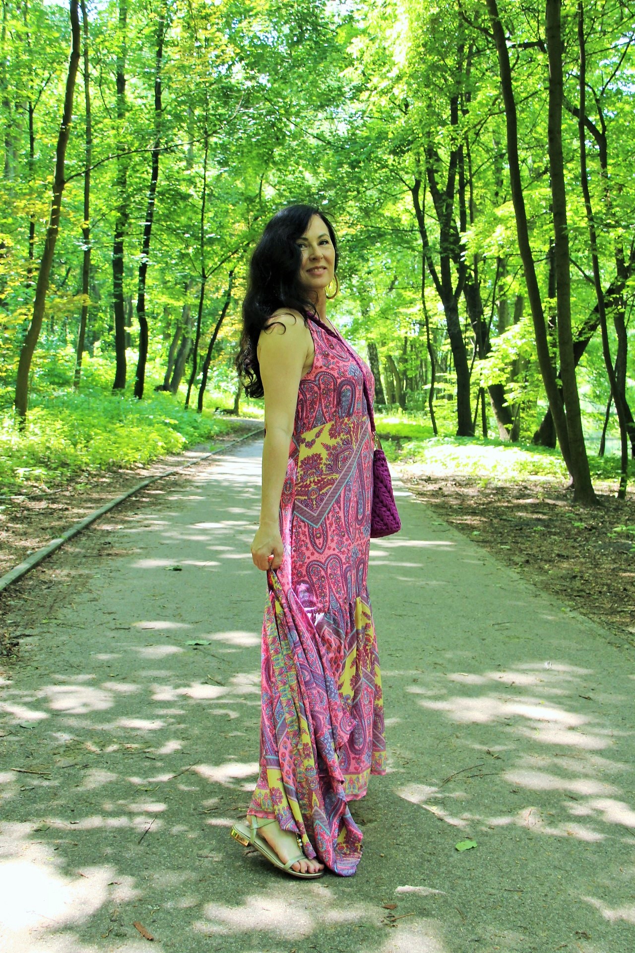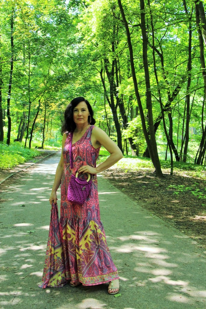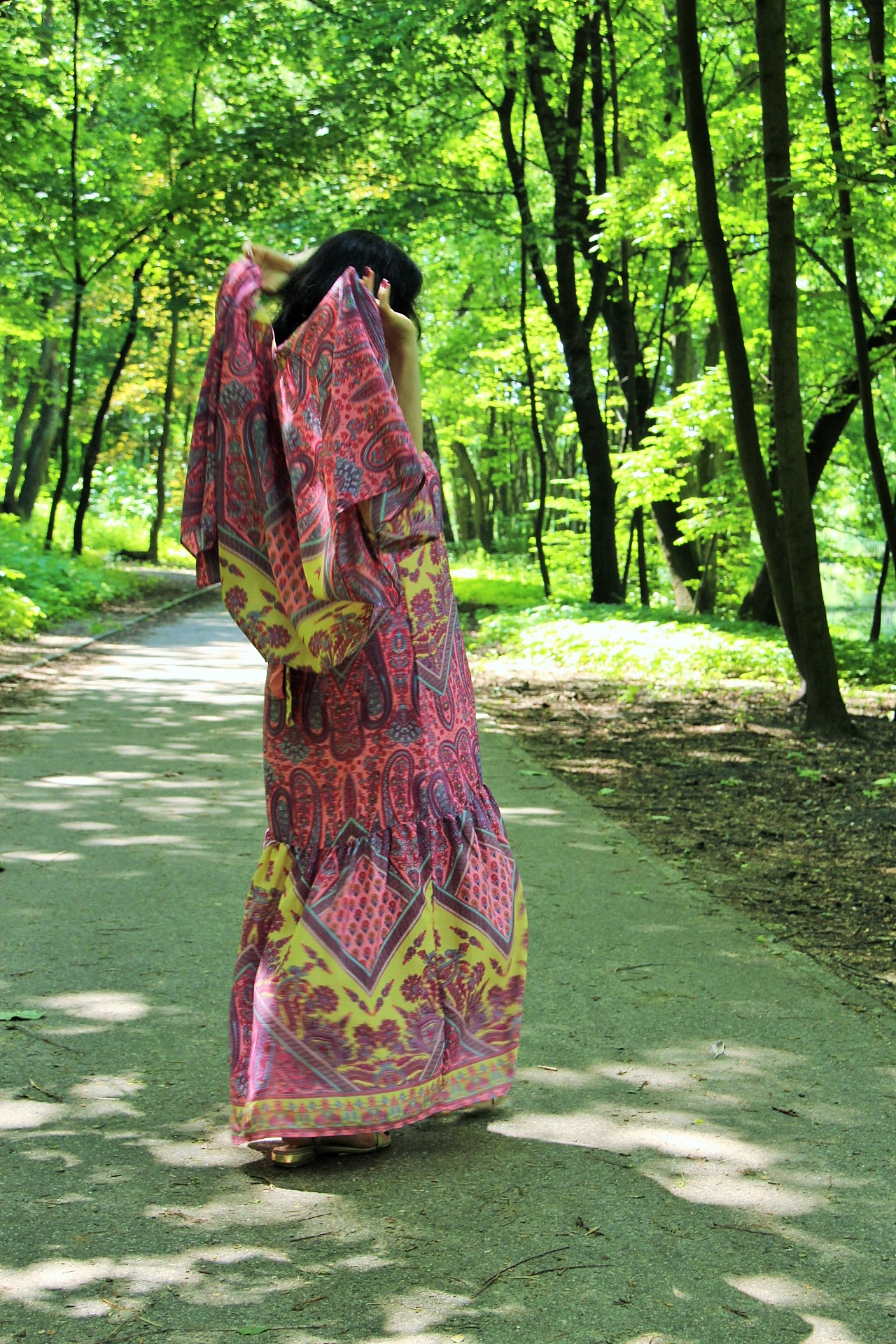 Sukienka w stylu Bollywood, lub jeśli wolisz w stylu boho sprawdzi się zarówno na garden party jak i również na weselu. W zestawie do sukienki jest krótkie kimono, które pomimo upałów może się przydać późnymi wieczorami. Aby look był bardziej orientalny, włożyłam duże, złote kolczyki oraz złote sandały, przyozdobione kryształami Swarovskiego. Z kolei wspaniałe uzupełnienie każdej stylizacji stanowią, kolorowe torebki marki Pleciuga, które ostatnio robią furorę nawet w Dubaju. Dlatego też wybrałam z tej marki, mały koszyk KARDAMON MINI w intensywnym kolorze.
