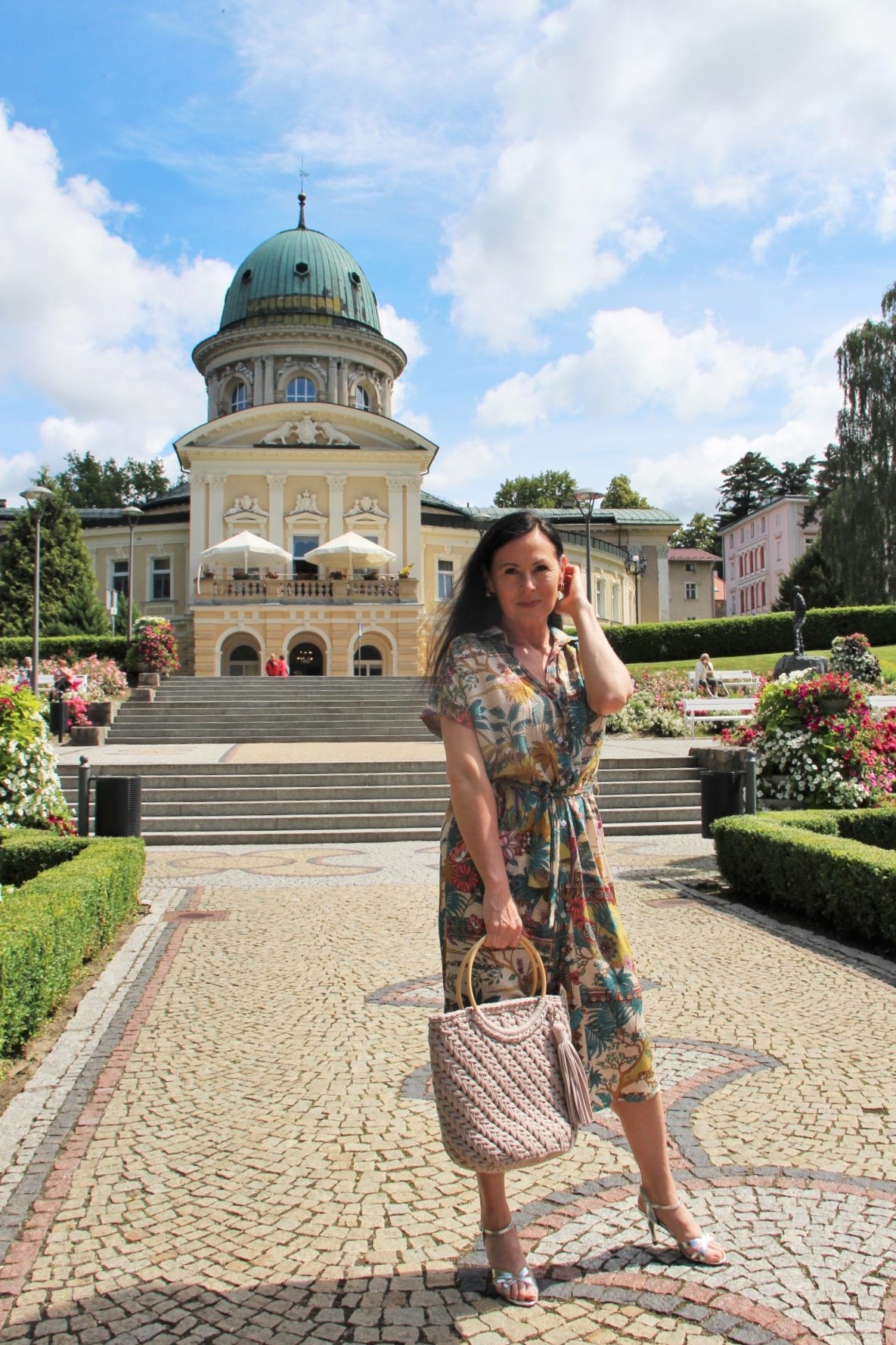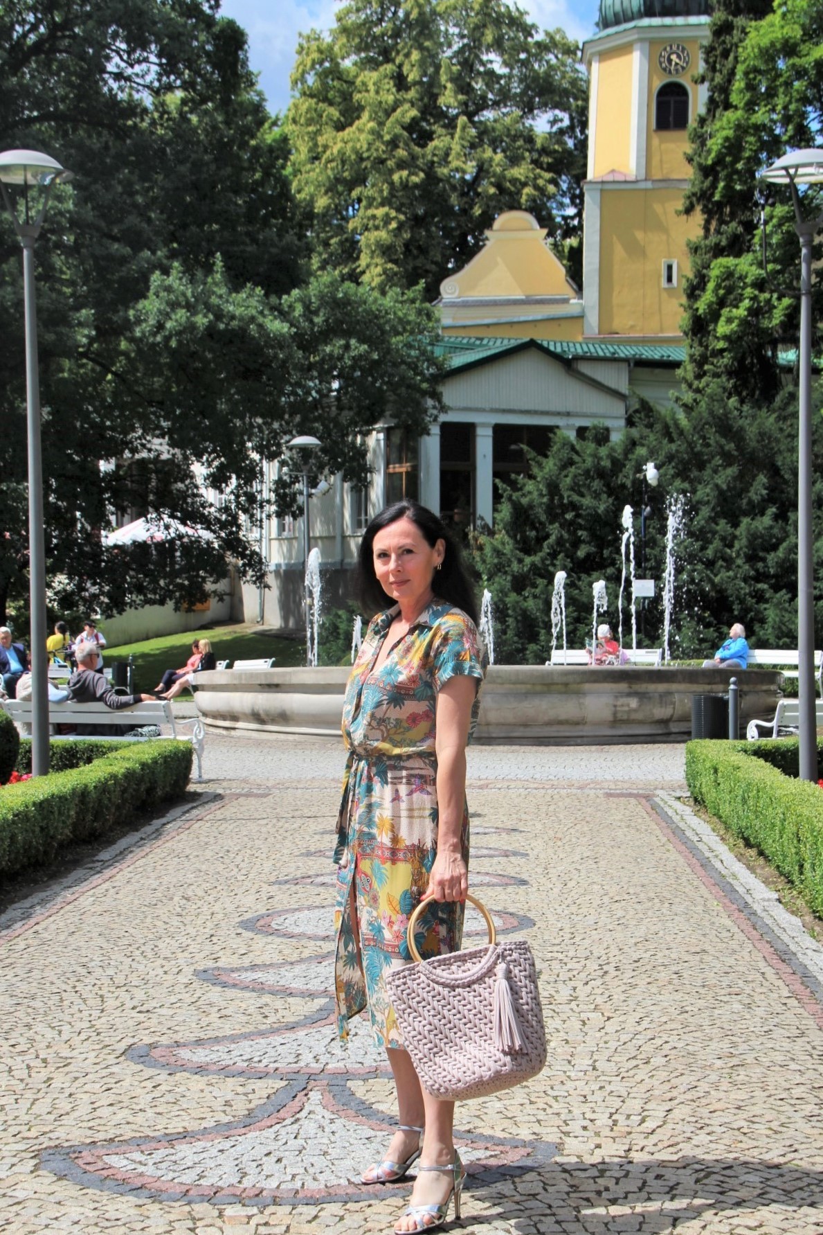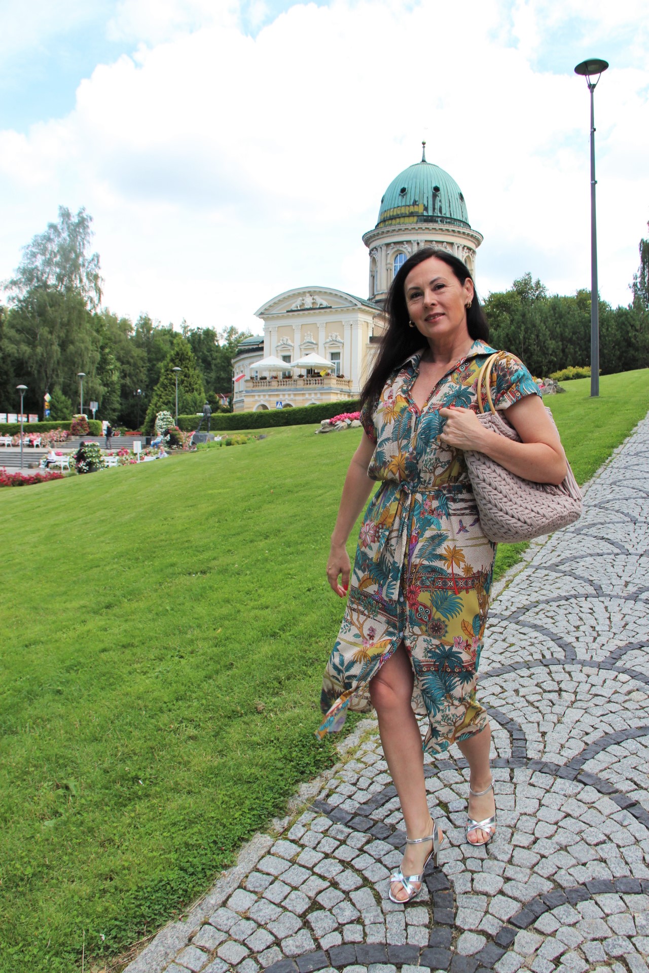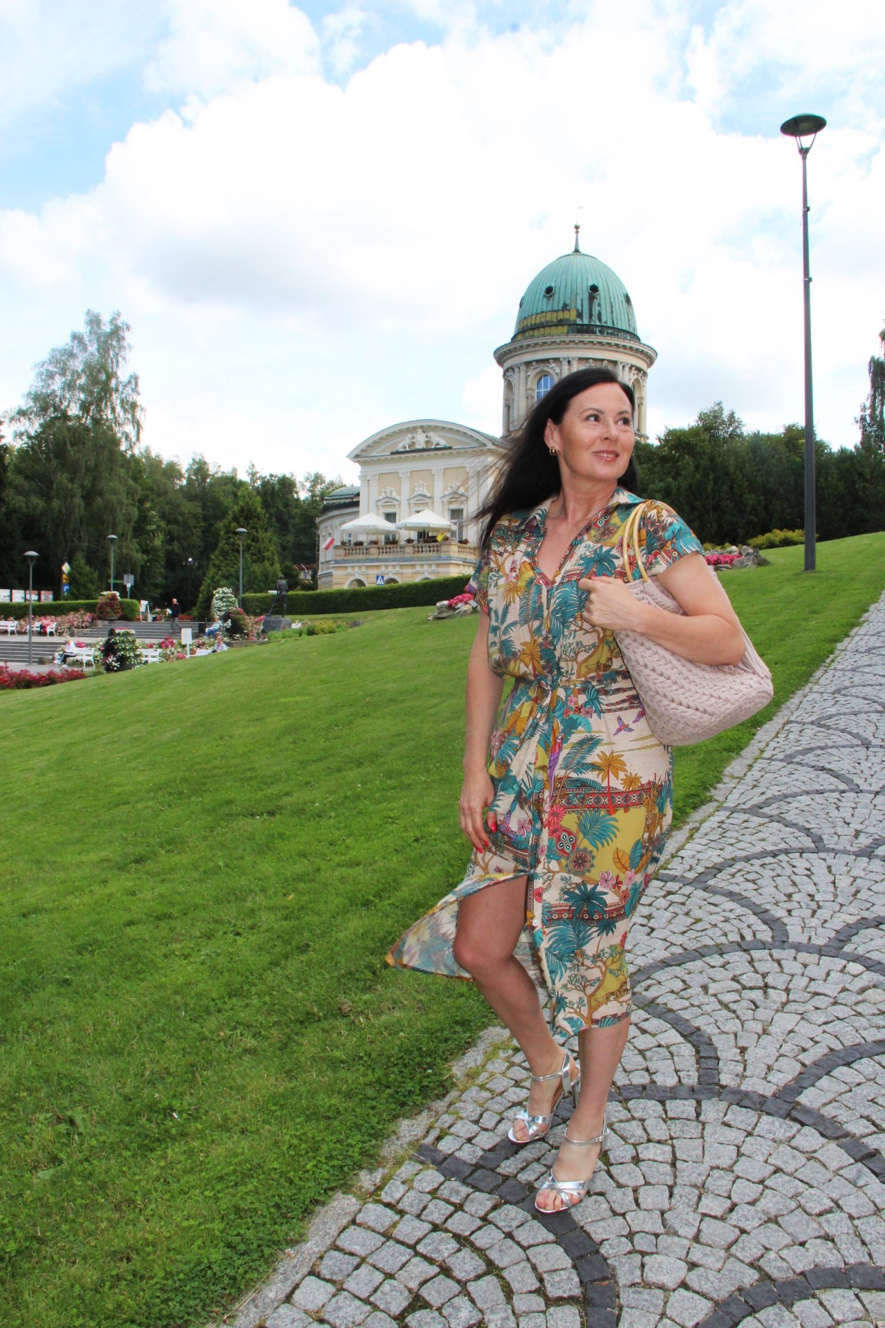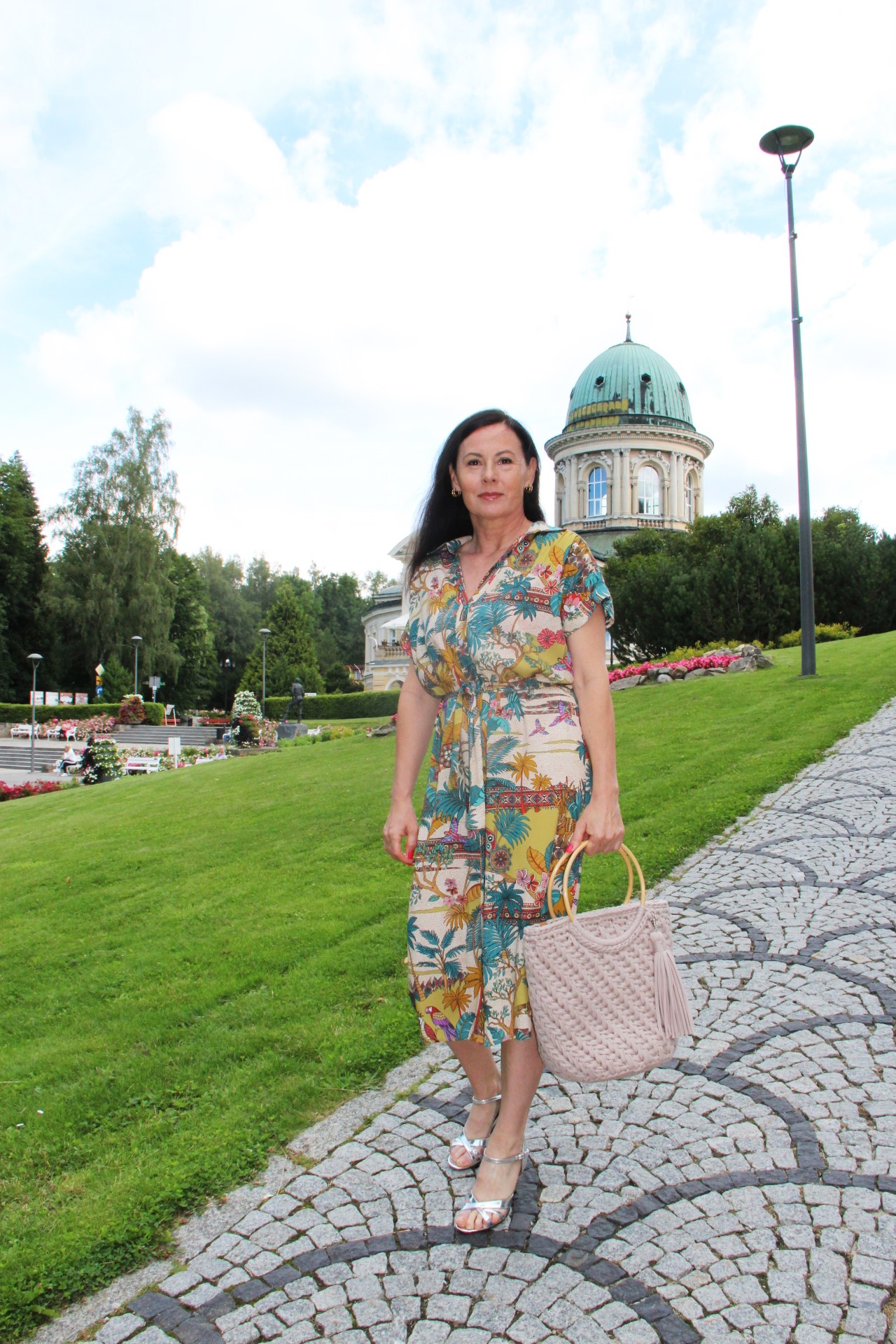 Kolorowy print w delikatnych, modnych kolorach sprawia, że prosta na pozór sukienka wygląda bardzo atrakcyjnie . Do tak kolorowej sukienki z łatwością dobierzemy dodatki. Ja wybrałam bawełniany kosz w kolorze Ivory i srebrne sandały na obcasie. Stylizacja jest lekka i bardzo letnia.