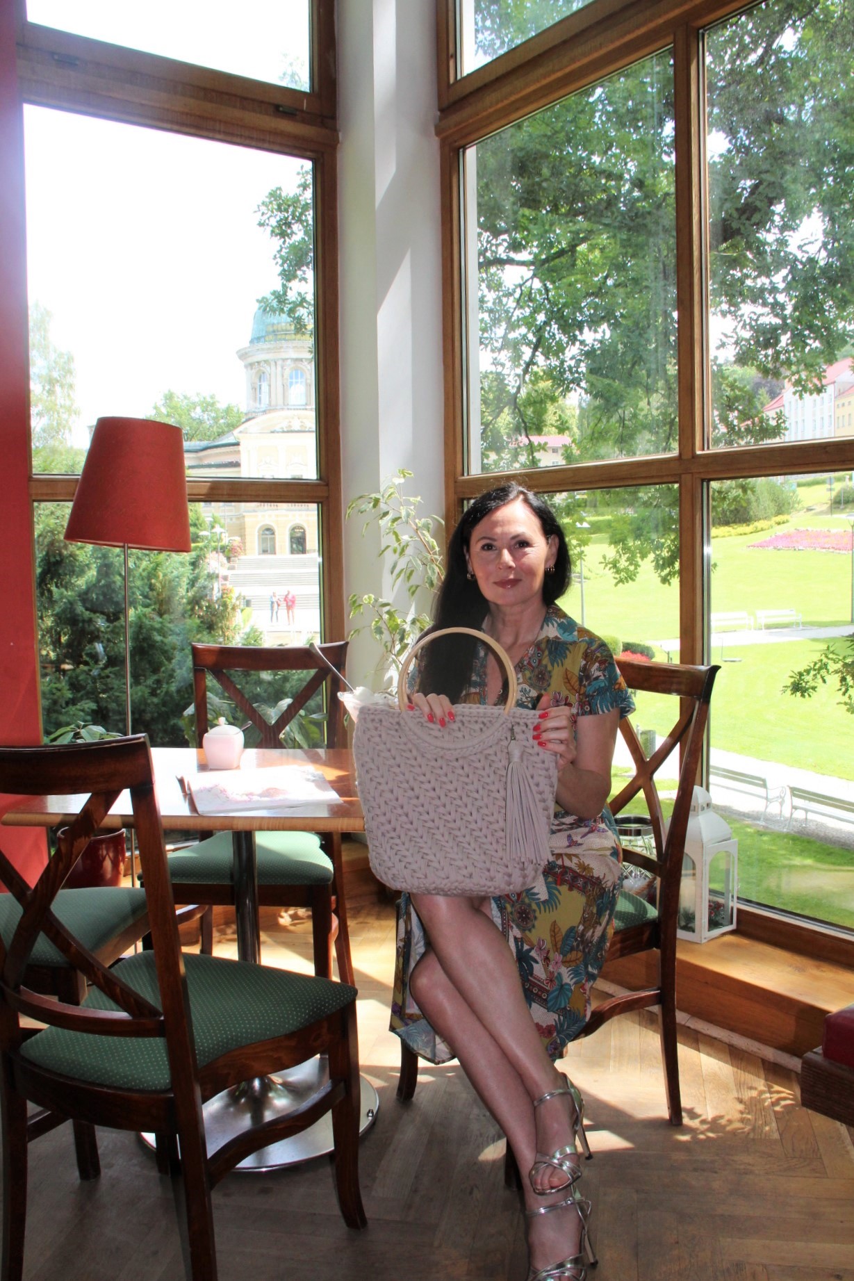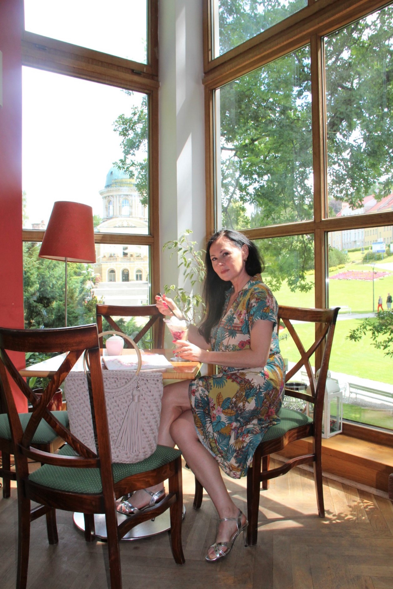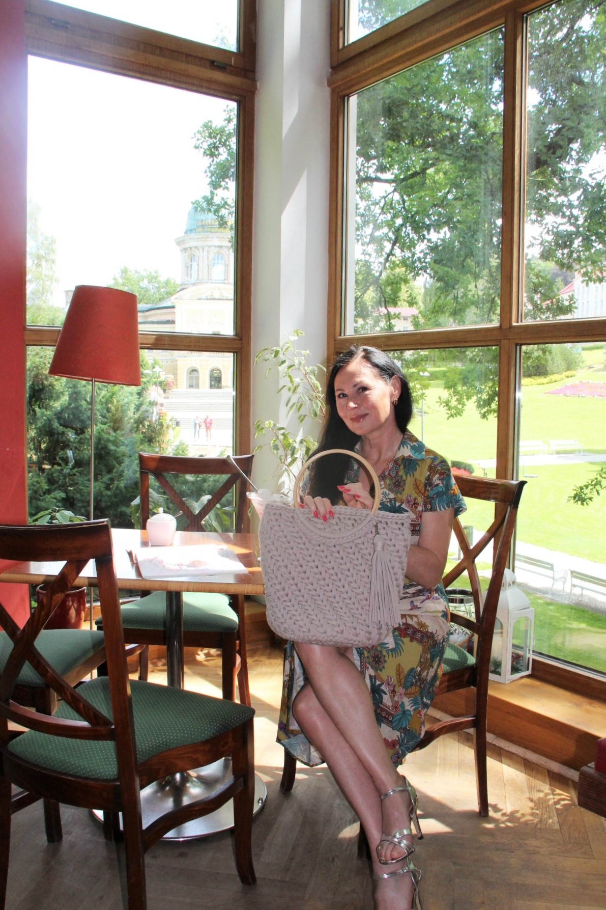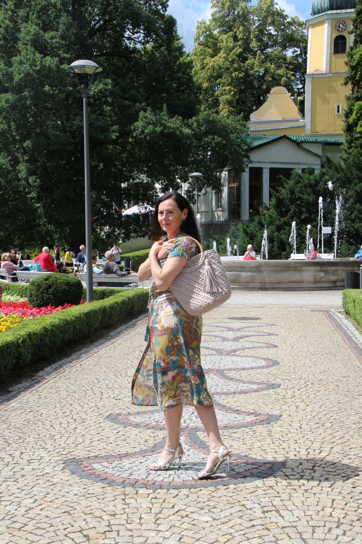 Kolorowy print w delikatnych, modnych kolorach sprawia, że prosta na pozór sukienka wygląda bardzo atrakcyjnie . Do tak kolorowej sukienki z łatwością dobierzemy dodatki. Ja wybrałam bawełniany kosz w kolorze Ivory i srebrne sandały na obcasie. Stylizacja jest lekka i bardzo letnia.