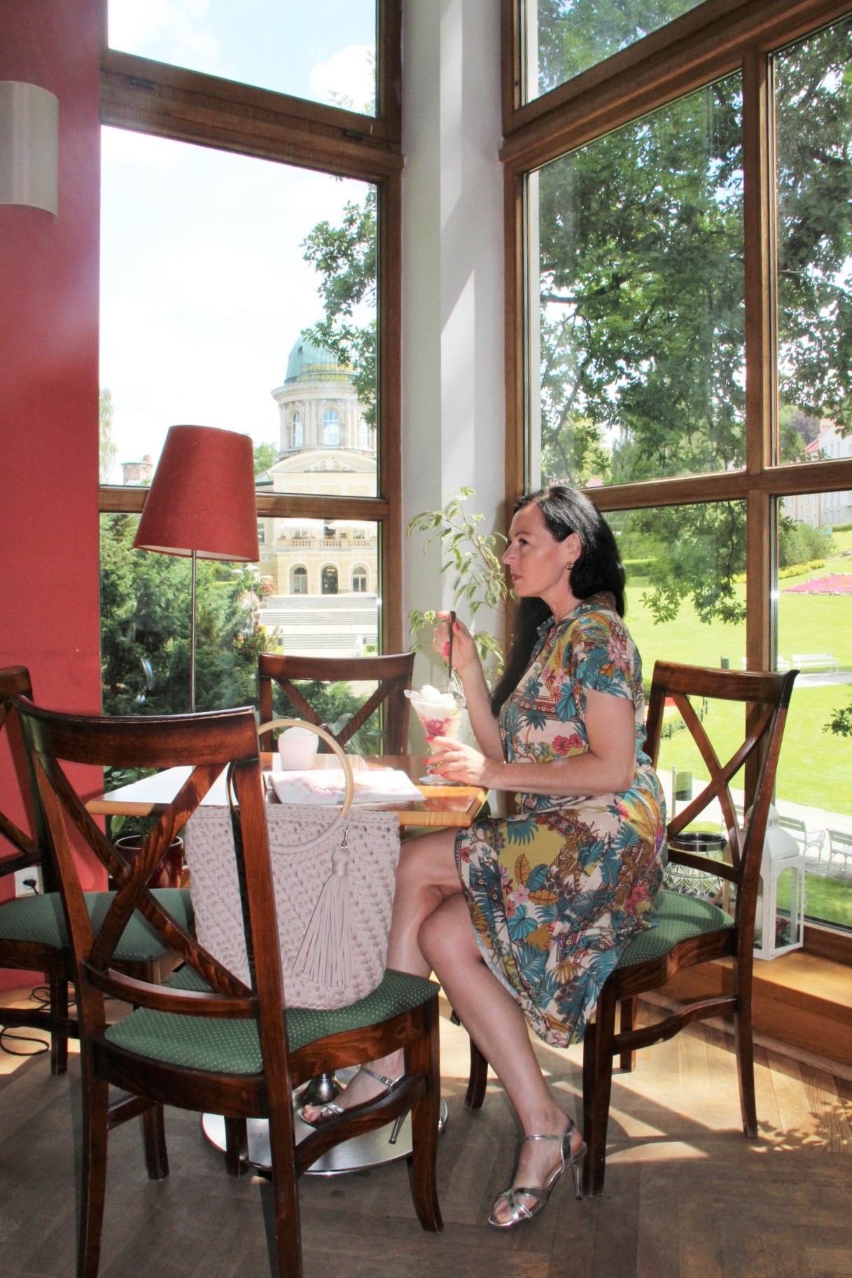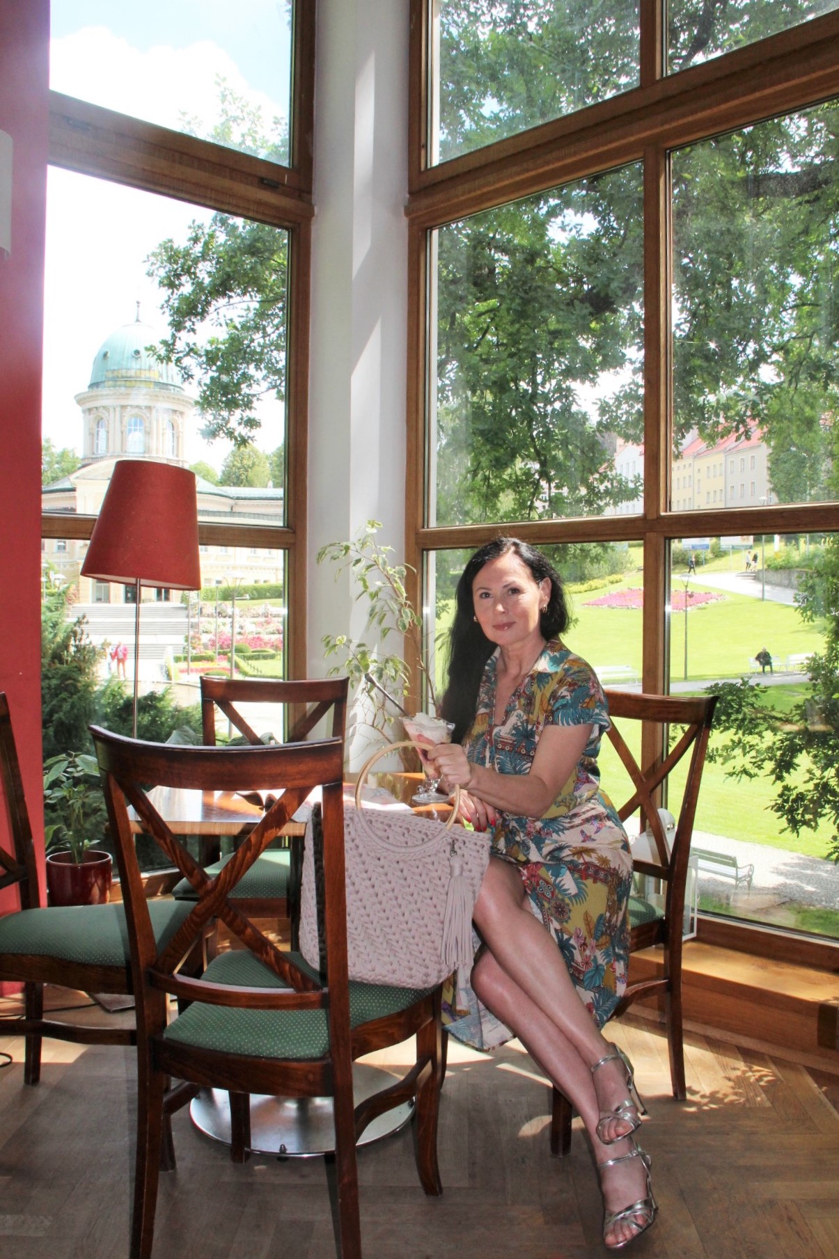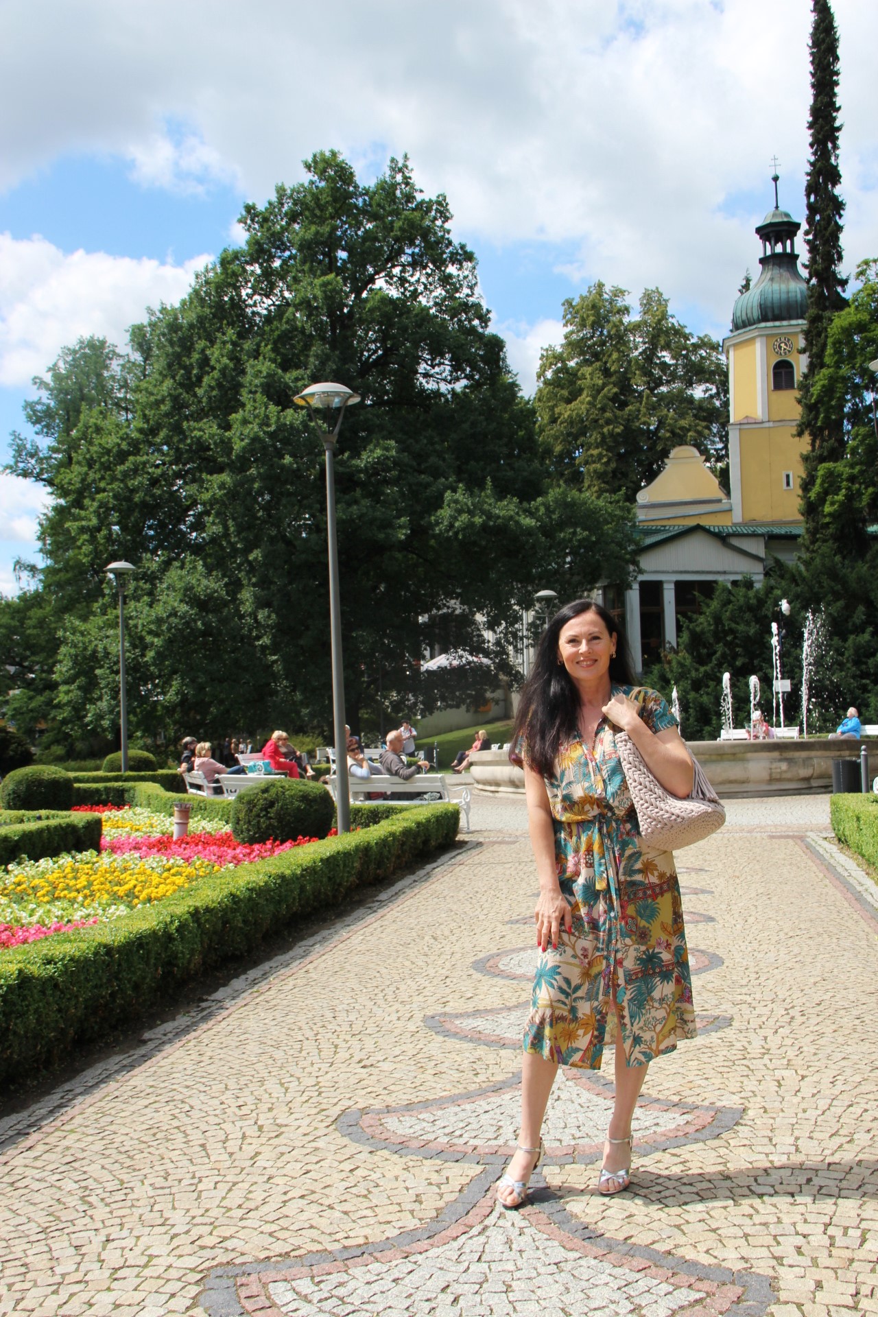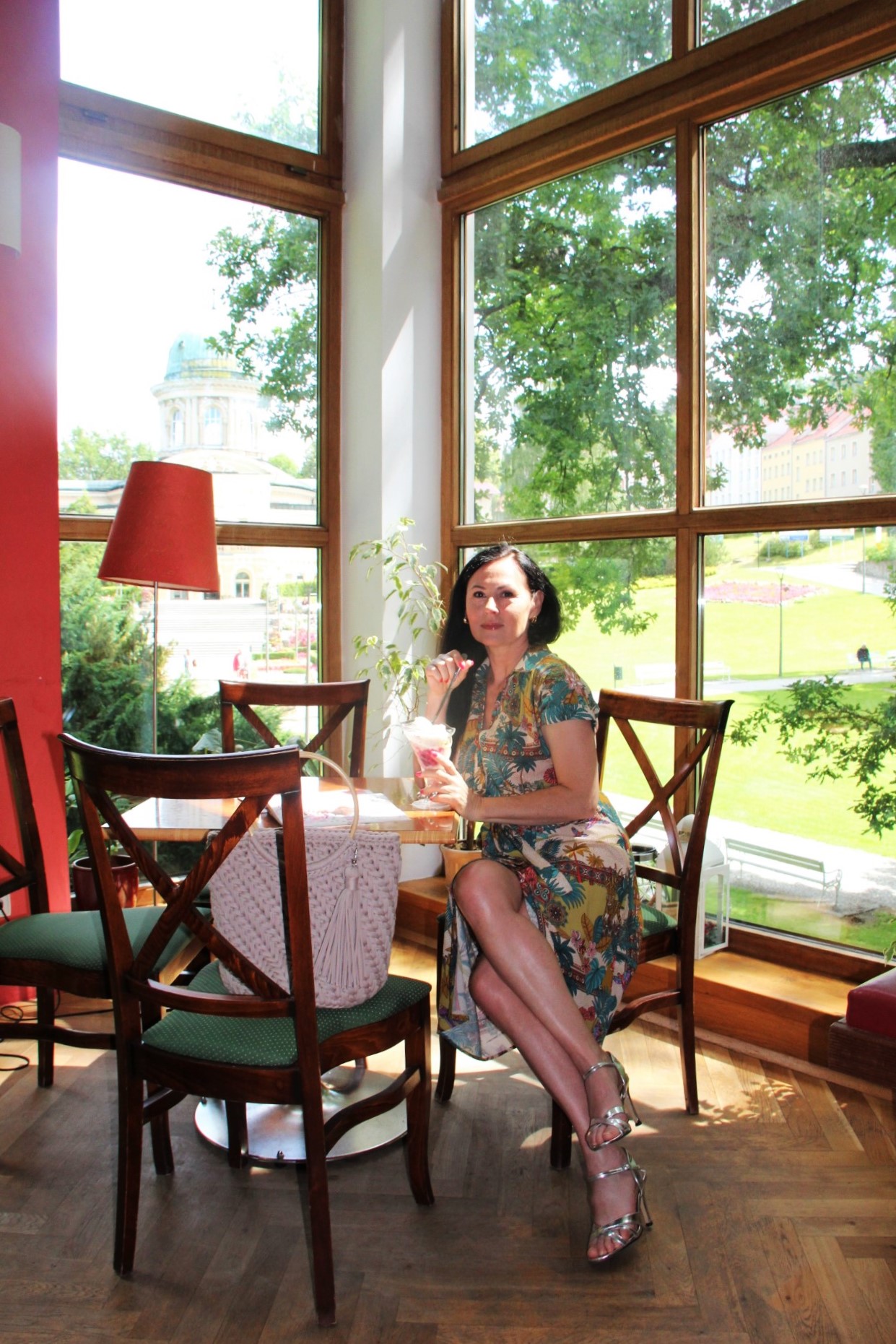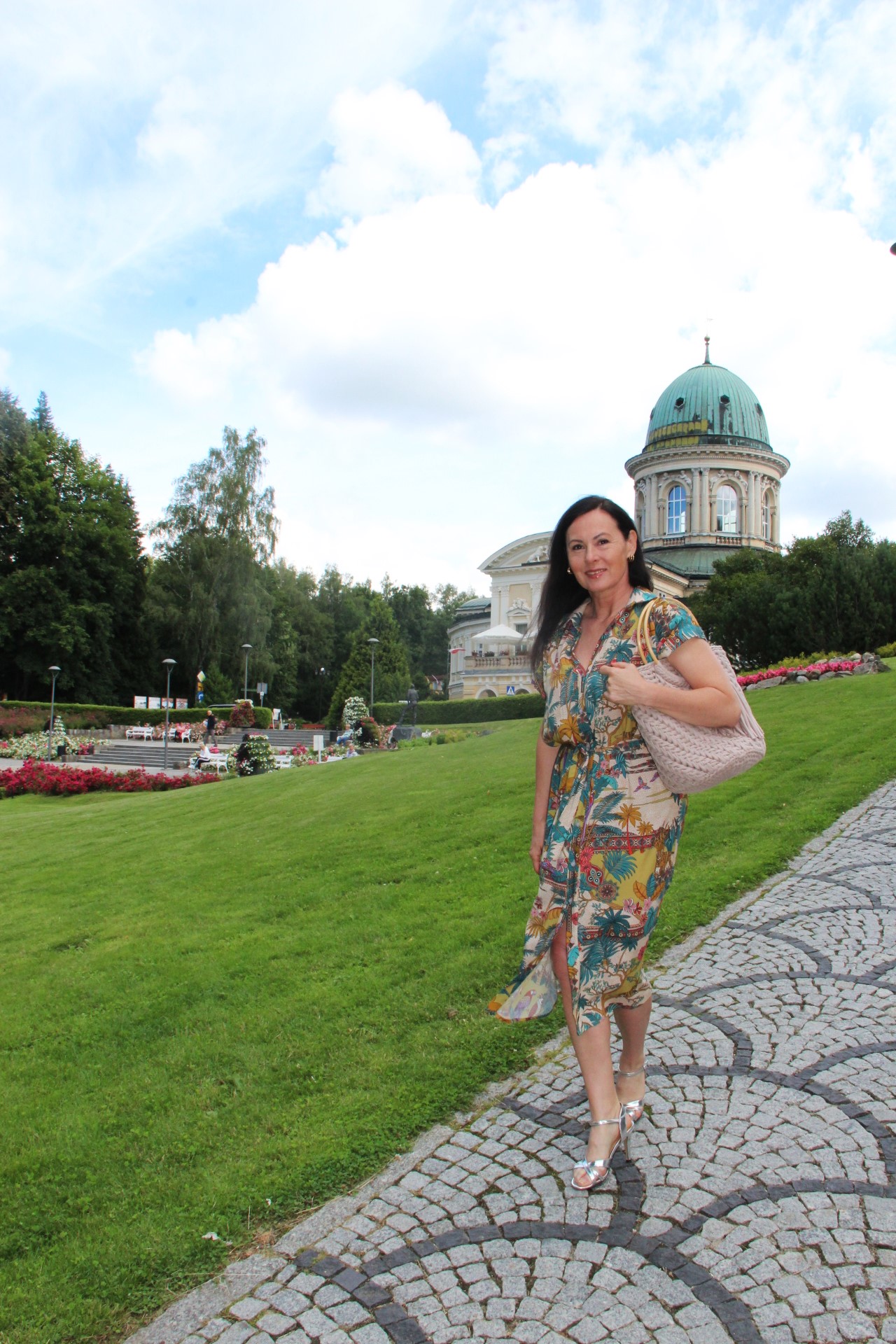 Kolorowy print w delikatnych, modnych kolorach sprawia, że prosta na pozór sukienka wygląda bardzo atrakcyjnie . Do tak kolorowej sukienki z łatwością dobierzemy dodatki. Ja wybrałam bawełniany kosz w kolorze Ivory i srebrne sandały na obcasie. Stylizacja jest lekka i bardzo letnia.