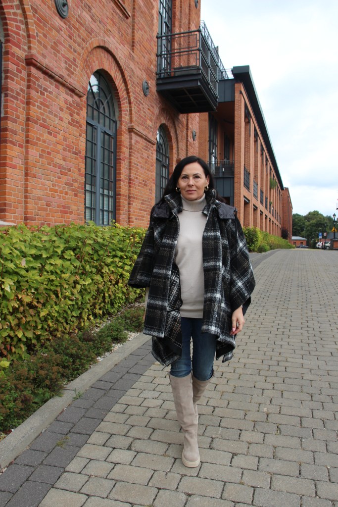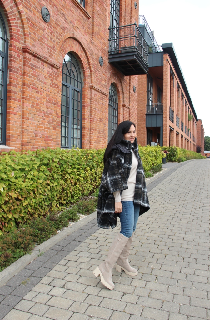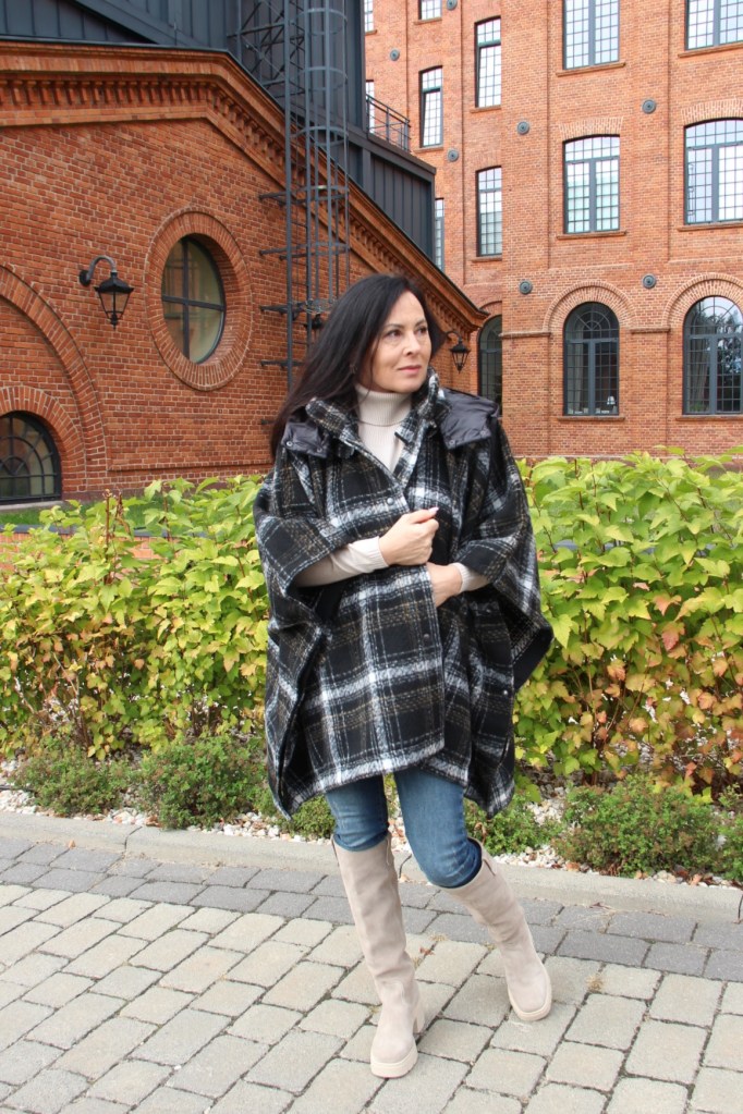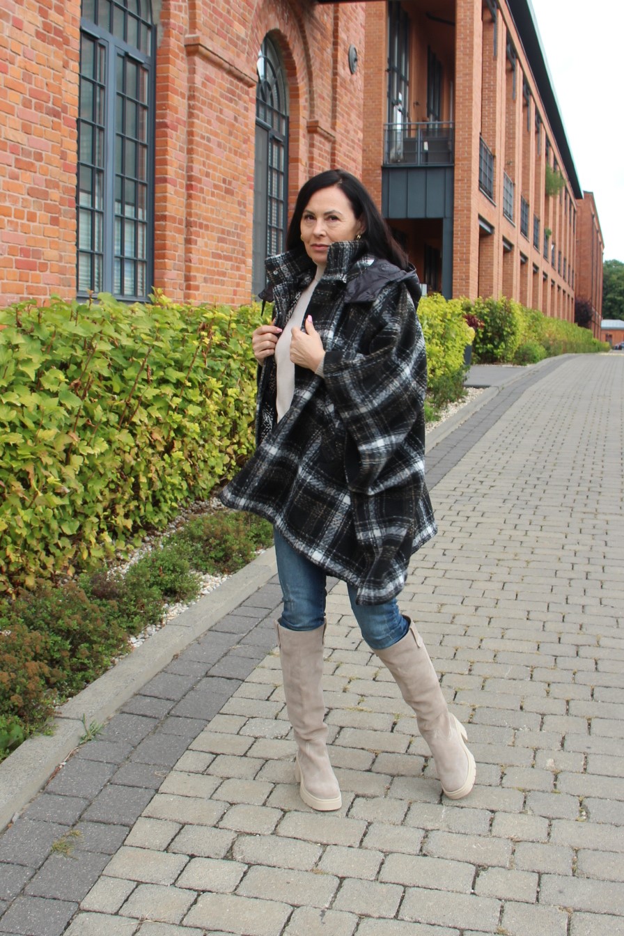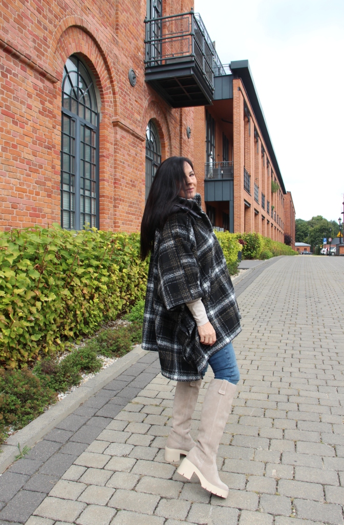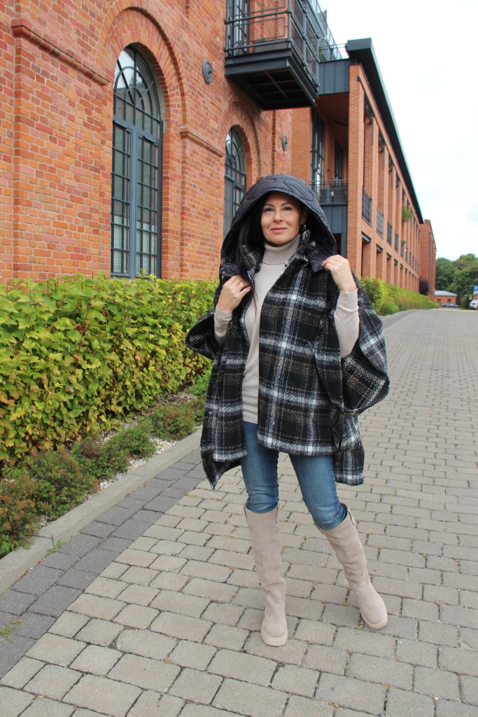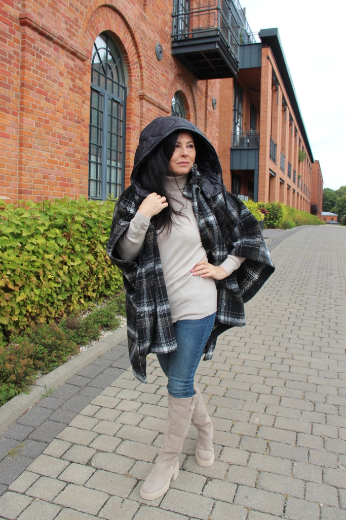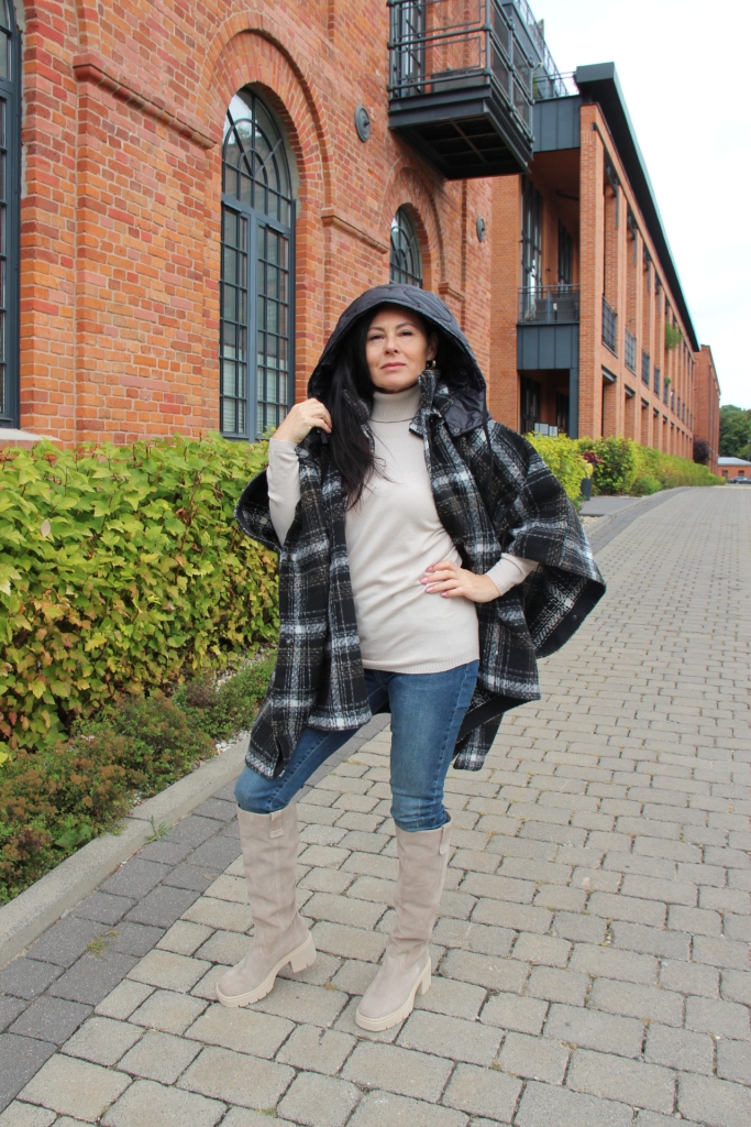 Poncho, wygląda bardzo szykownie i jest dużą konkurencją dla płaszcza. Jego przewaga to funkcjonalność i wygoda. Jeśli lubisz ubierać się na cebulkę, to masz gwarancję, że zmieścisz pod nie gruby sweter lub ramoneskę czy pikowaną kurtkę. Mój wybór, to oczywiście model w kratę, która jest moim ulubionym printem na tę jesień. Poncho ma zatrzaski na bokach, dzięki czemu bardziej otula, a pikowany kaptur, który można odpiąć dodaje sportowego charakteru. Włożyłam pod nie dzianinową bluzkę z golfem i jeansy. Całą stylizację rozjaśniłam dobierając buty, podobnie jak i bluzkę w kolorze jasnego beżu, który jest teraz szalenie modny.