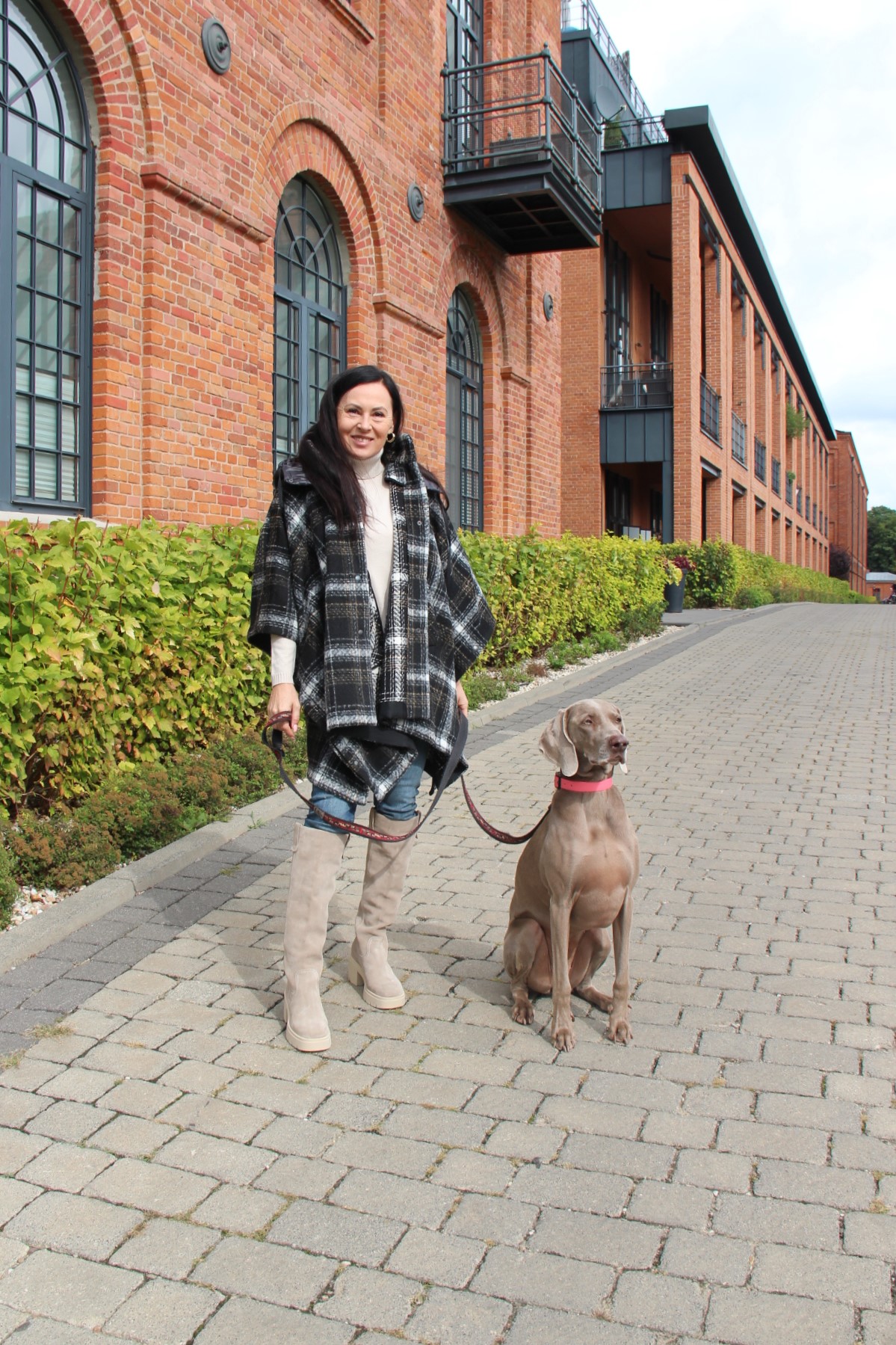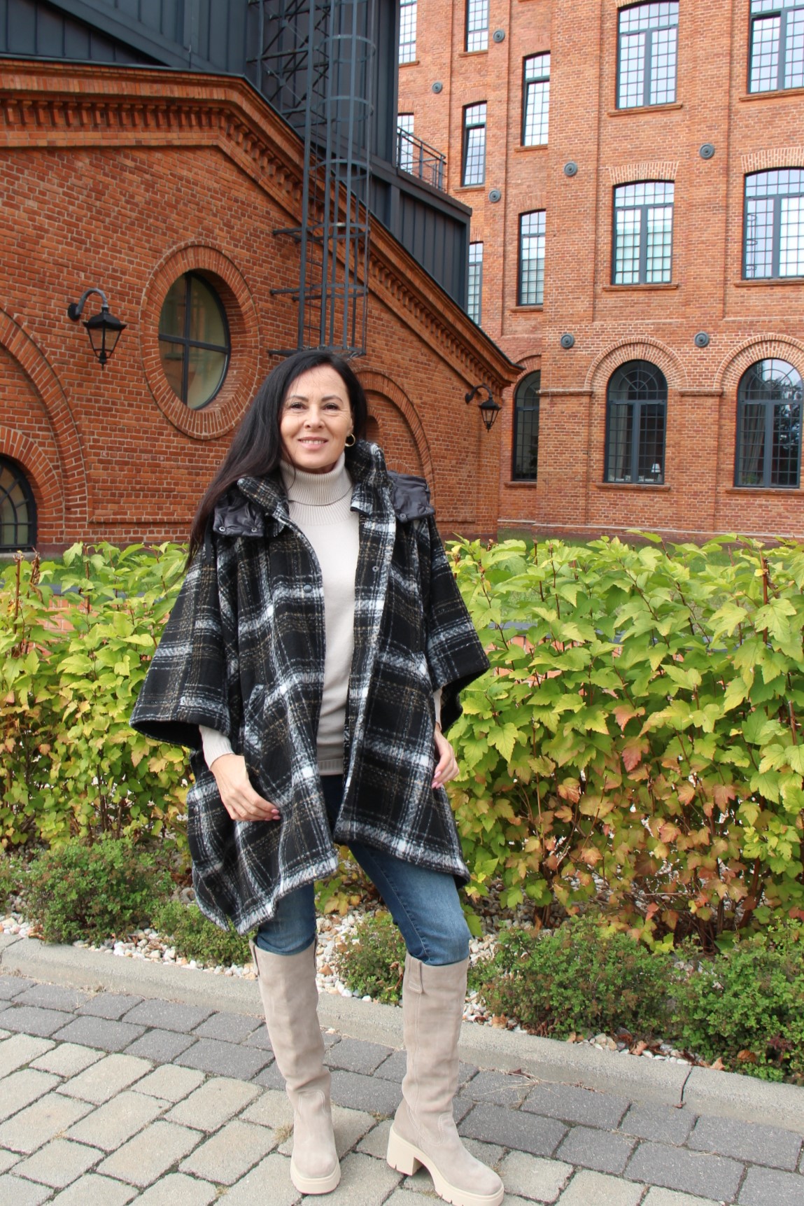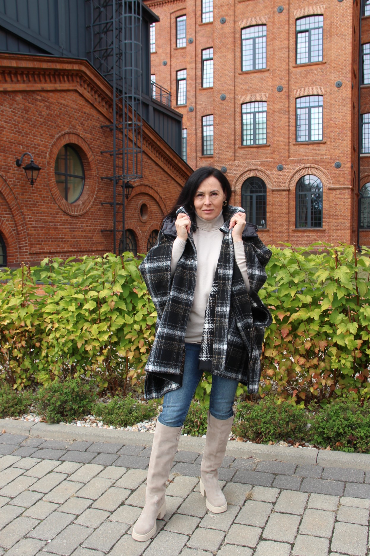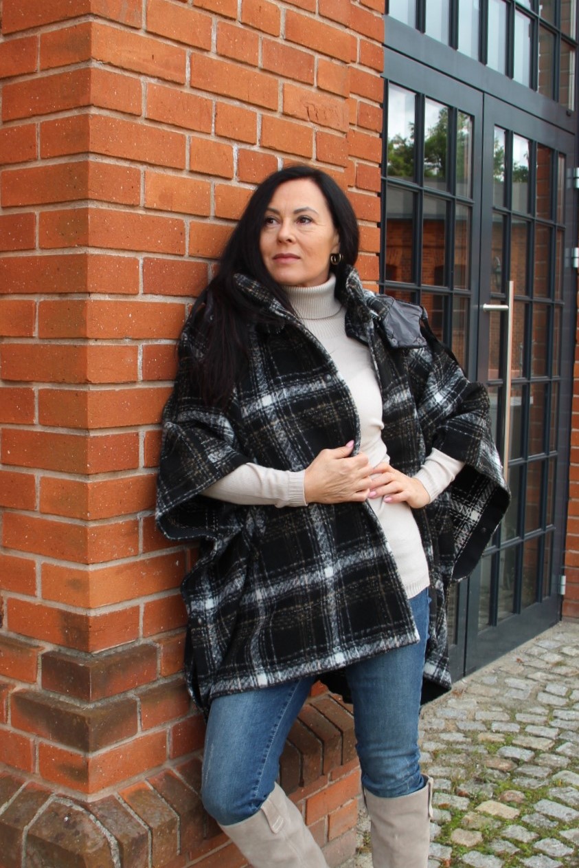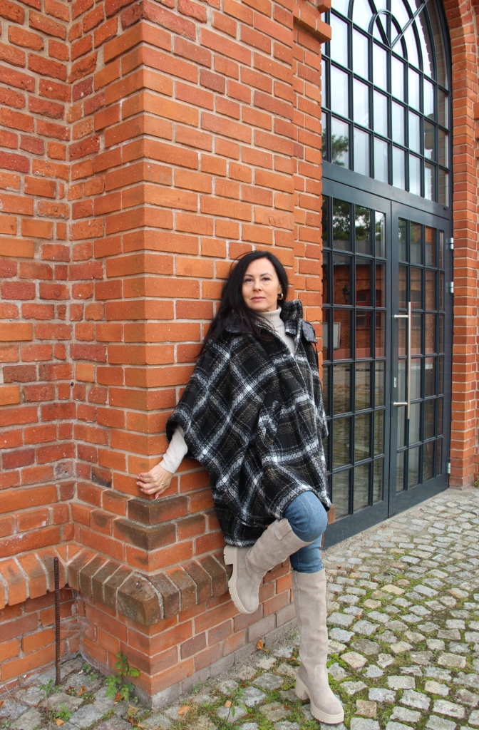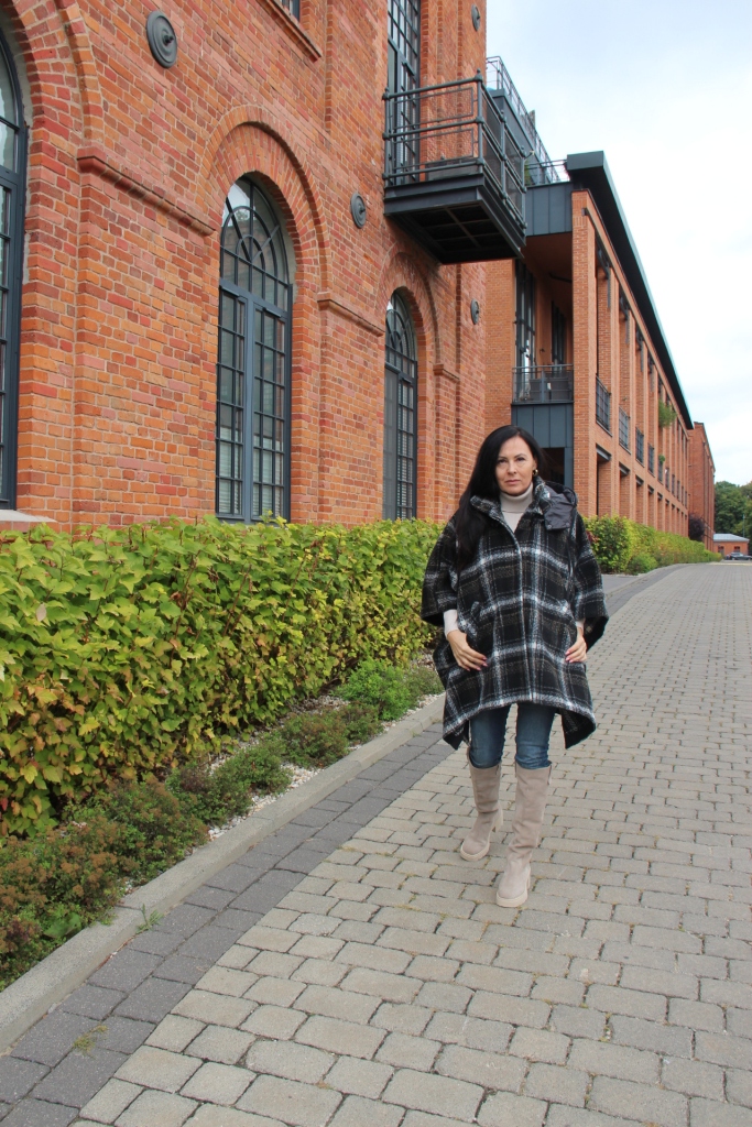 Poncho, wygląda bardzo szykownie i jest dużą konkurencją dla płaszcza. Jego przewaga to funkcjonalność i wygoda. Jeśli lubisz ubierać się na cebulkę, to masz gwarancję, że zmieścisz pod nie gruby sweter lub ramoneskę czy pikowaną kurtkę. Mój wybór, to oczywiście model w kratę, która jest moim ulubionym printem na tę jesień. Poncho ma zatrzaski na bokach, dzięki czemu bardziej otula, a pikowany kaptur, który można odpiąć dodaje sportowego charakteru. Włożyłam pod nie dzianinową bluzkę z golfem i jeansy. Całą stylizację rozjaśniłam dobierając buty, podobnie jak i bluzkę w kolorze jasnego beżu, który jest teraz szalenie modny.