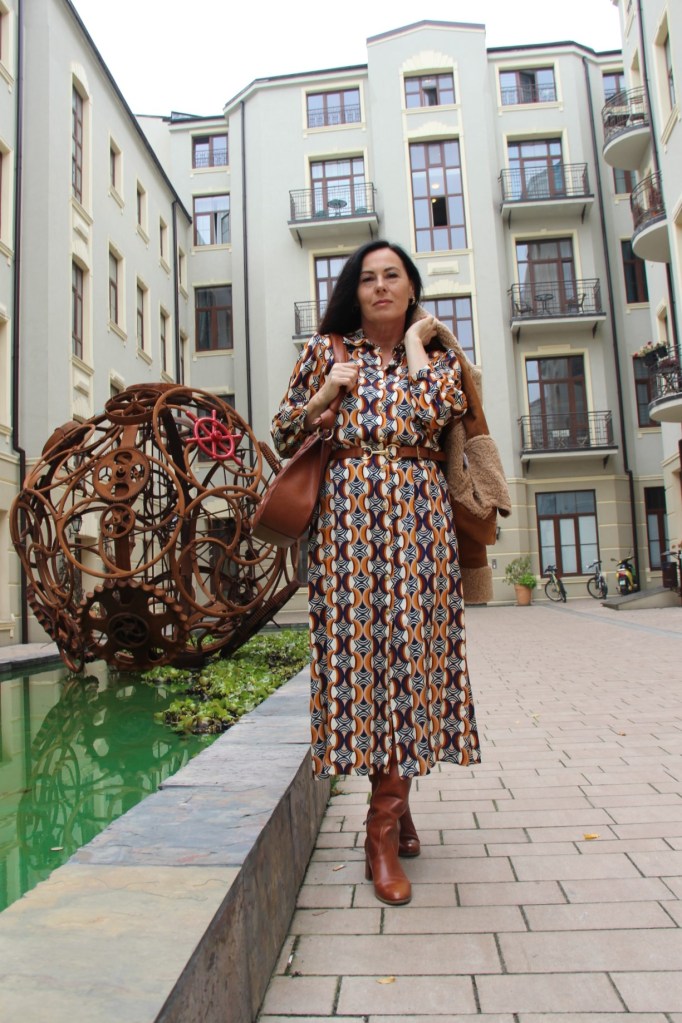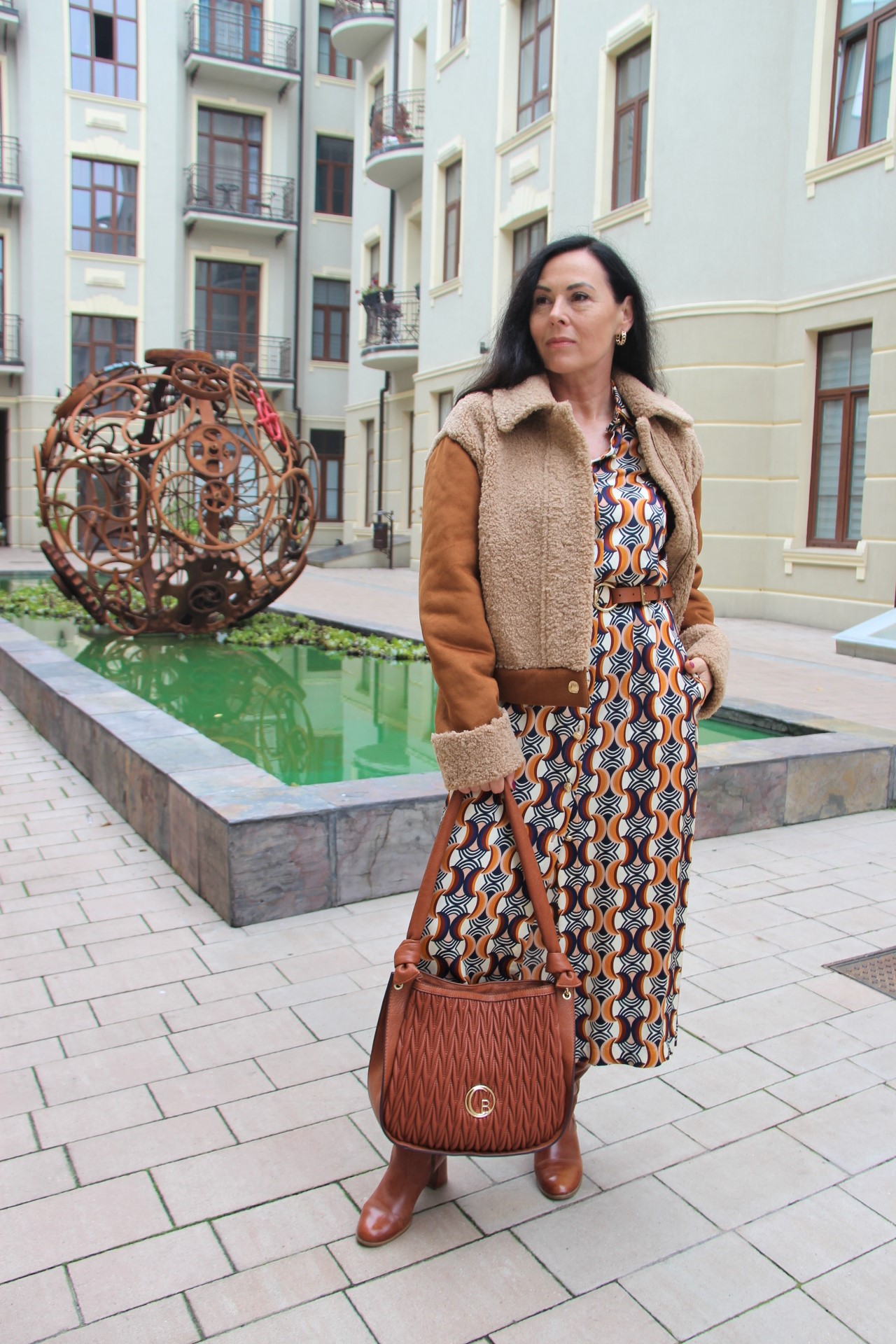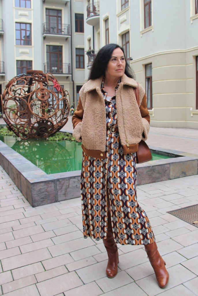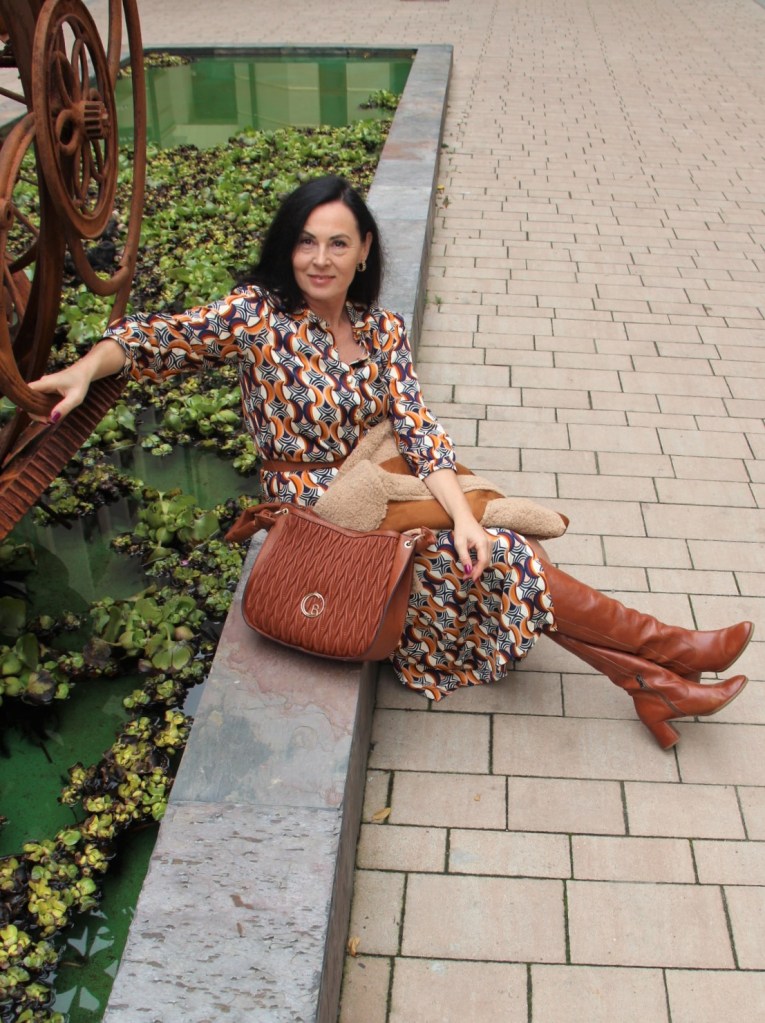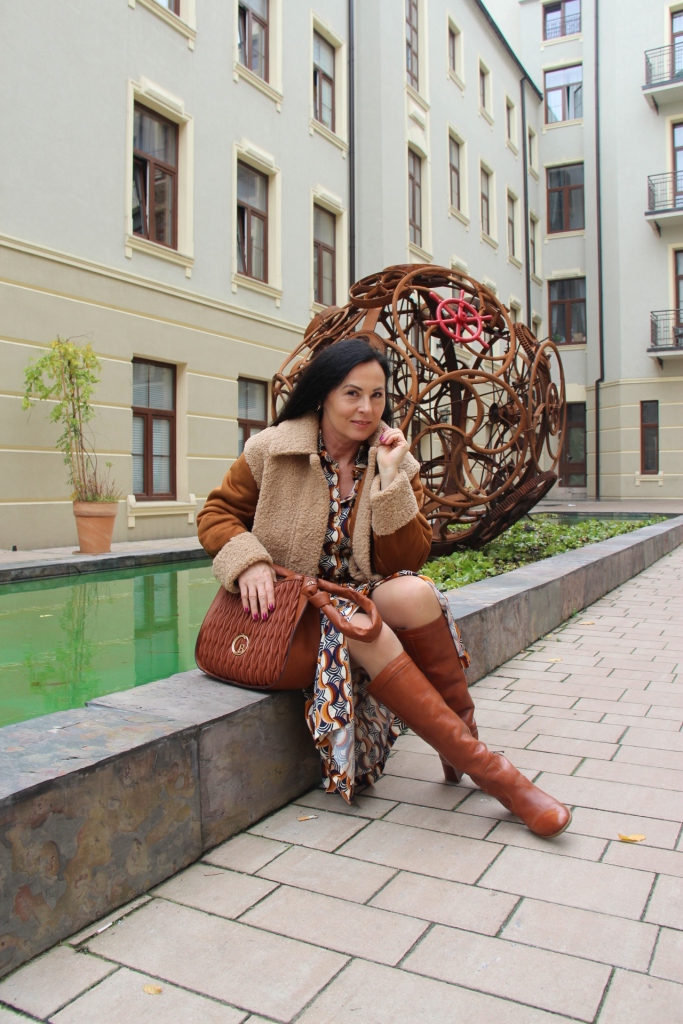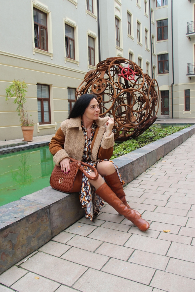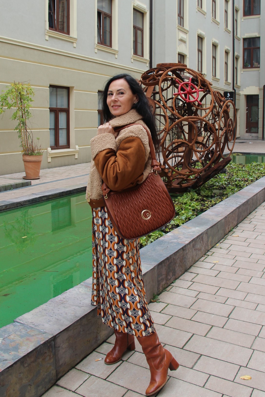 W pilotce zawsze wygląda się stylowo. Ten model kurtki, to mix krótkiego kożuszka i ramoneski. Można ją nosić z jeansami i z sukienką. Dziś włożyłam ją na kolorową szmizjerkę. Kozaki, torbę i pasek wybrałam w kolorze kurtki. Z biżuterii wybrałam jedynie złote kolczyki.