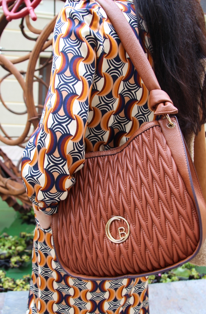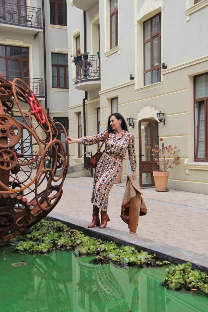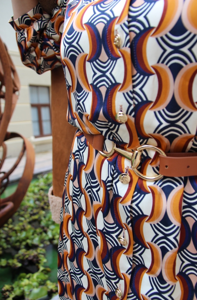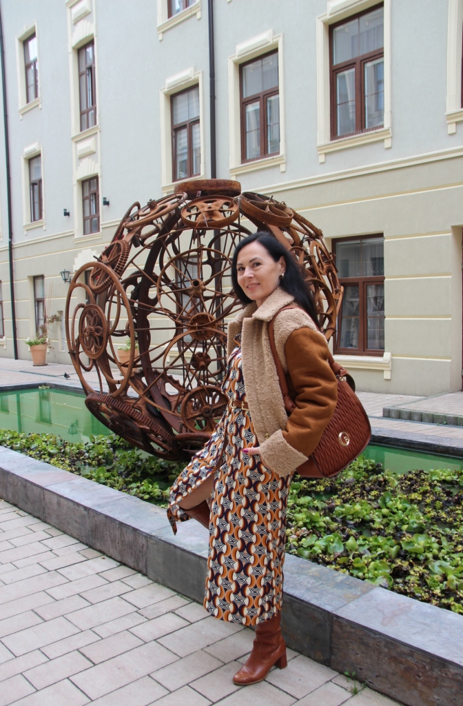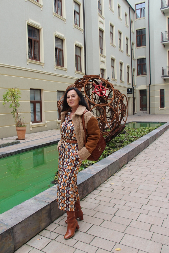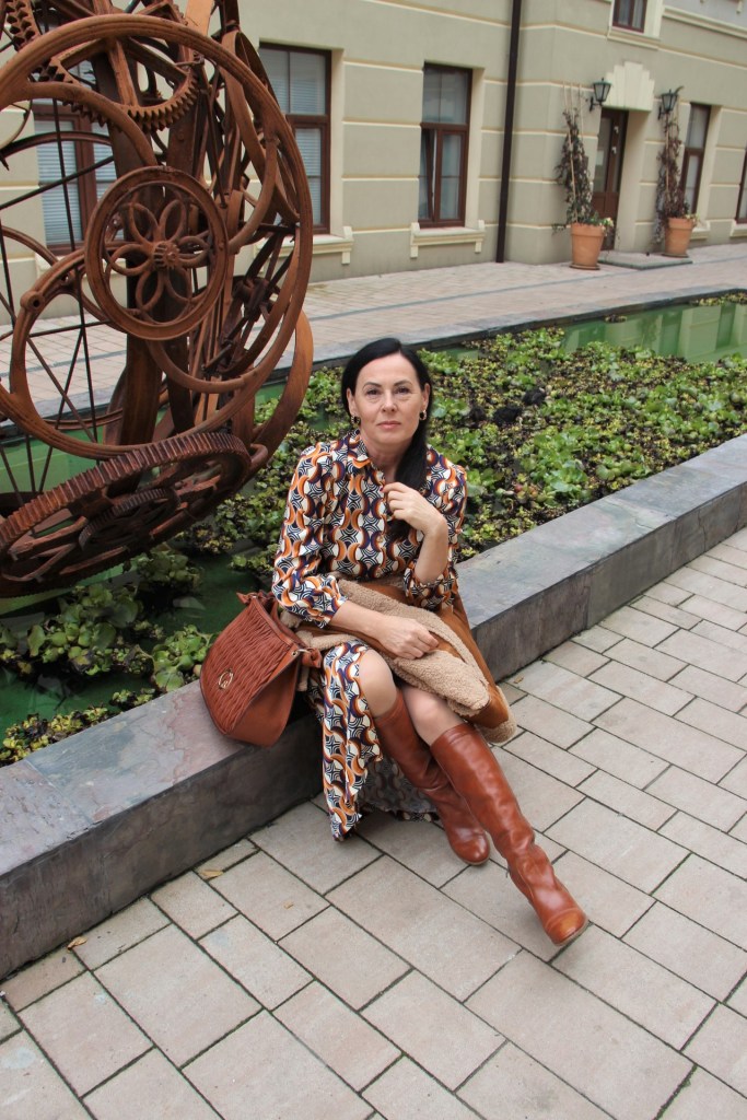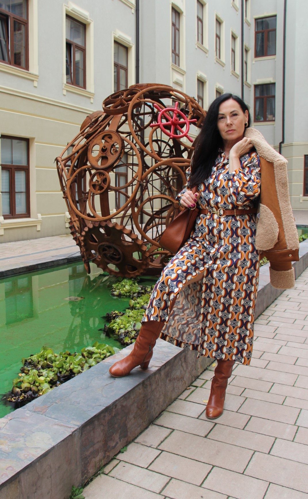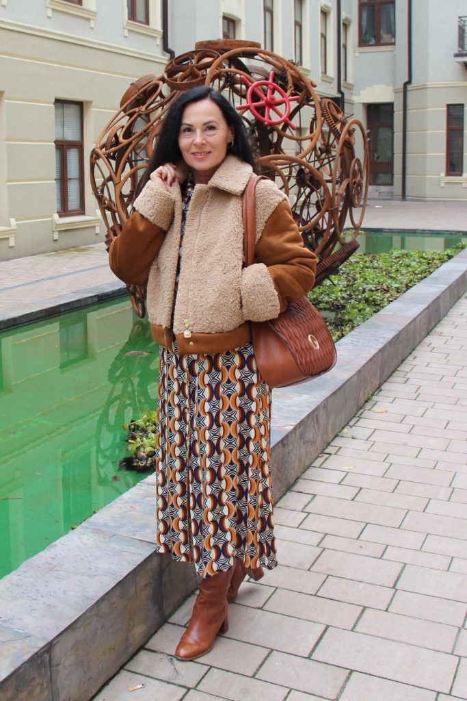 W pilotce zawsze wygląda się stylowo. Ten model kurtki, to mix krótkiego kożuszka i ramoneski. Można ją nosić z jeansami i z sukienką. Dziś włożyłam ją na kolorową szmizjerkę. Kozaki, torbę i pasek wybrałam w kolorze kurtki. Z biżuterii wybrałam jedynie złote kolczyki.