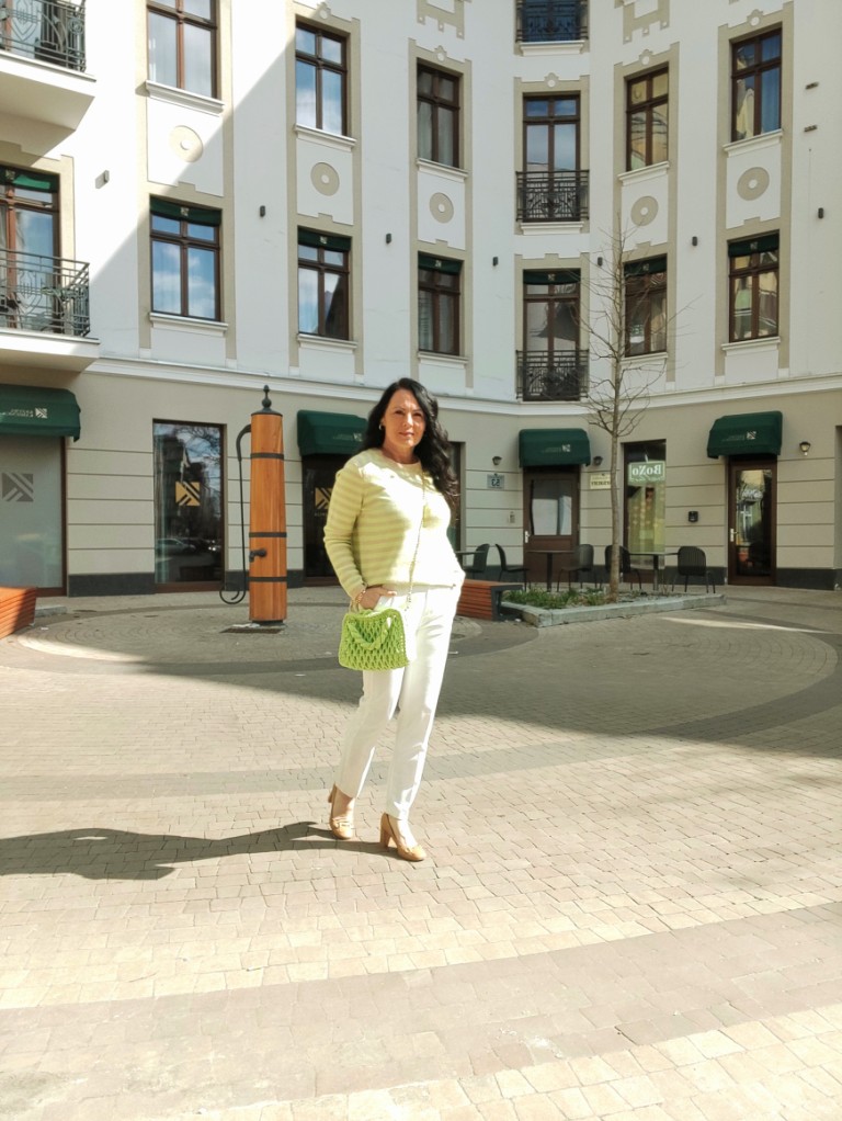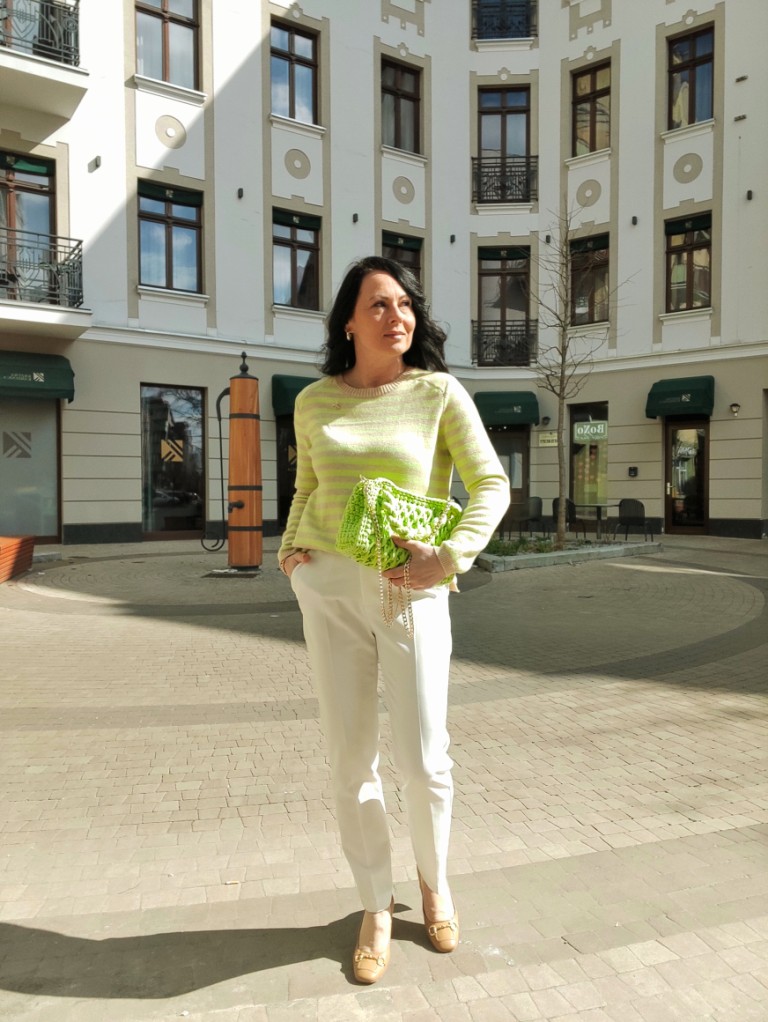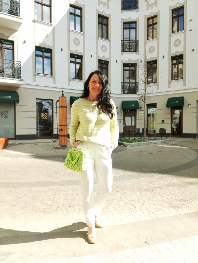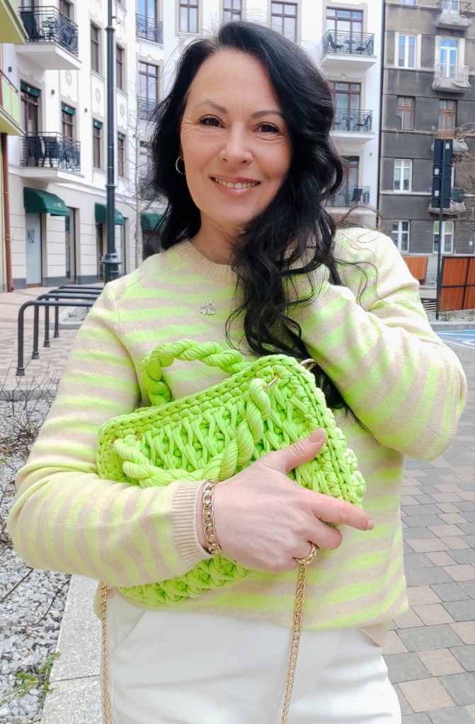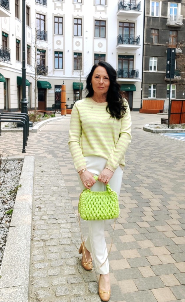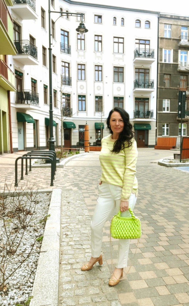 Limonkowa zieleń, to kolor świeżości, dlatego tak chętnie po nią sięgamy w sezonie wiosenno-letnim. Śmiało można powiedzieć, że nie ustępuje pola, nawet tak modnym kolorom jak magenta. Najpiękniej wygląda w stylizacji total-look, ja natomiast połączyłam ją z ponadczasowymi kolorami, takimi jak biel i jasny camel. Mój outfit to, sweter w paski i białe spodnie, jednak gwiazdą stylizacji, jest najnowszy model torebki Puna, która u mnie na blogu ma swoją premierę :). Lada chwila będzie ją można zamawiać na stronie Pleciuga.handmade. Na uwagę zasługują także, czółenka Capri, wykonane z licowej skóry. Mają wygodny, klockowy obcas, nosek karo i zdobione są złotą klamerką w kształcie wędzidła.