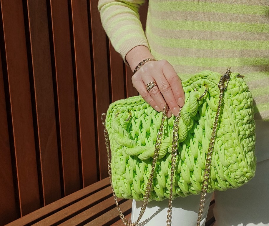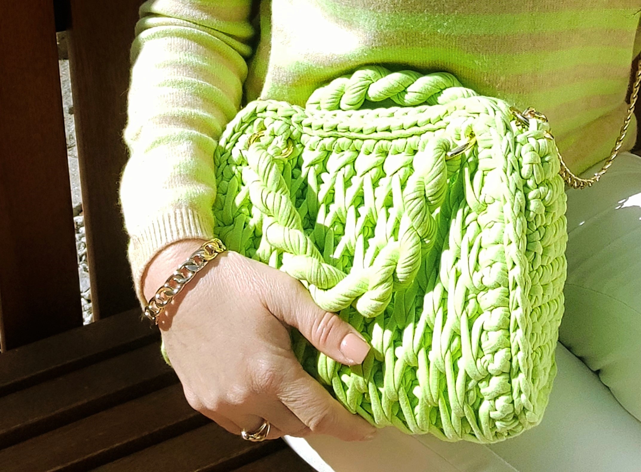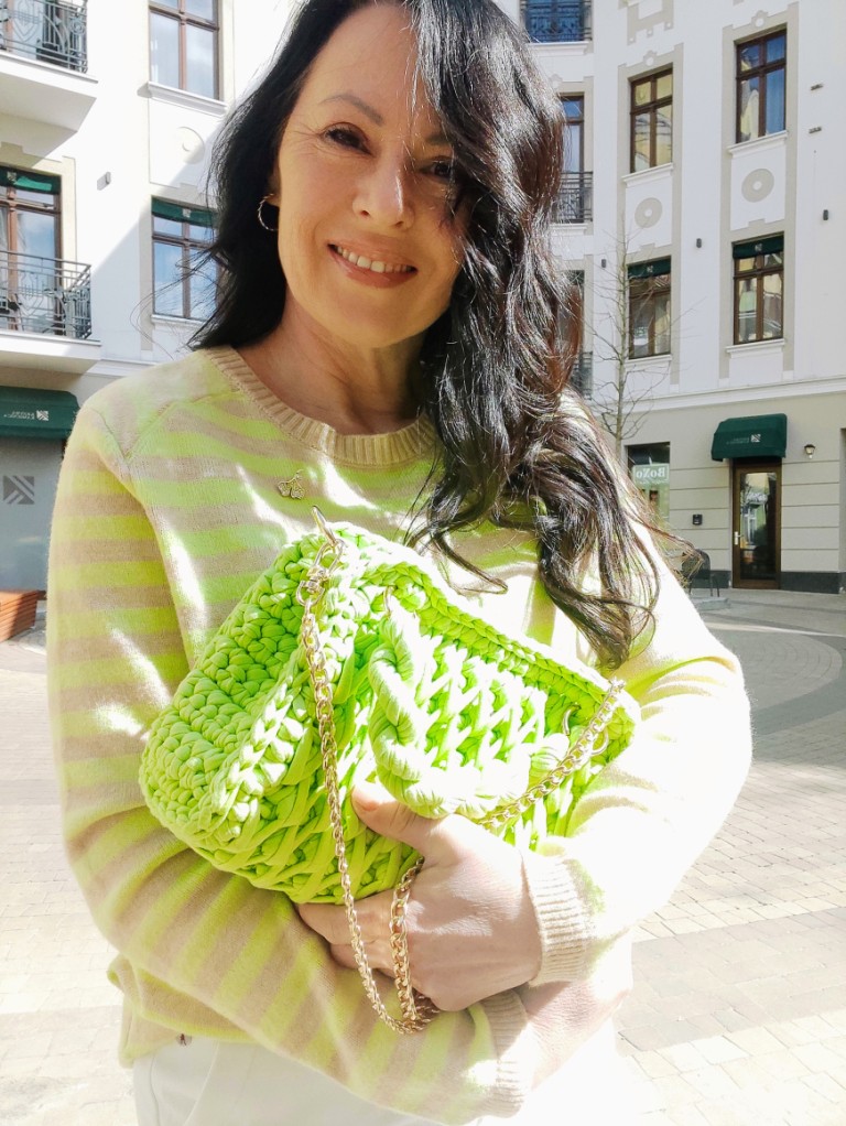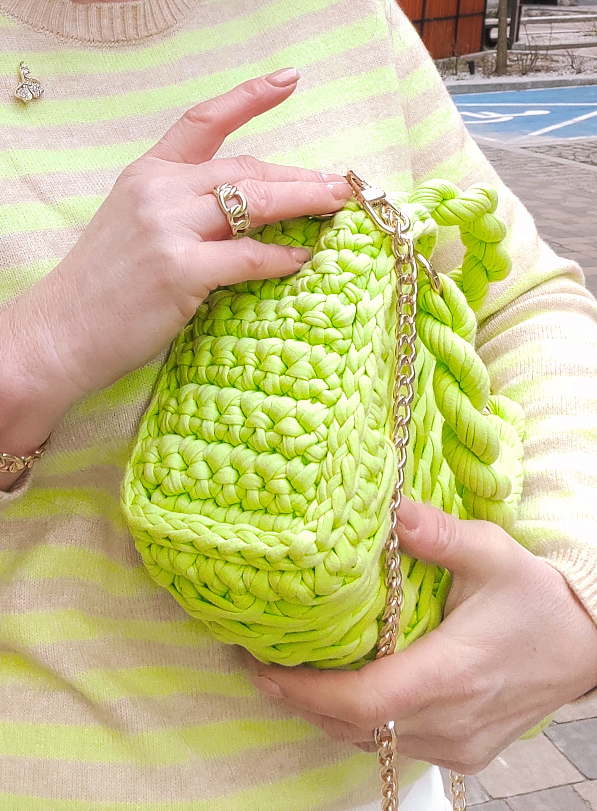 Limonkowa zieleń, to kolor świeżości, dlatego tak chętnie po nią sięgamy w sezonie wiosenno-letnim. Śmiało można powiedzieć, że nie ustępuje pola, nawet tak modnym kolorom jak magenta. Najpiękniej wygląda w stylizacji total-look, ja natomiast połączyłam ją z ponadczasowymi kolorami, takimi jak biel i jasny camel. Mój outfit to, sweter w paski i białe spodnie, jednak gwiazdą stylizacji, jest najnowszy model torebki Puna, która u mnie na blogu ma swoją premierę :). Lada chwila będzie ją można zamawiać na stronie Pleciuga.handmade. Na uwagę zasługują także, czółenka Capri, wykonane z licowej skóry. Mają wygodny, klockowy obcas, nosek karo i zdobione są złotą klamerką w kształcie wędzidła.