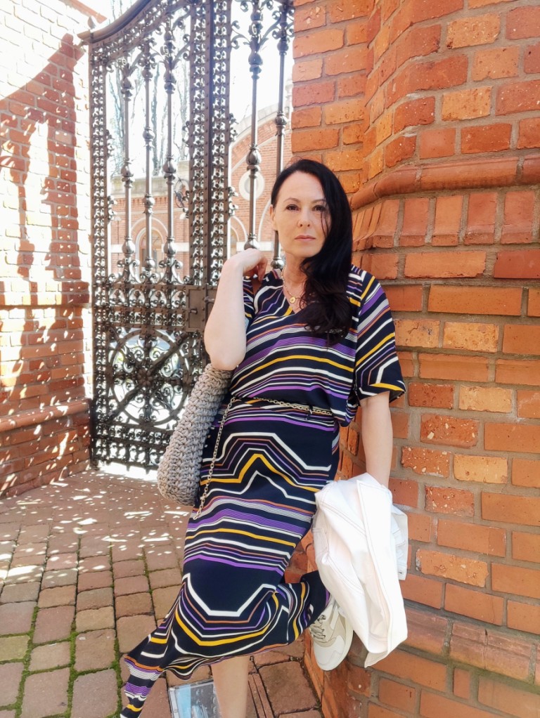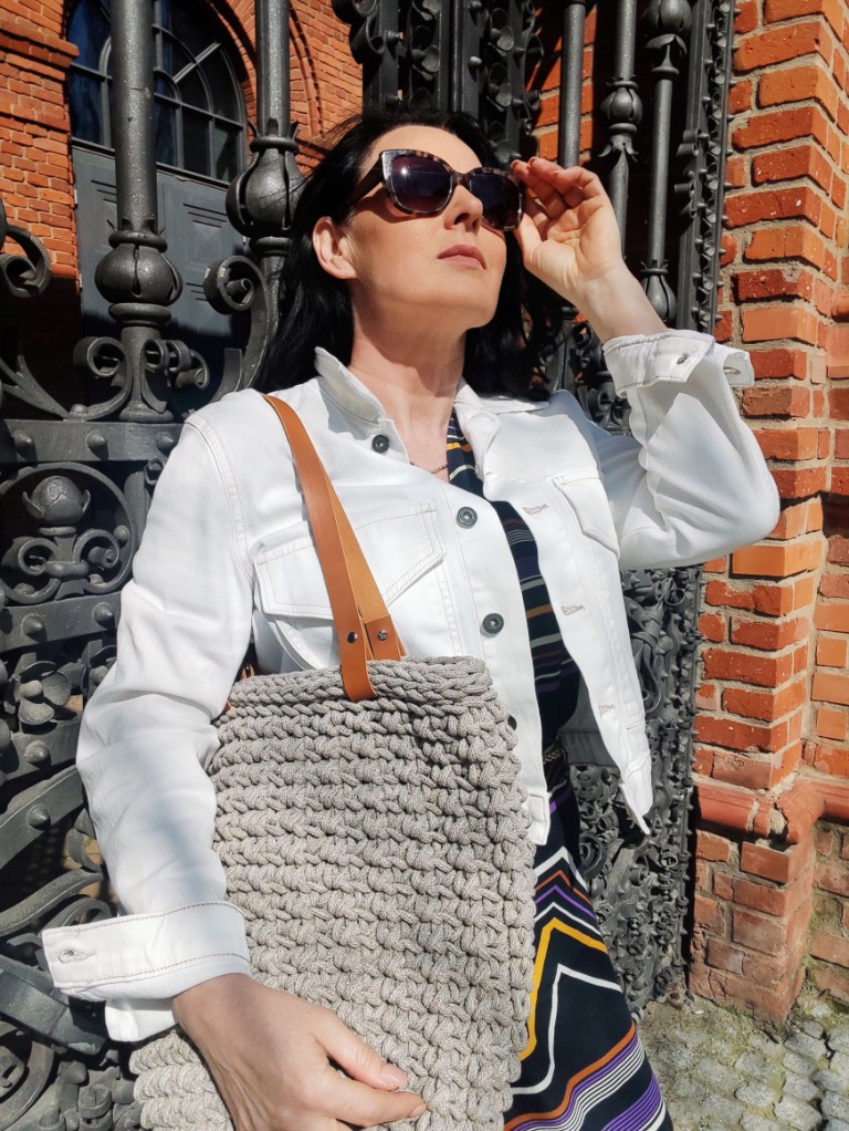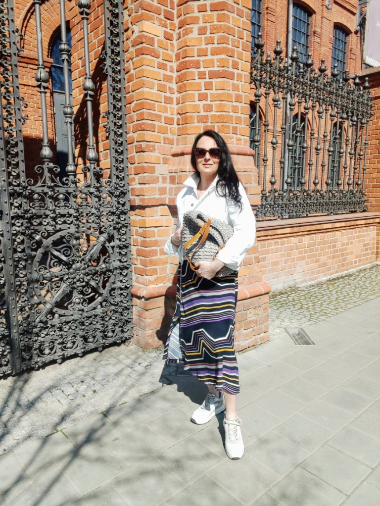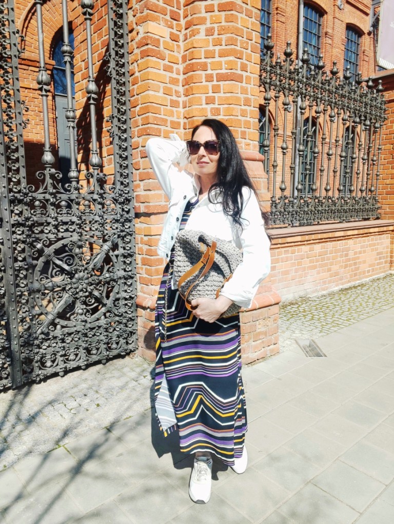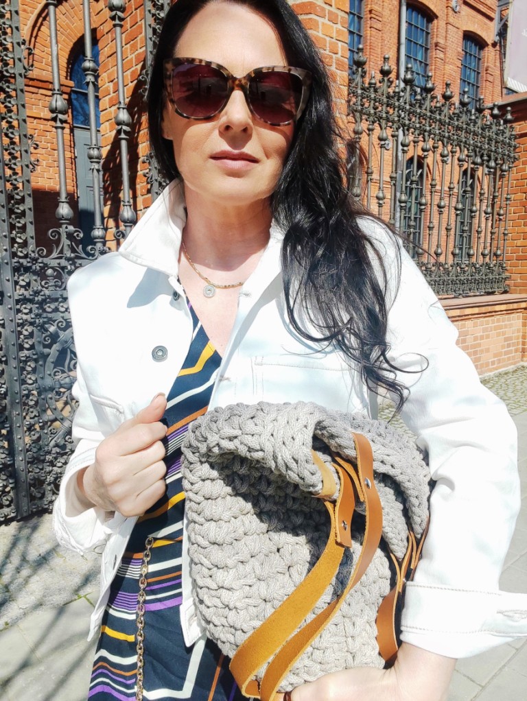 Bluzkę i spódnicę, którą dziś wybrałam, zdobi wzór w niezdecydowane, wielokolorowe pasy. W tym sezonie projektanci stawiają na nieoczywiste, pasiaste printy, którymi podrasowują klasyczne fasony. Zestaw rozjaśniłam białą, jeansową kataną i ręcznie robioną, bawełnianą shopperką na skórzanych paskach. Jest to stylizacja na zakupowe szaleństwo, dlatego włożyłam buty w sportowym stylu. Dodatki to pasek z łańcuszka i choker z rozetką, w złotym kolorze, oraz okular przeciwsłoneczne.