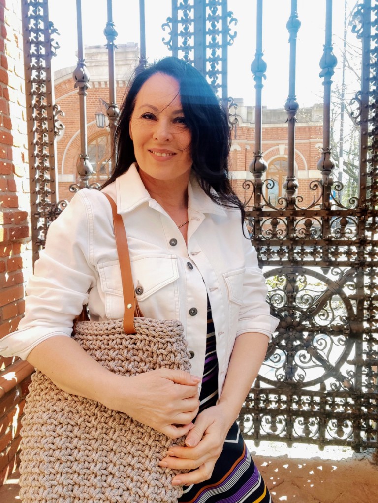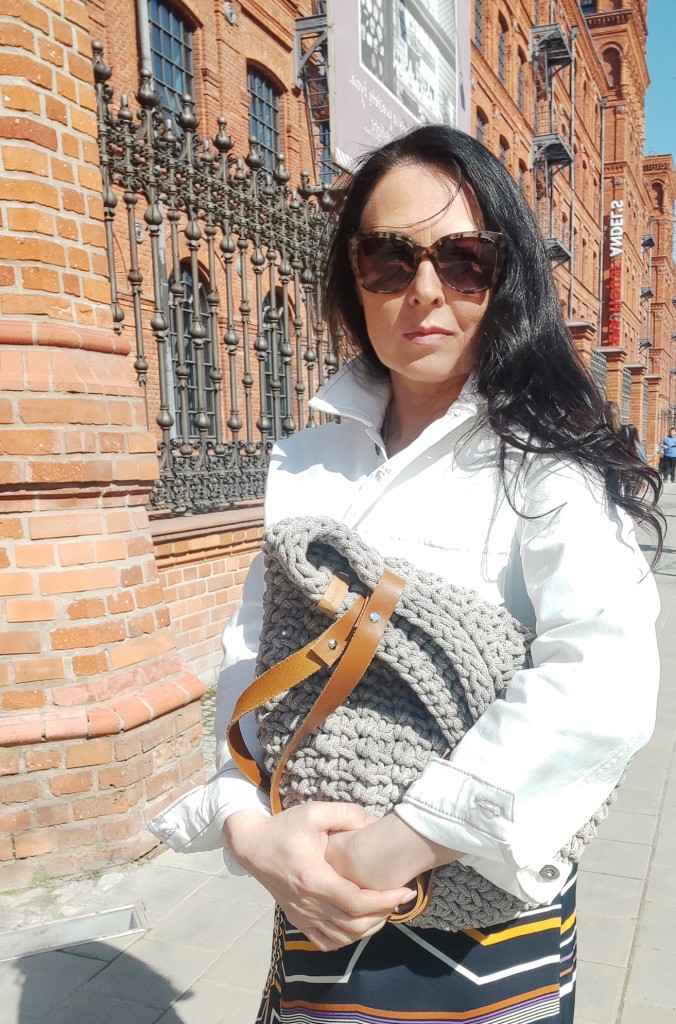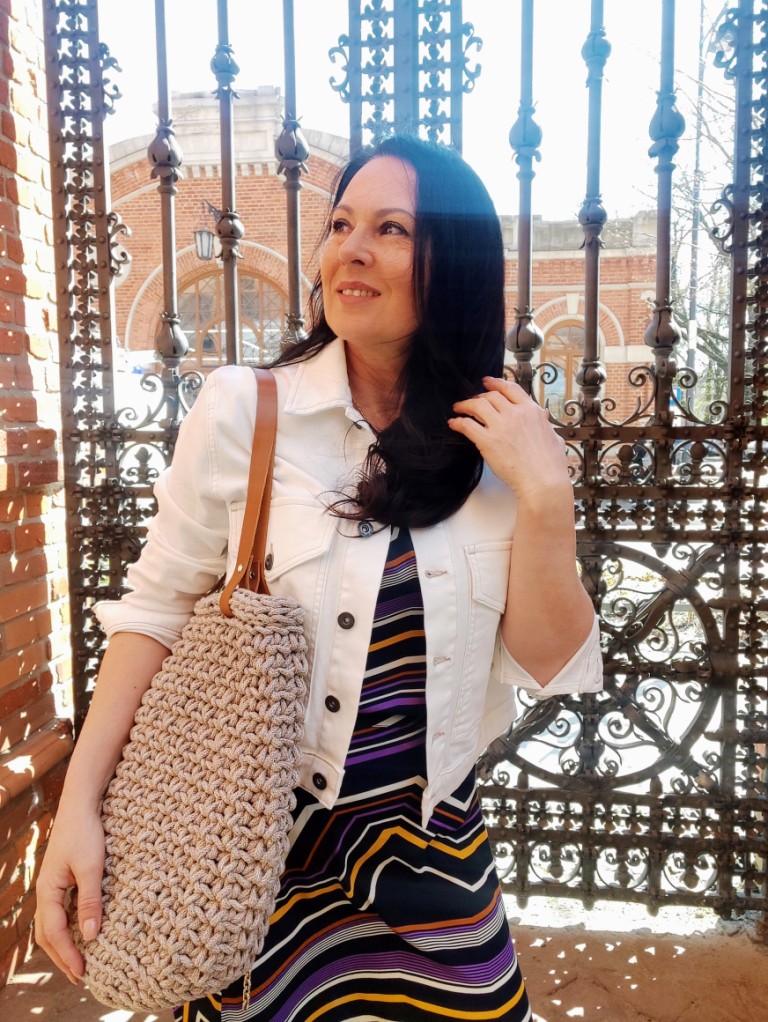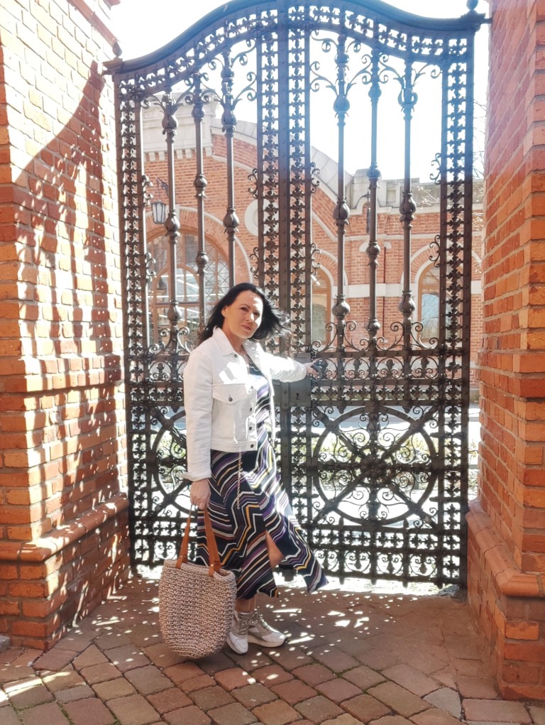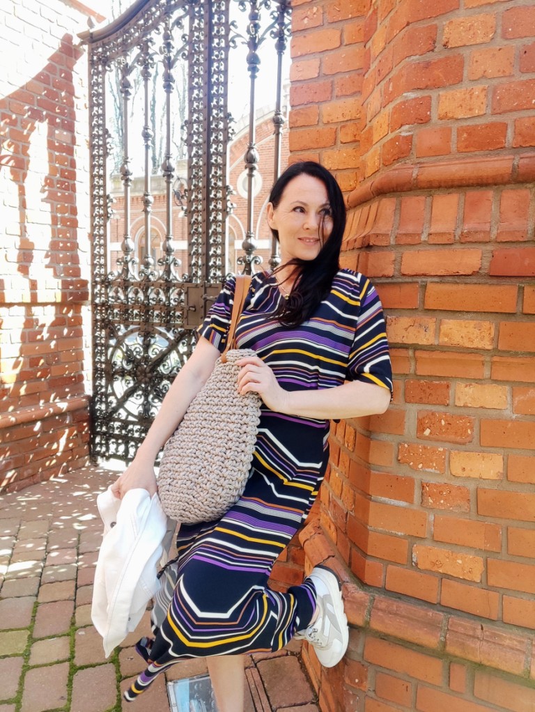Bluzkę i spódnicę, którą dziś wybrałam, zdobi wzór w niezdecydowane, wielokolorowe pasy. W tym sezonie projektanci stawiają na nieoczywiste, pasiaste printy, którymi podrasowują klasyczne fasony. Zestaw rozjaśniłam białą, jeansową kataną i ręcznie robioną, bawełnianą shopperką na skórzanych paskach. Jest to stylizacja na zakupowe szaleństwo, dlatego włożyłam buty w sportowym stylu. Dodatki to pasek z łańcuszka i choker z rozetką, w złotym kolorze, oraz okular przeciwsłoneczne.