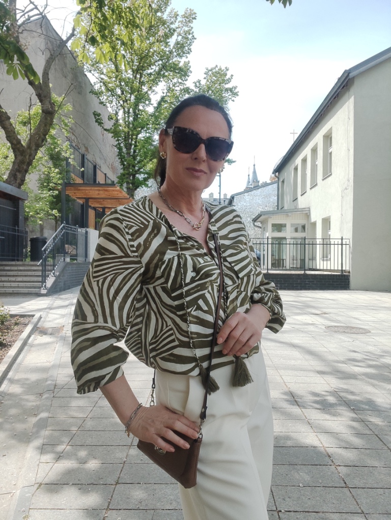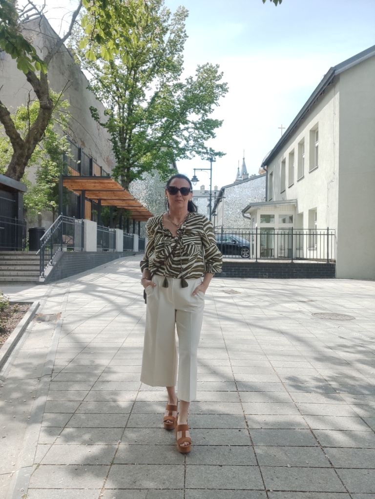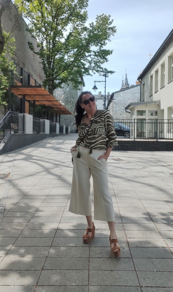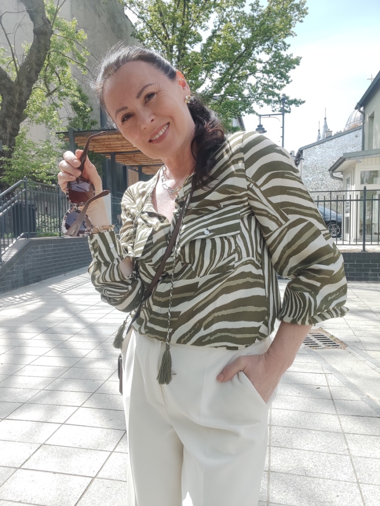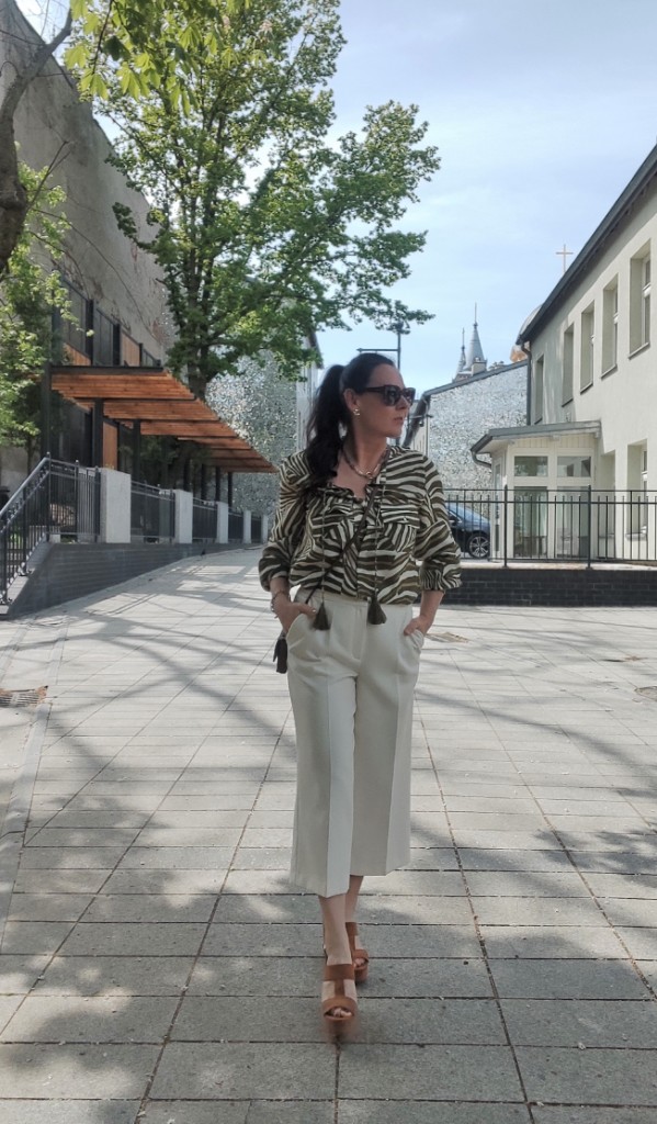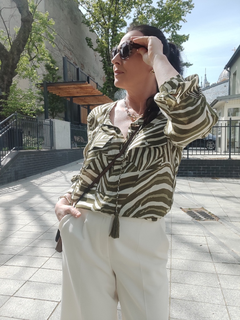 Zwierzęce printy w sezonie letnim, od dawna nikogo nie dziwią. Co roku w kolekcjach, możemy znaleźć coś w stylu miejskiego safari. Dziś, wybrałam koszulę w zielone pręgi, trudno ocenić czy to zebra, czy tygrys 🙂 i jasne kuloty. Na moje szczęście jest wielki powrót butów na koturnie, i o dziwo jeszcze się takie u mnie uchowały. Do tego mała torebka, przeciwsłoneczne okulary i złoto-srebrna biżuteria.