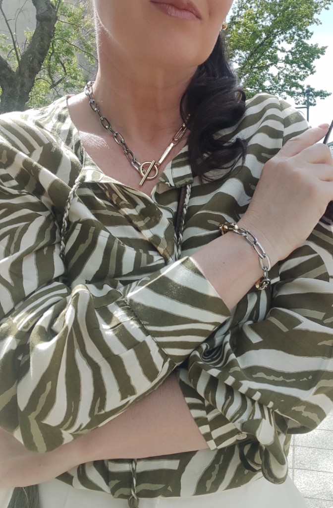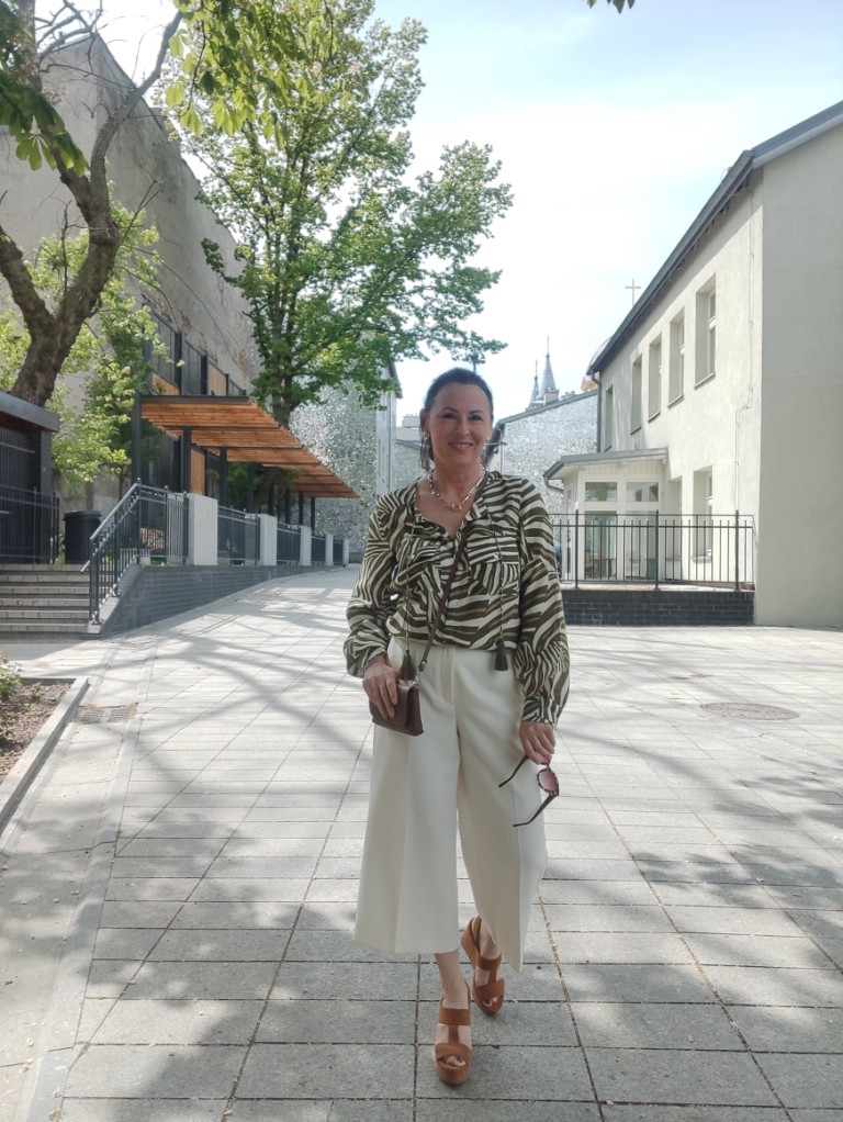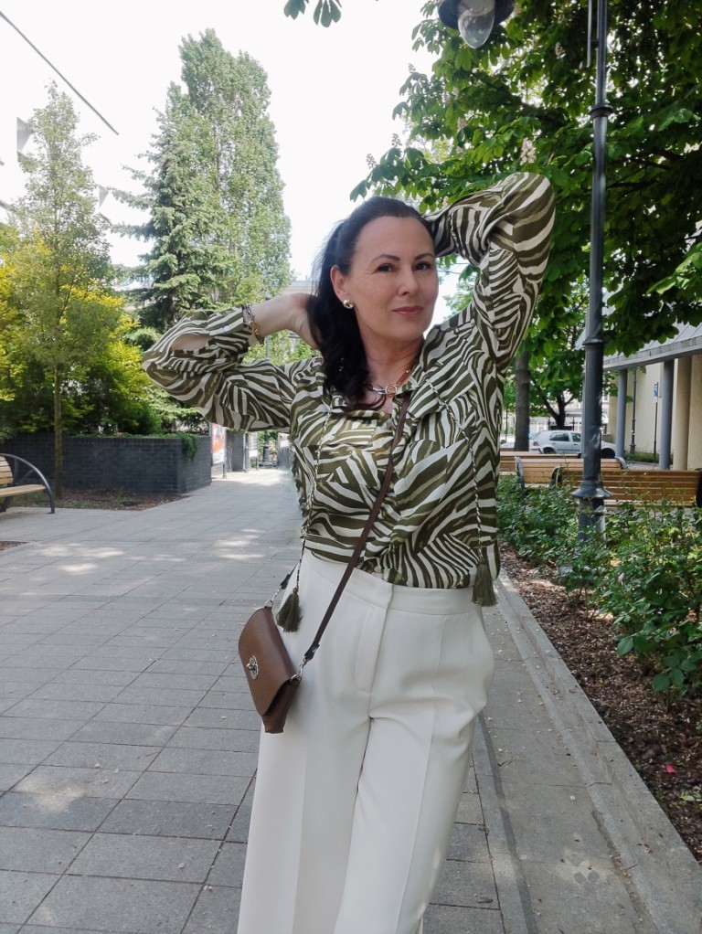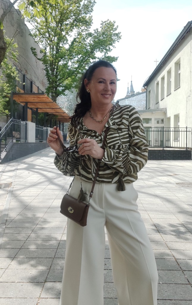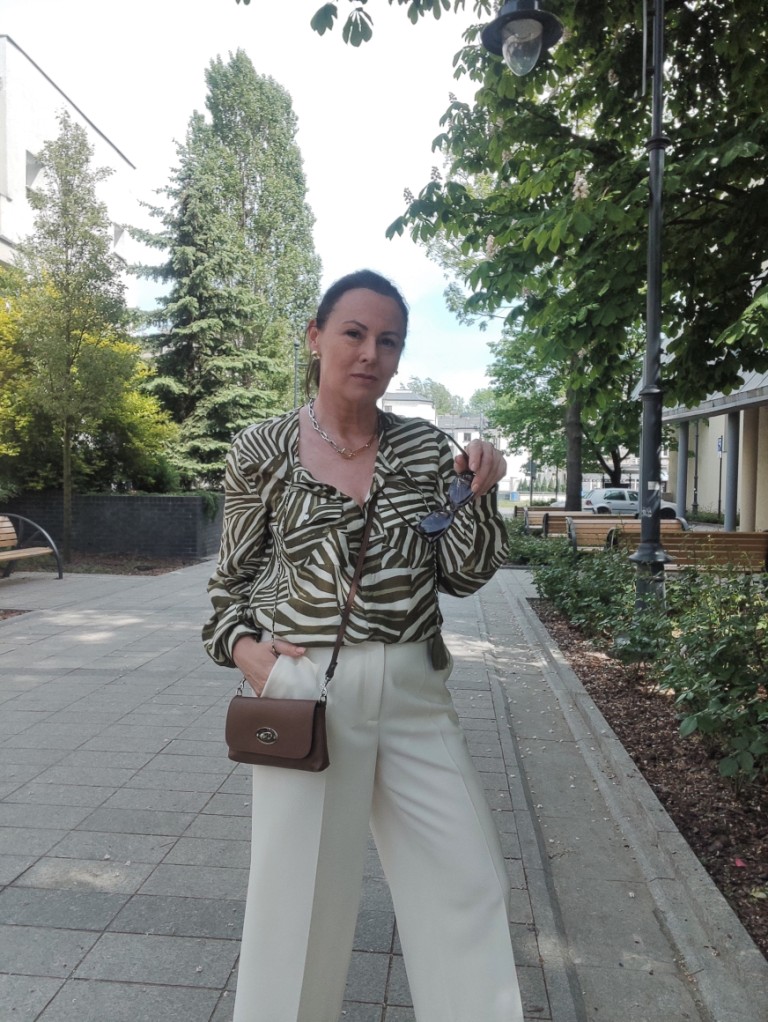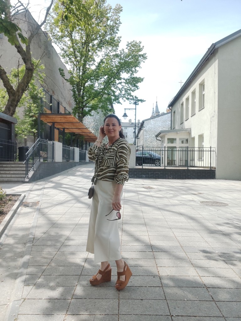 Zwierzęce printy w sezonie letnim, od dawna nikogo nie dziwią. Co roku w kolekcjach, możemy znaleźć coś w stylu miejskiego safari. Dziś, wybrałam koszulę w zielone pręgi, trudno ocenić czy to zebra, czy tygrys 🙂 i jasne kuloty. Na moje szczęście jest wielki powrót butów na koturnie, i o dziwo jeszcze się takie u mnie uchowały. Do tego mała torebka, przeciwsłoneczne okulary i złoto-srebrna biżuteria.