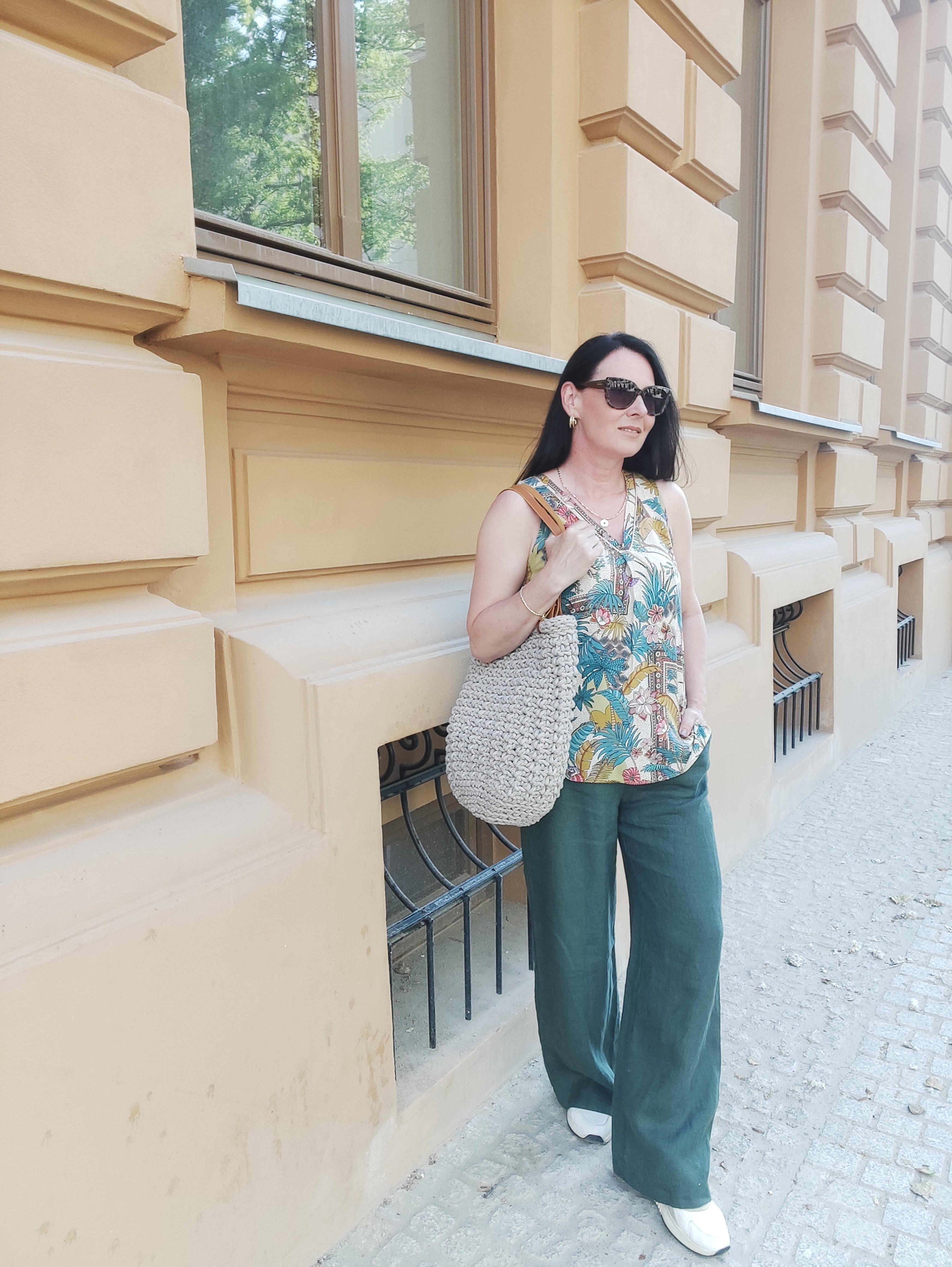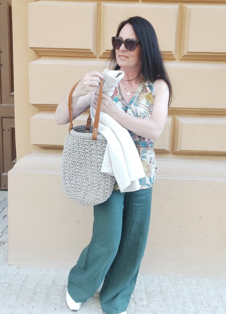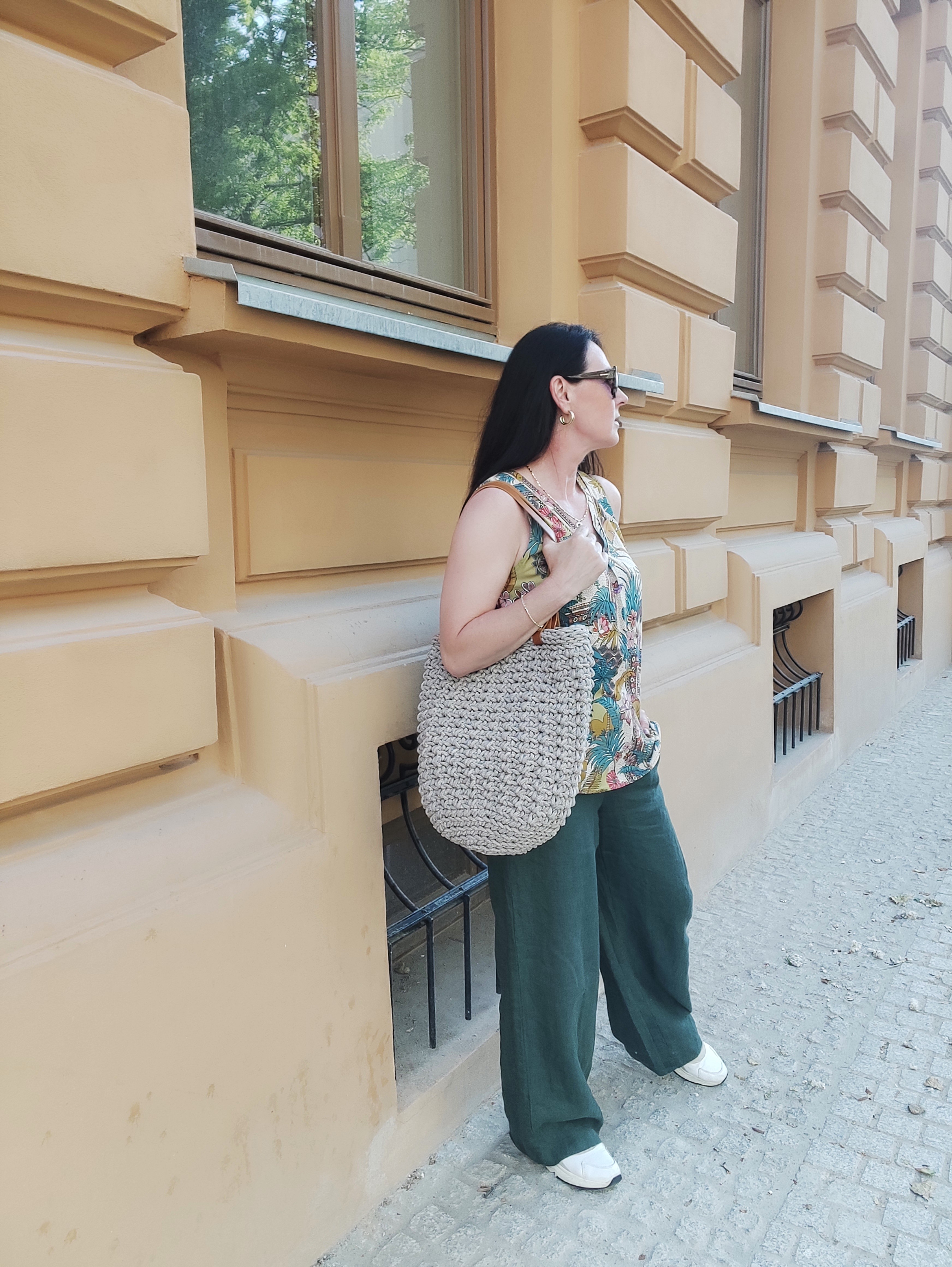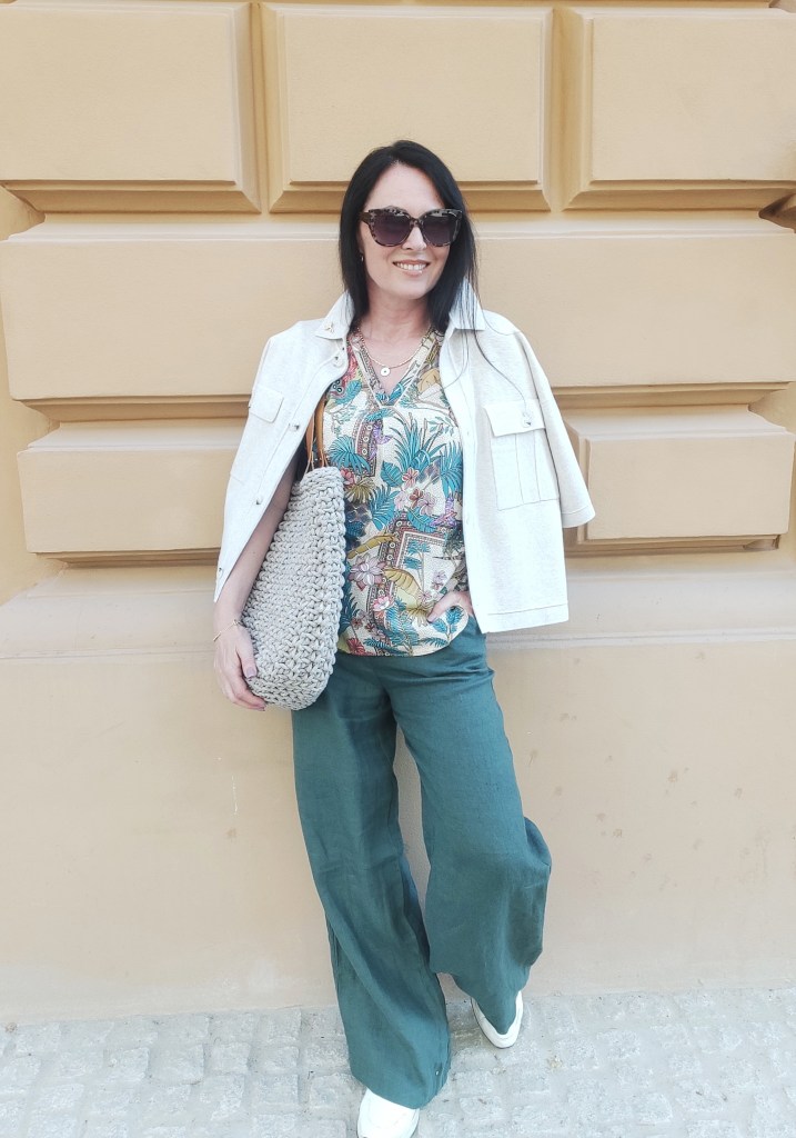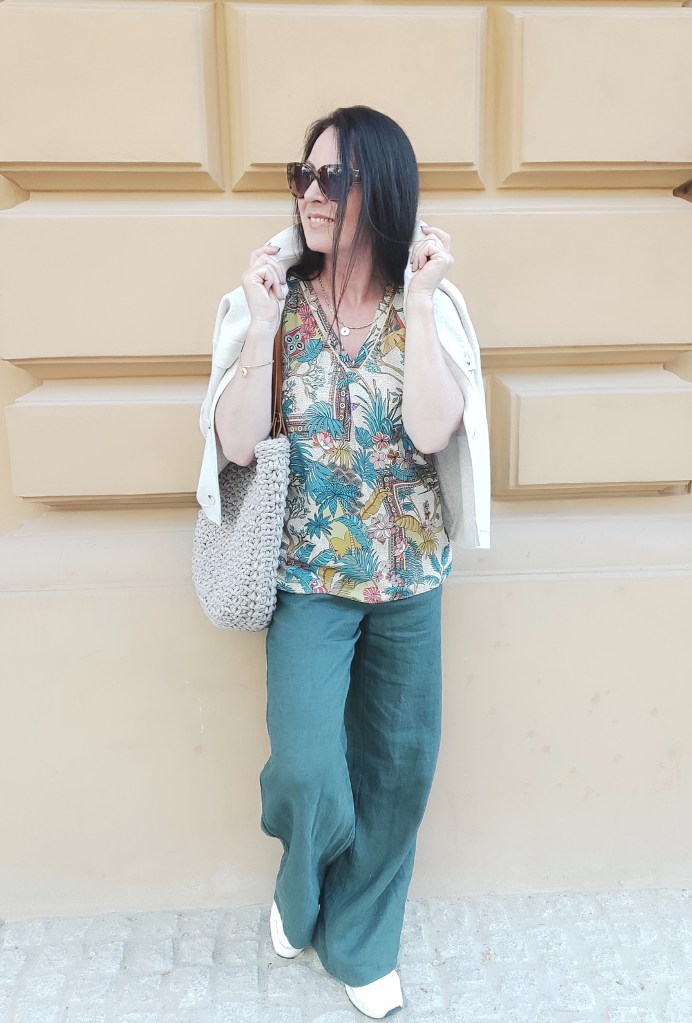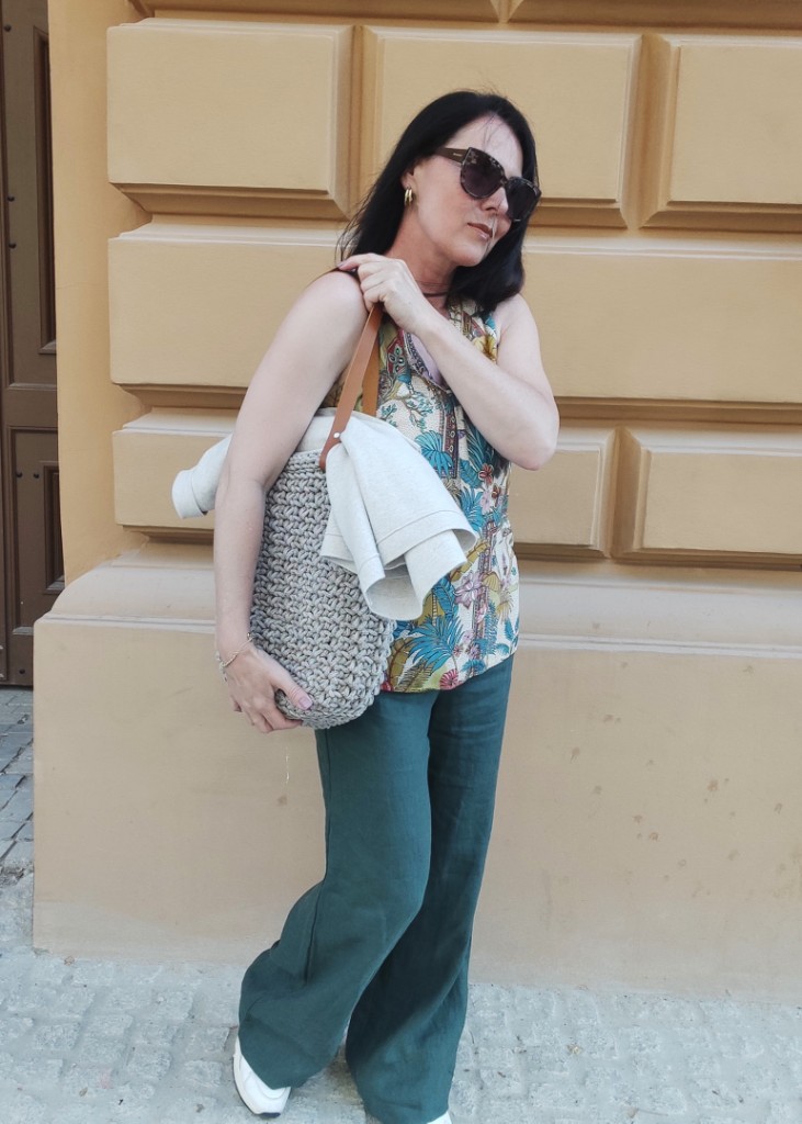 Naturalne materiały, delikatne kolory i swobodny fason, to przepis na letnią stylizację. Bez względu na to, czy jestem na urlopie, czy spędzam lato w mieście stawiam na wygodę. Dziś mam na sobie lniane spodnie, bluzkę bez rękawów w kolorowy, egzotyczny print i bawełniany żakiet w stylu safari. Torbę, wybrałam z ekologicznej bawełny na skórzanych paskach, mojej ulubionej, rękodzielniczej marki.