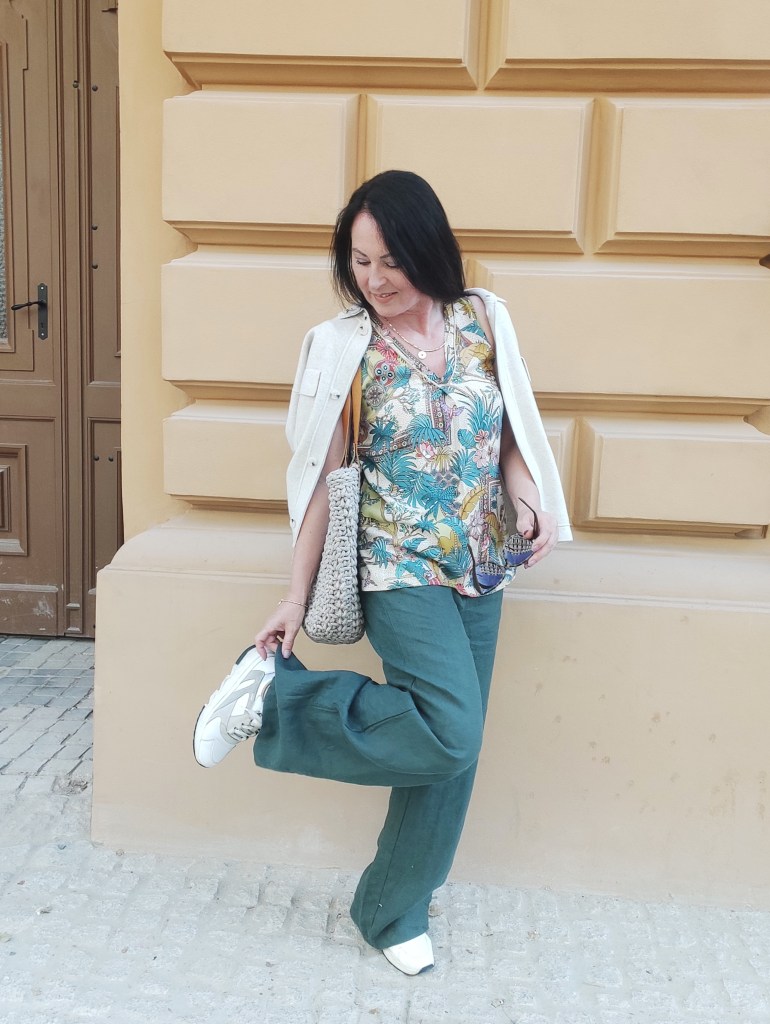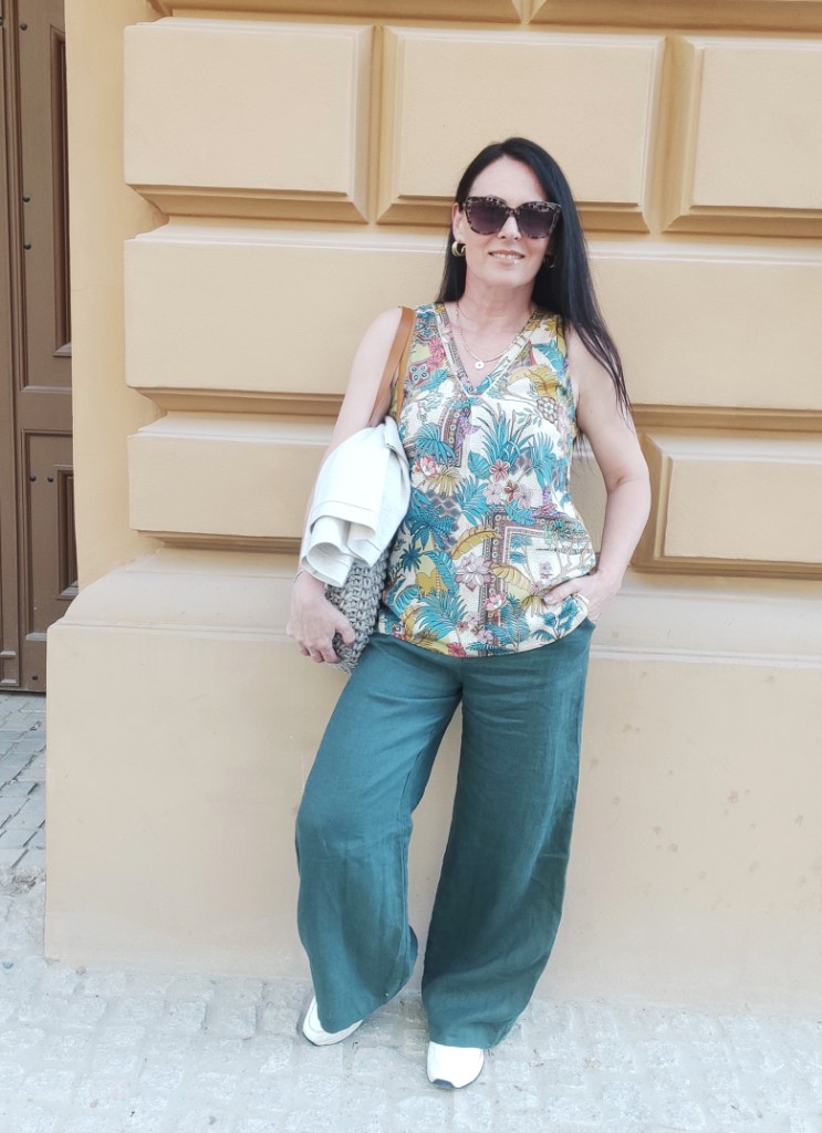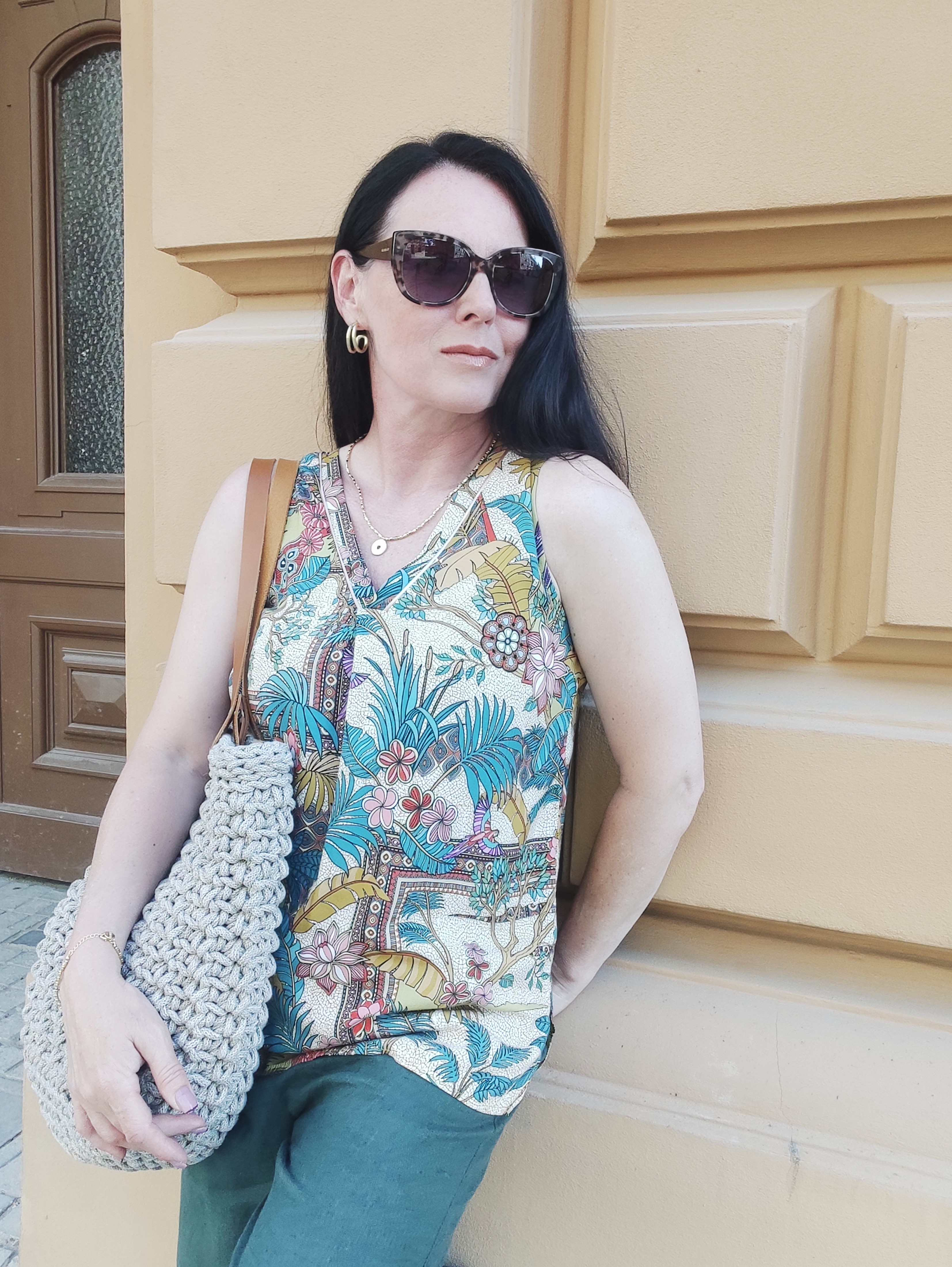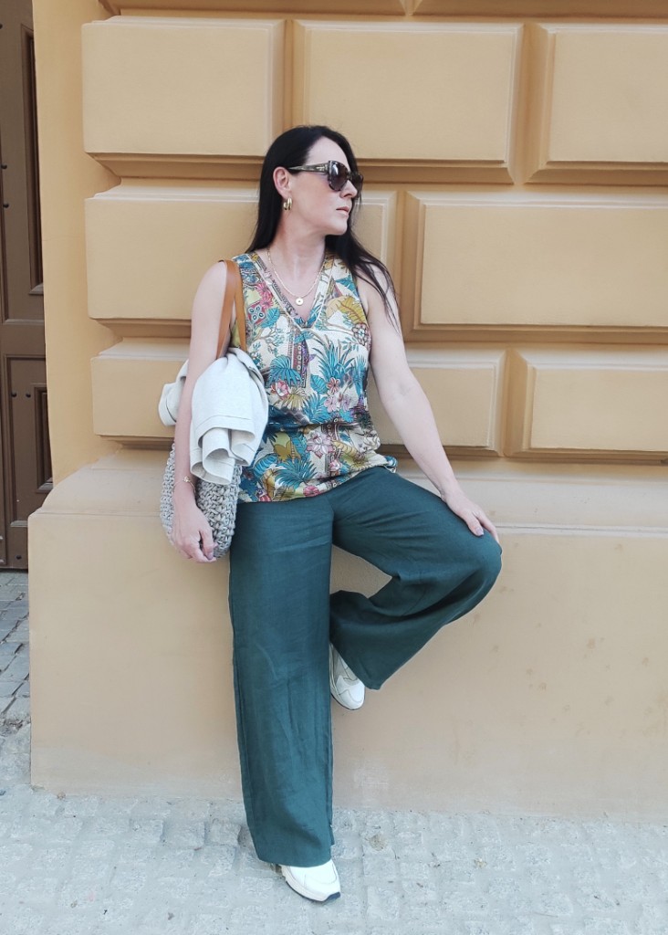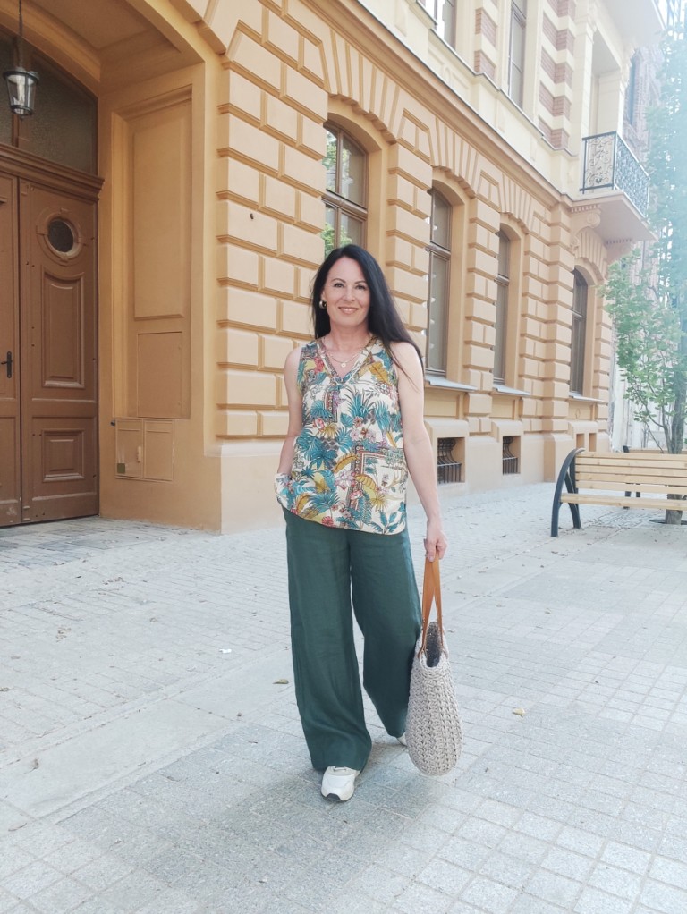Naturalne materiały, delikatne kolory i swobodny fason, to przepis na letnią stylizację. Bez względu na to, czy jestem na urlopie, czy spędzam lato w mieście stawiam na wygodę. Dziś mam na sobie lniane spodnie, bluzkę bez rękawów w kolorowy, egzotyczny print i bawełniany żakiet w stylu safari. Torbę, wybrałam z ekologicznej bawełny na skórzanych paskach, mojej ulubionej, rękodzielniczej marki.