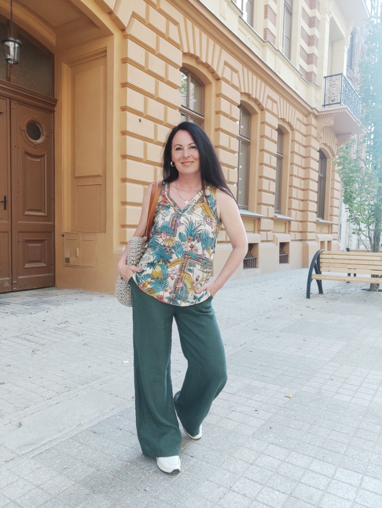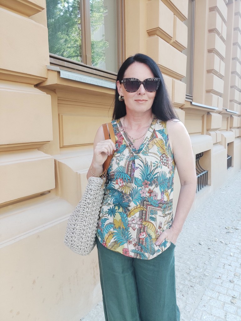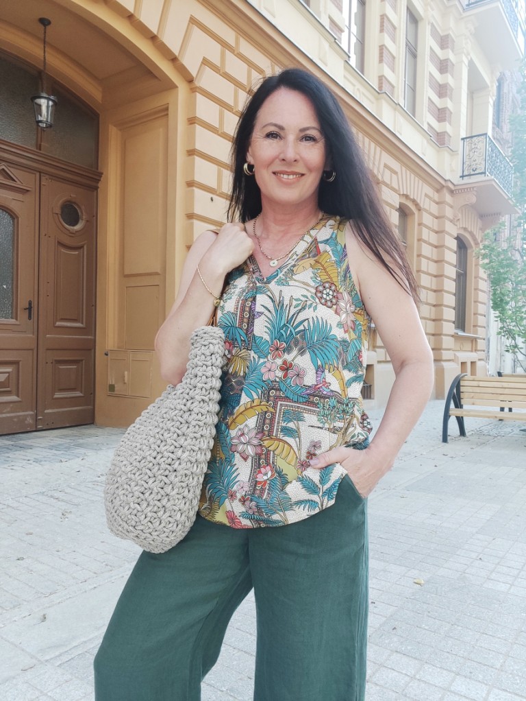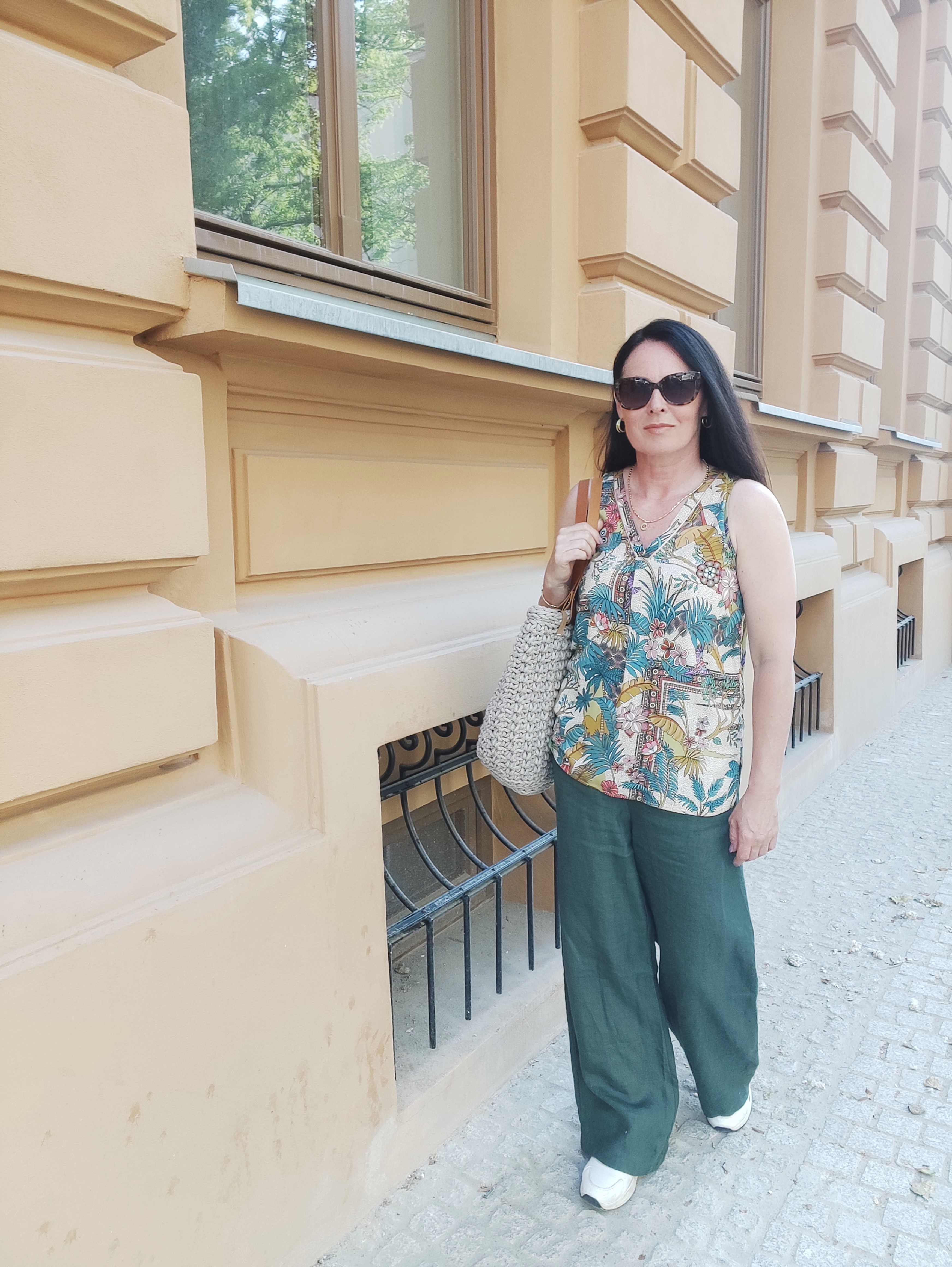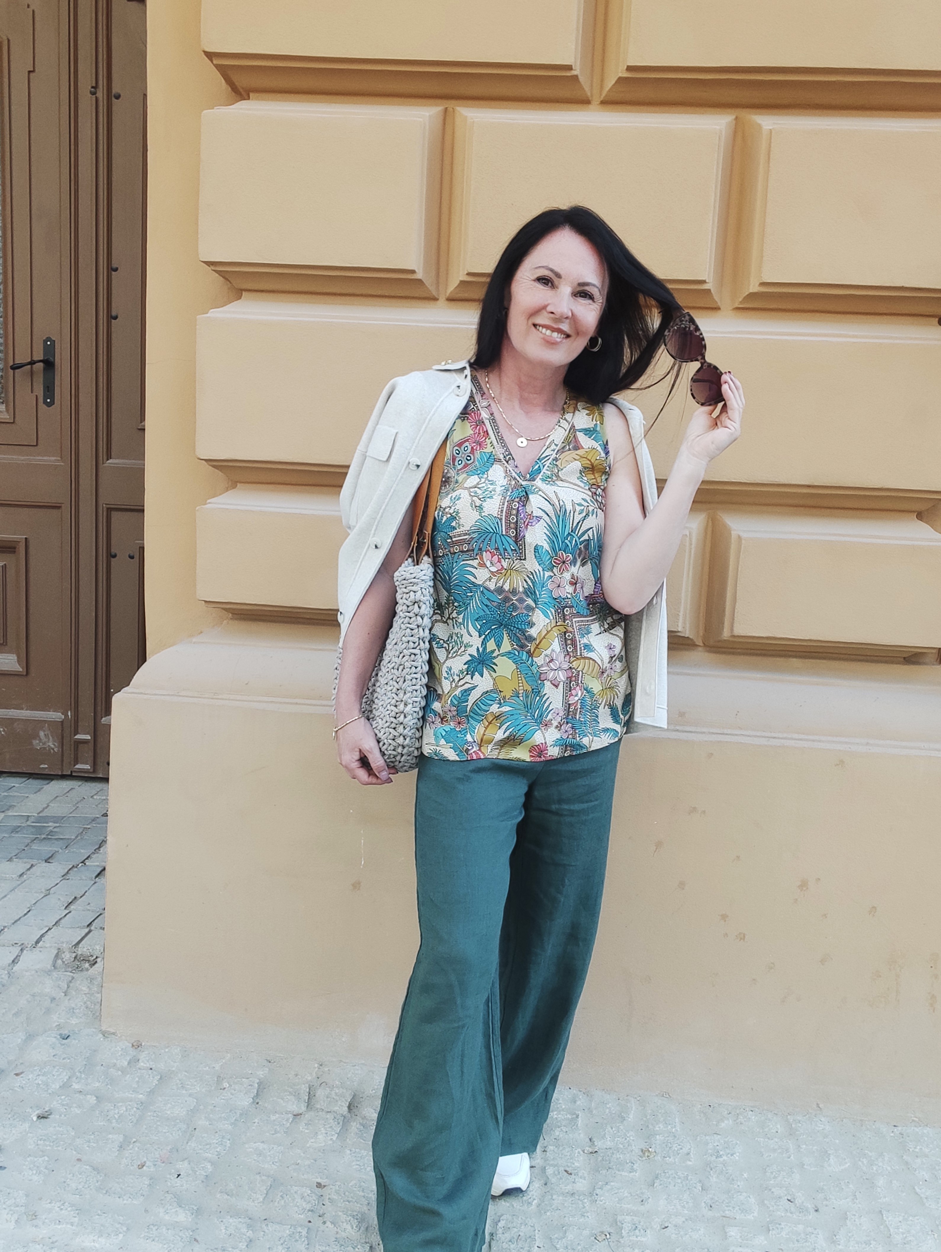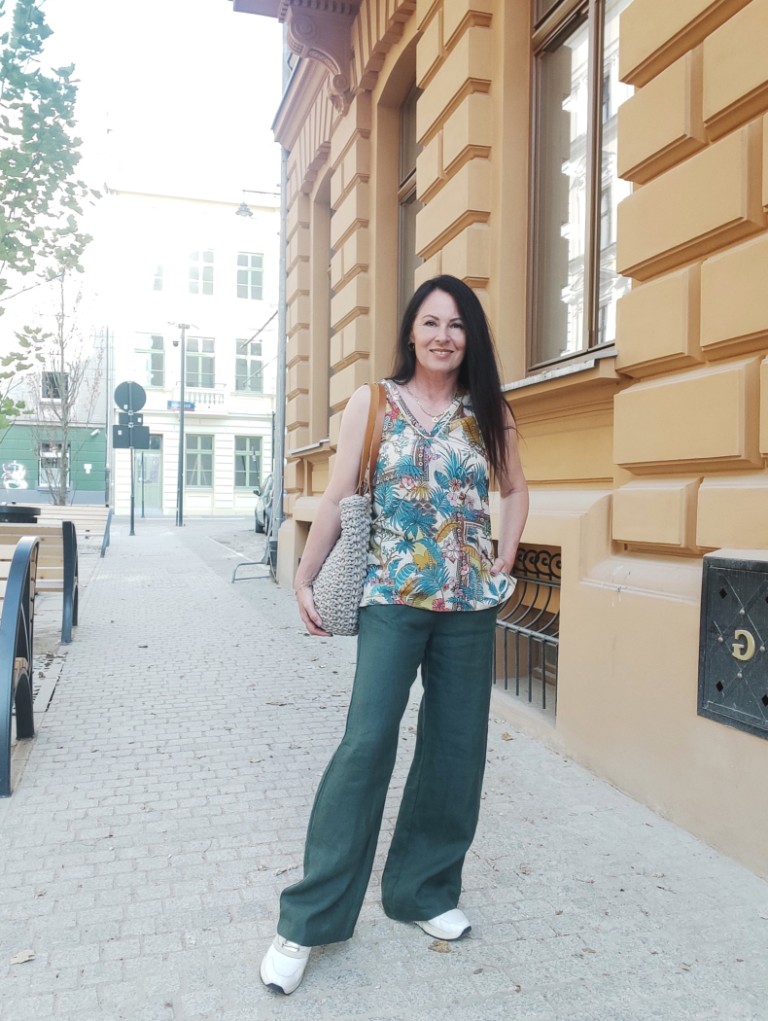 Naturalne materiały, delikatne kolory i swobodny fason, to przepis na letnią stylizację. Bez względu na to, czy jestem na urlopie, czy spędzam lato w mieście stawiam na wygodę. Dziś mam na sobie lniane spodnie, bluzkę bez rękawów w kolorowy, egzotyczny print i bawełniany żakiet w stylu safari. Torbę, wybrałam z ekologicznej bawełny na skórzanych paskach, mojej ulubionej, rękodzielniczej marki.