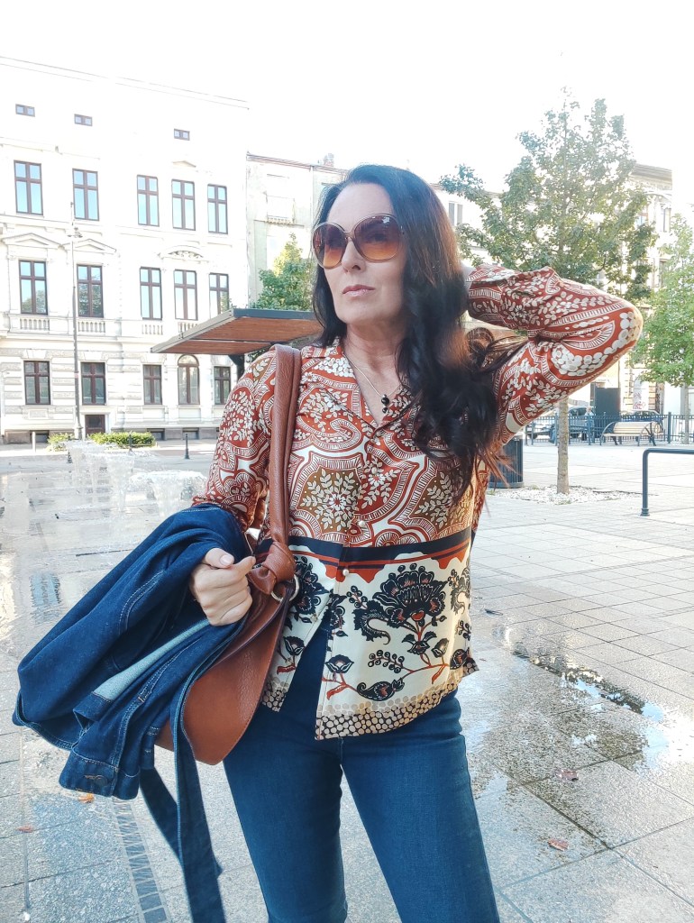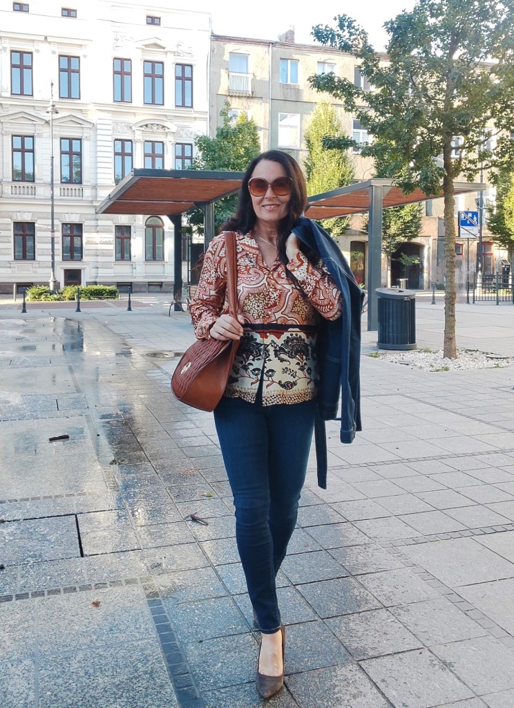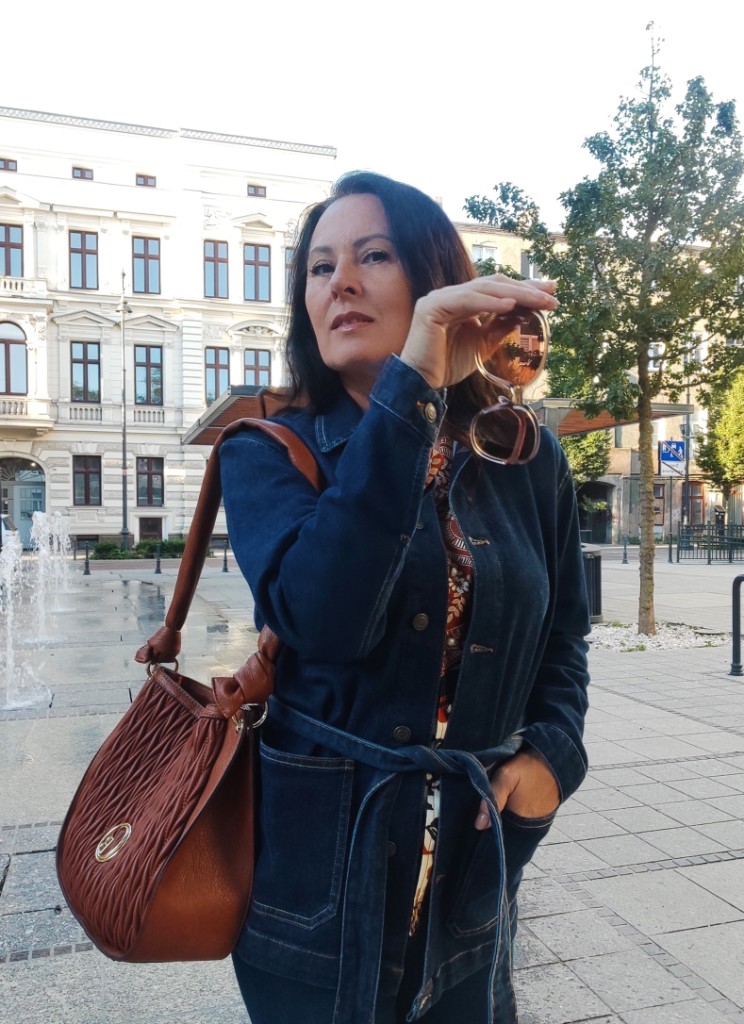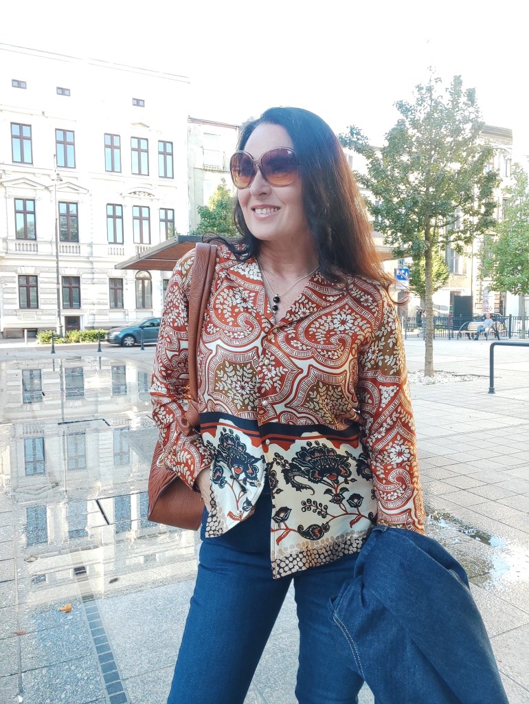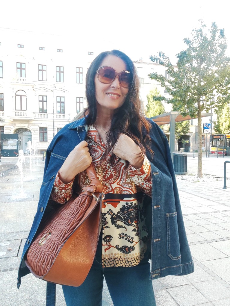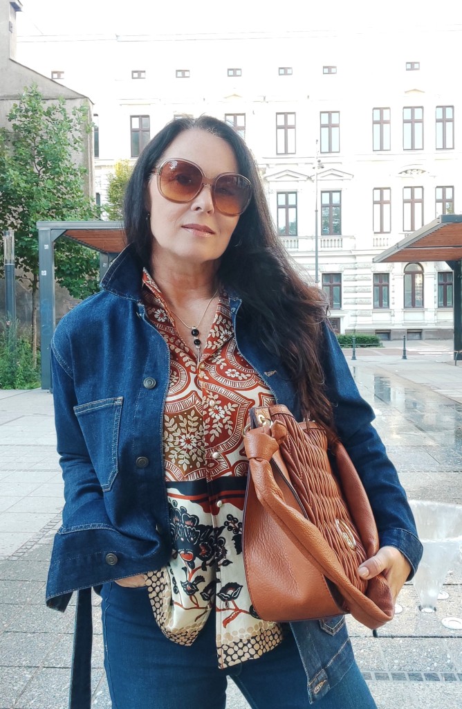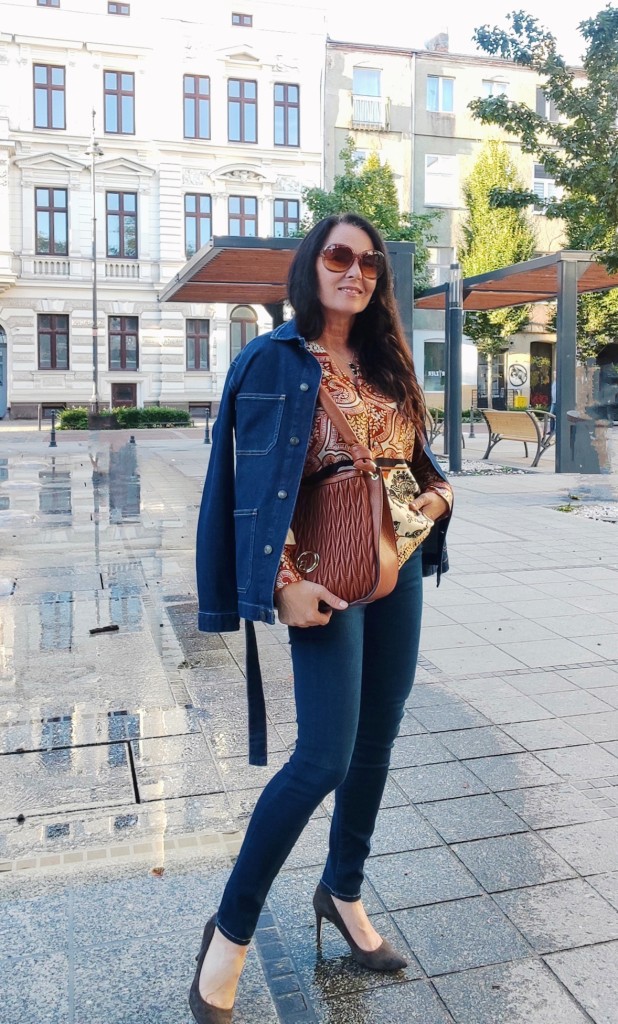 Jensowa kurtka z kolekcji La petite francais to mój wybór na ten sezon. Prosty fason z paskiem, naszytymi kieszeniami i małym kołnierzykiem. To model ponadczasowy i wygląda z jeansami tak samo świetnie jak z sukienką. Już niebawem będę wkładać do tego zestawu kozaki z wysoką cholewką. Dobrałam do niej spodnie i wzorzystą koszulę tej samej marki. Kolory koszuli są idealnym łącznikiem między jeansem a dodatkami.