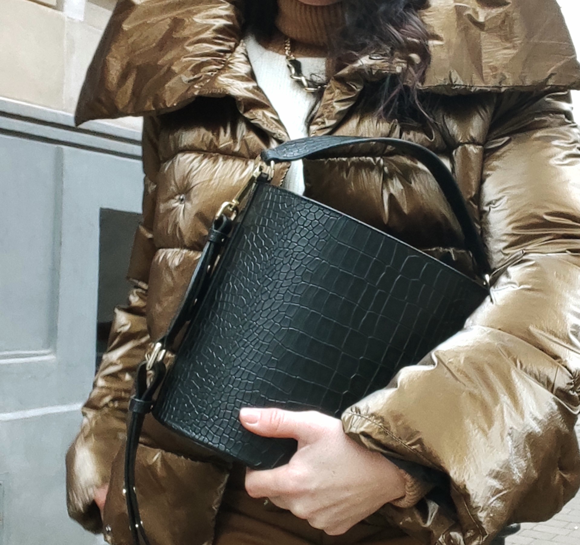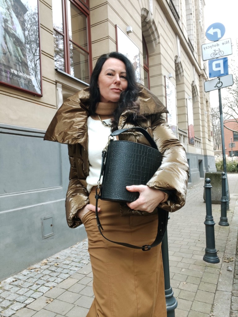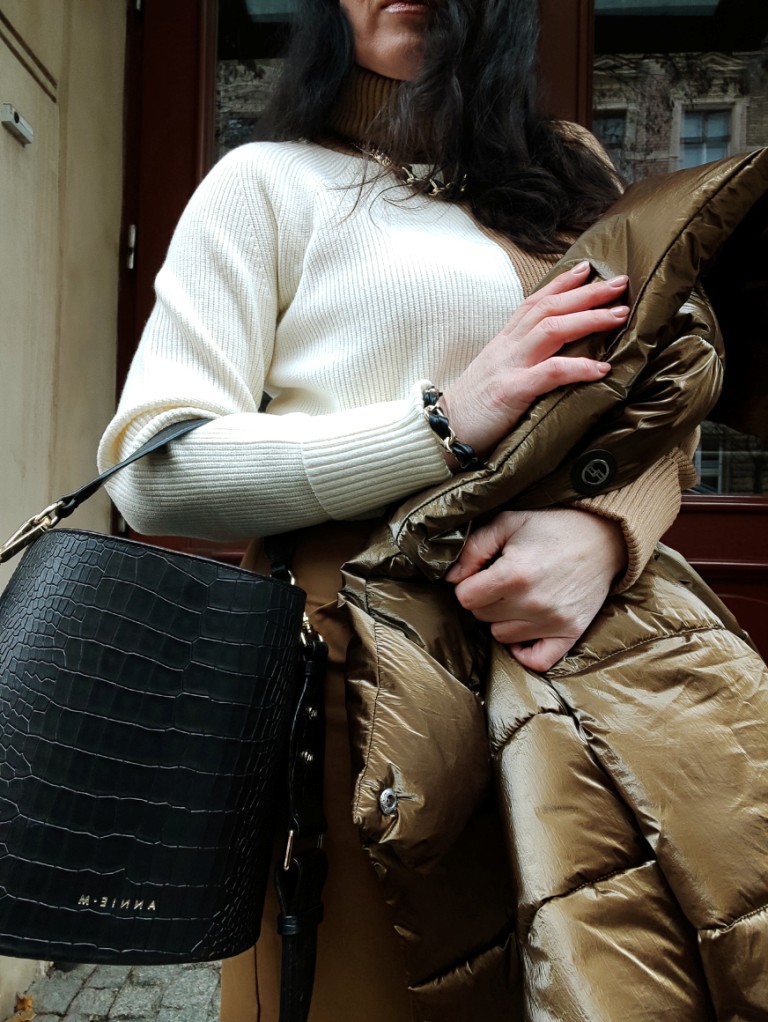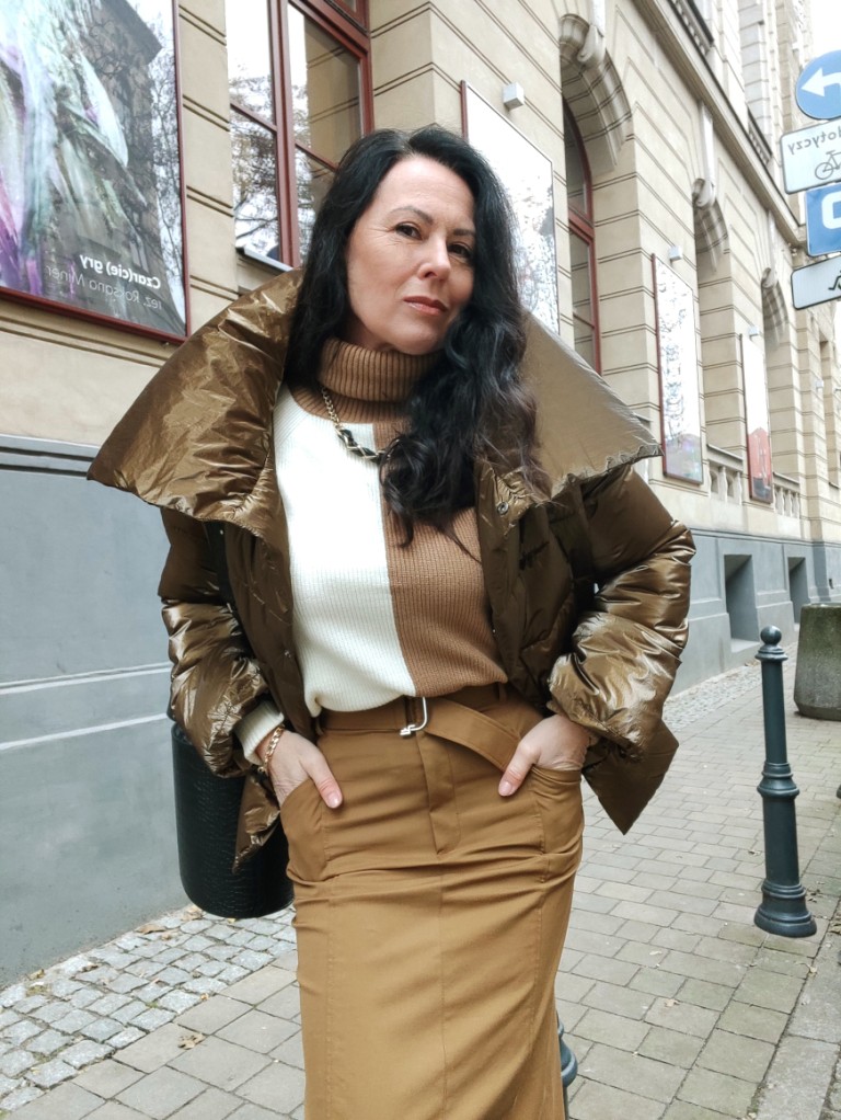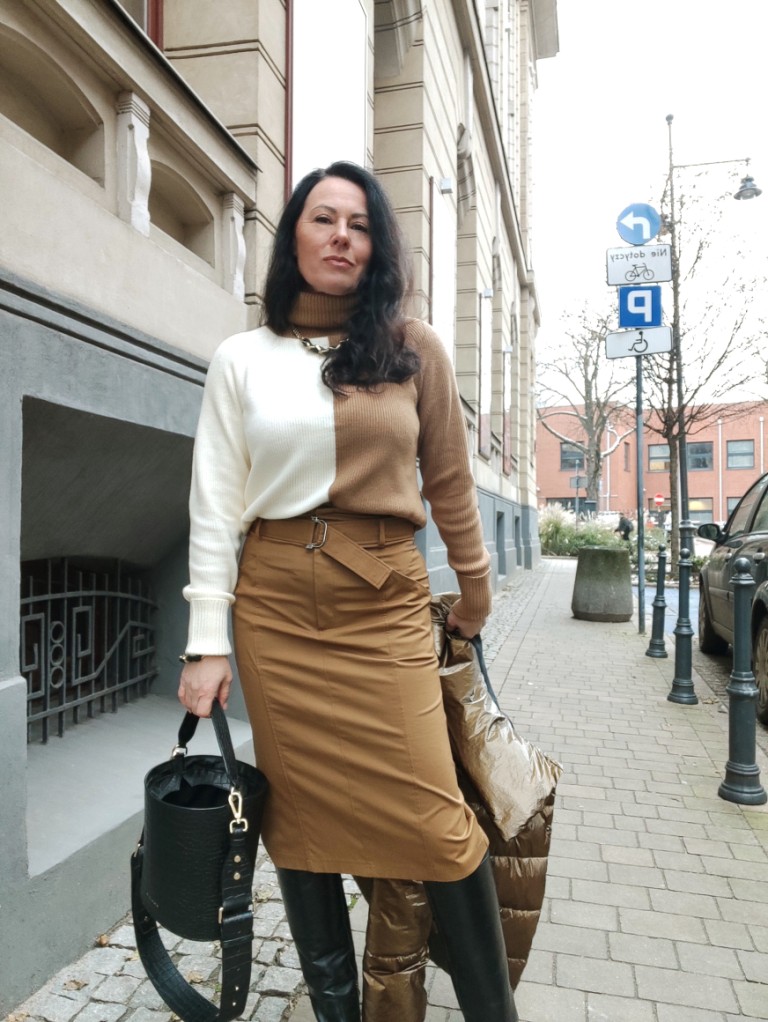 Pokazując Wam kolejną stylizację w camelowo – czarnym kolorze z pewnością nie zaskoczę, jednak zestawienie tych kolorów jest nieustannie w trendach. W trendach są także, spódnice z wysokim stanem, najlepiej zdobione ciekawym zapięciem lub paskiem. Poszaleć można z asymetrią i założyć bluzkę na jedno ramiączko lub z jednym rękawem. Ja wybrałam, kolorystycznie asymetryczny sweter z golfem.