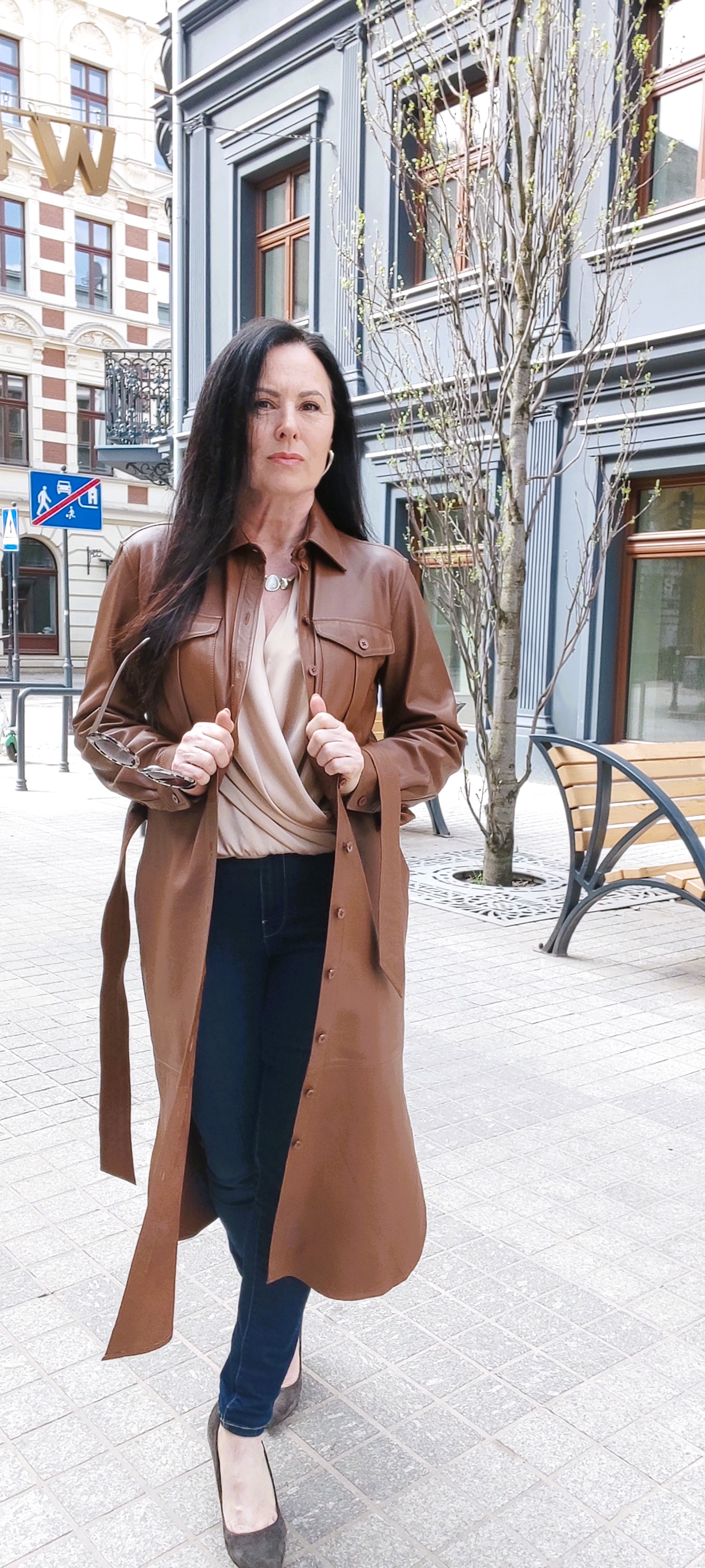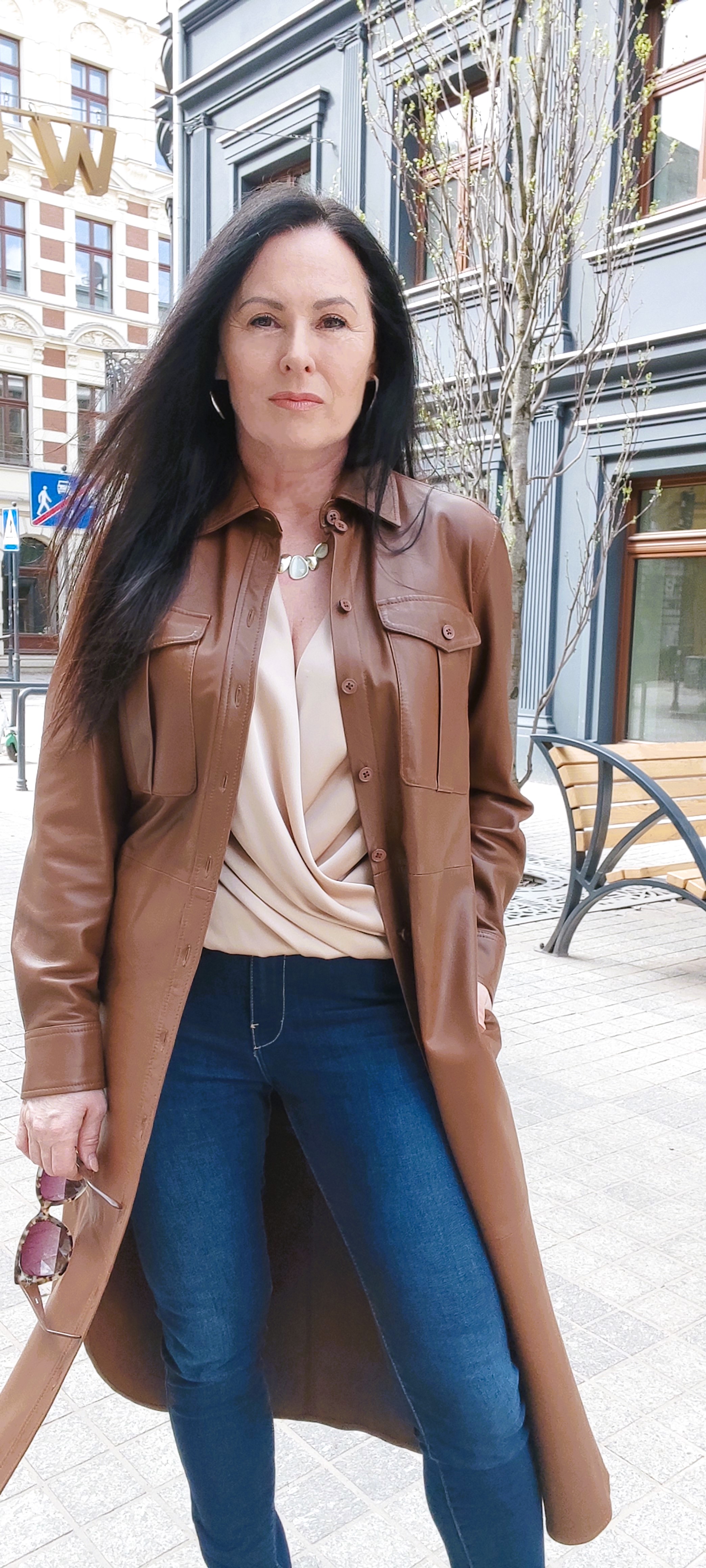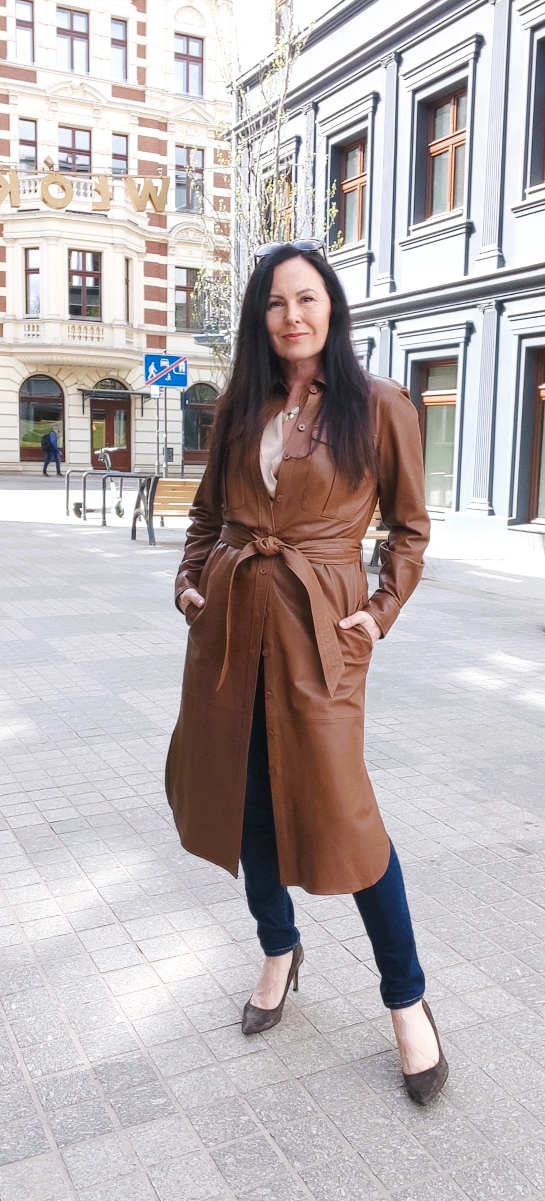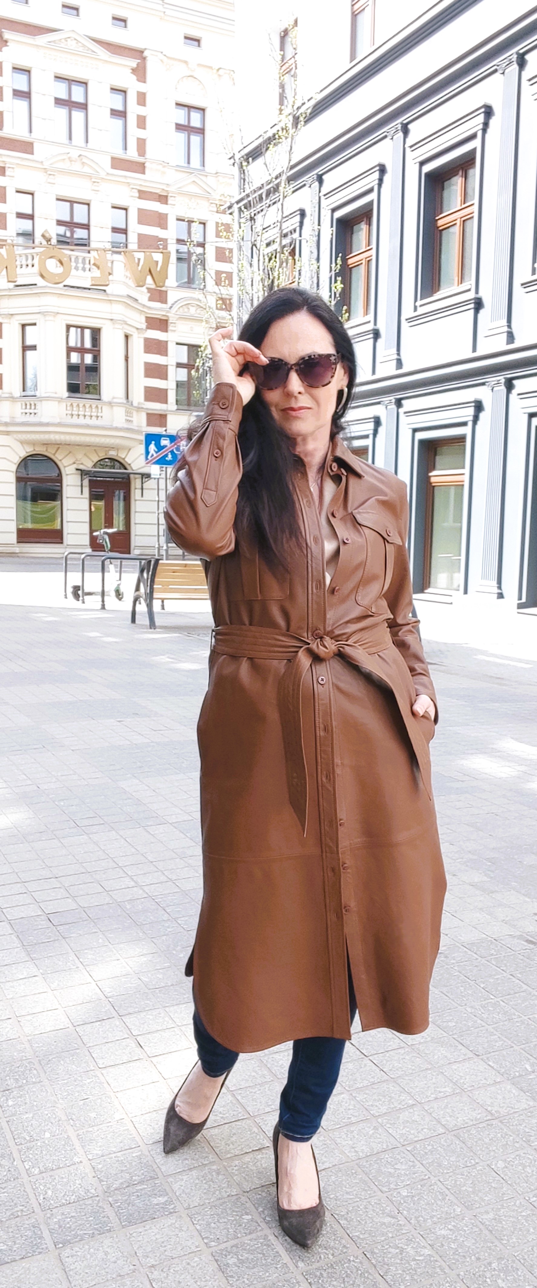 Skórzana sukienka w formie szmizjerki, w dzisiejszej stylizacji zastapiła mi trench. To uniwersalny i jednocześnie ponadczasowy model. Można nosić ją cały rok, z czółenkami, kozakami i obuwiem spotrowym. Włożyłam pod nią rurki z ciemnego denimu i satynową bluzkę bez rekawów. Z dodatków wybrałam zamszowe czółenka i biżuterię w kolorze jasnego złota.