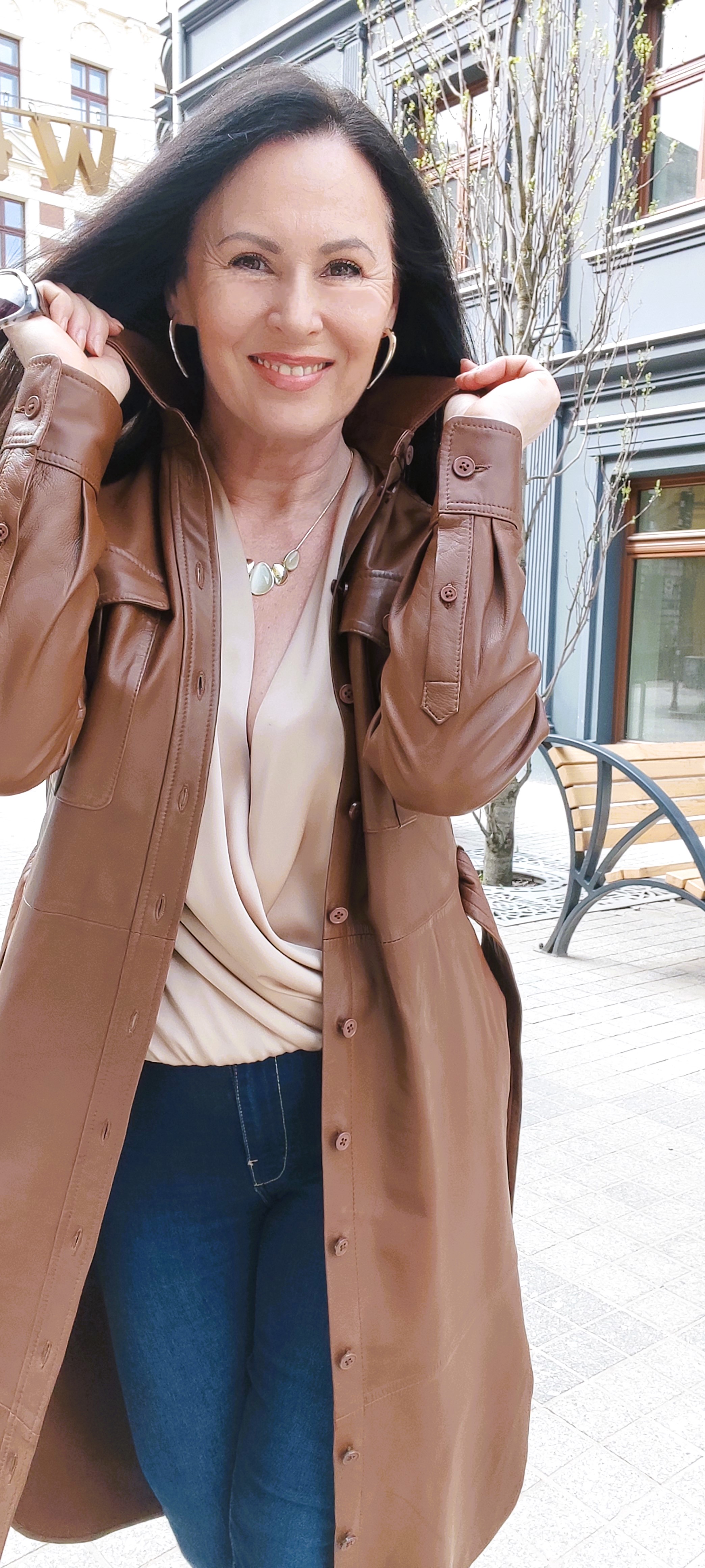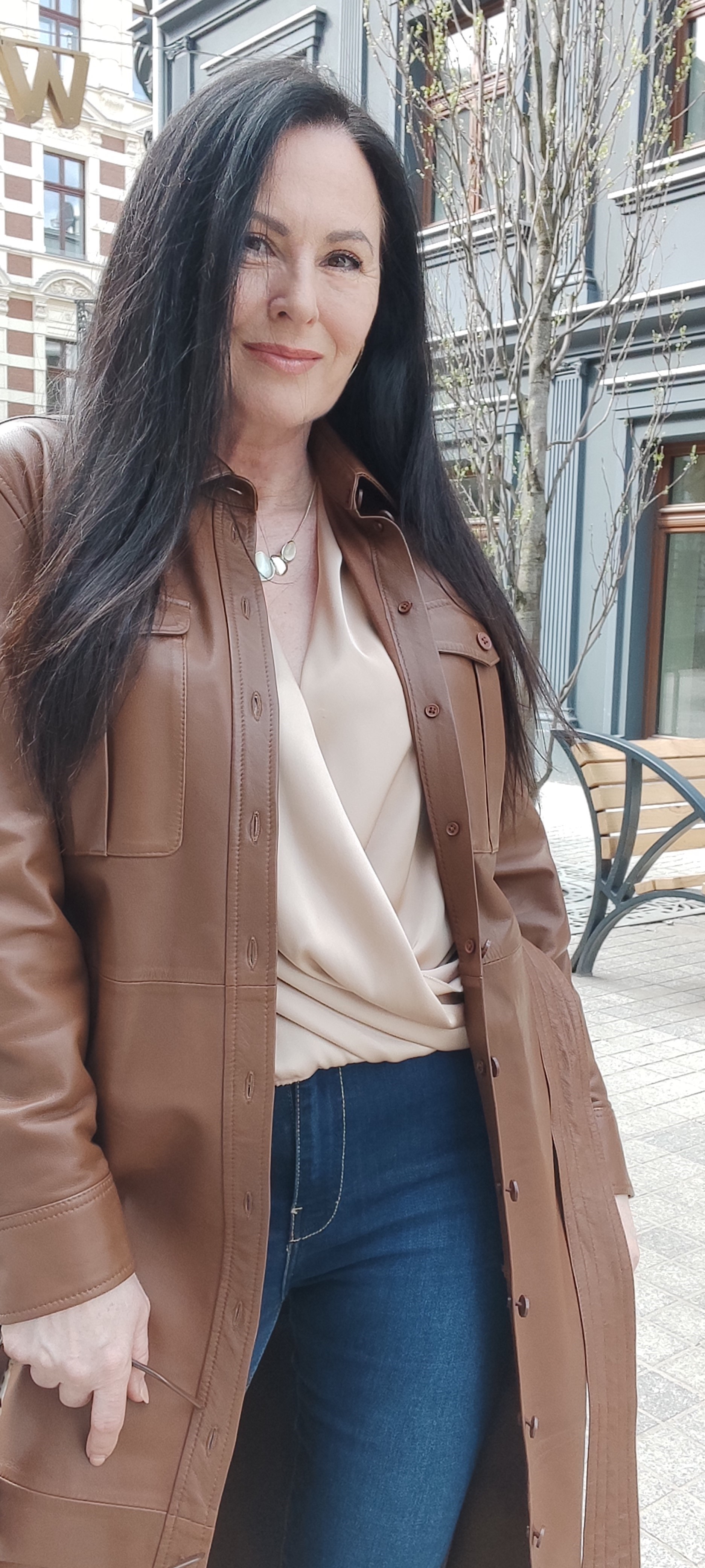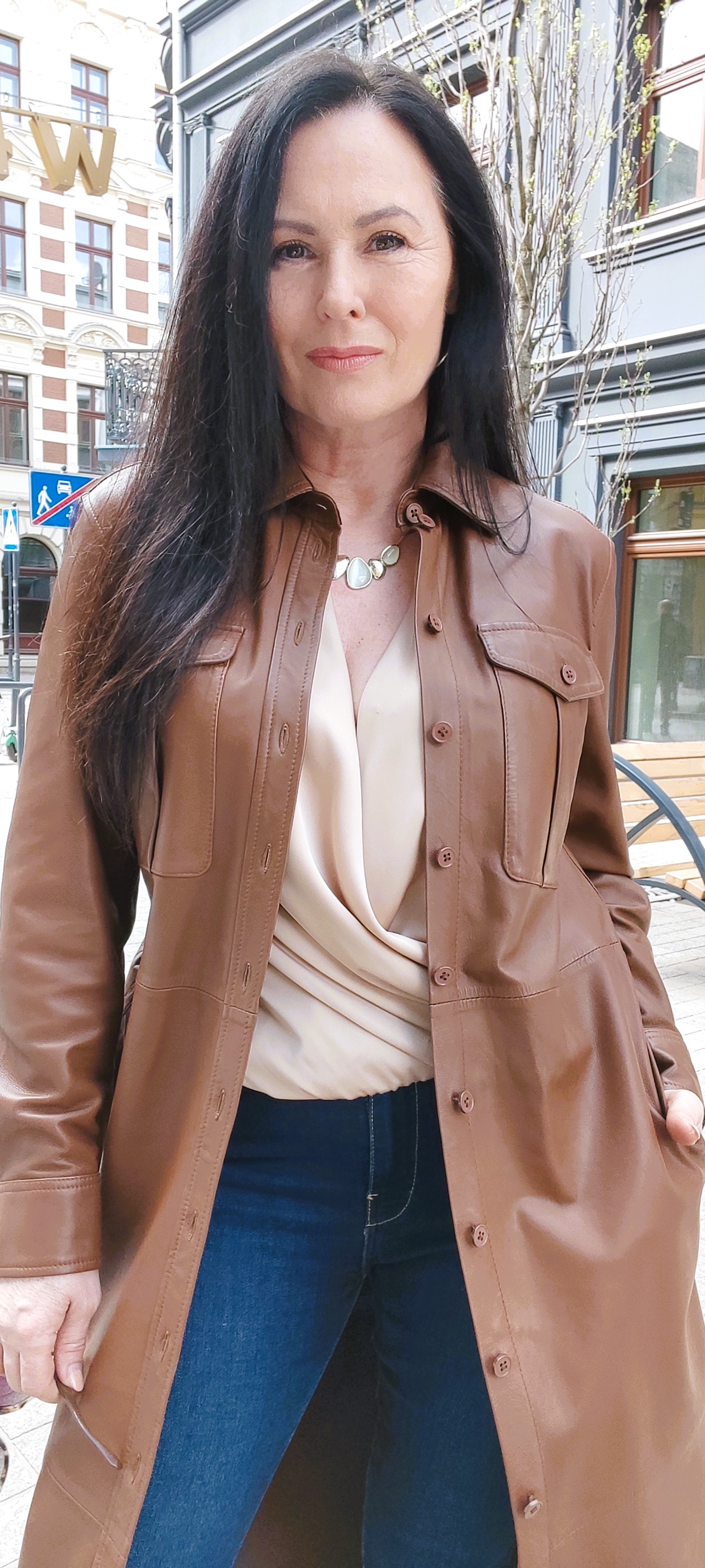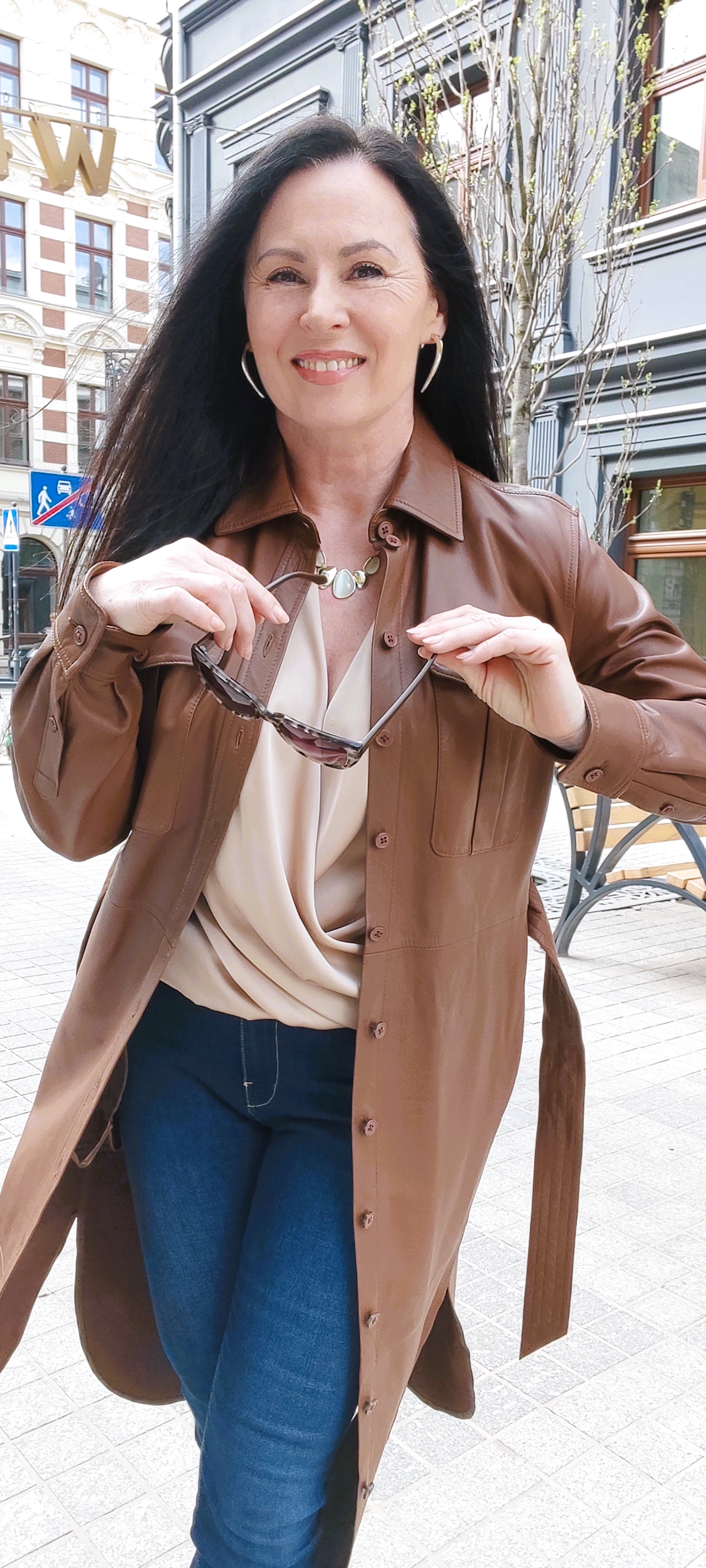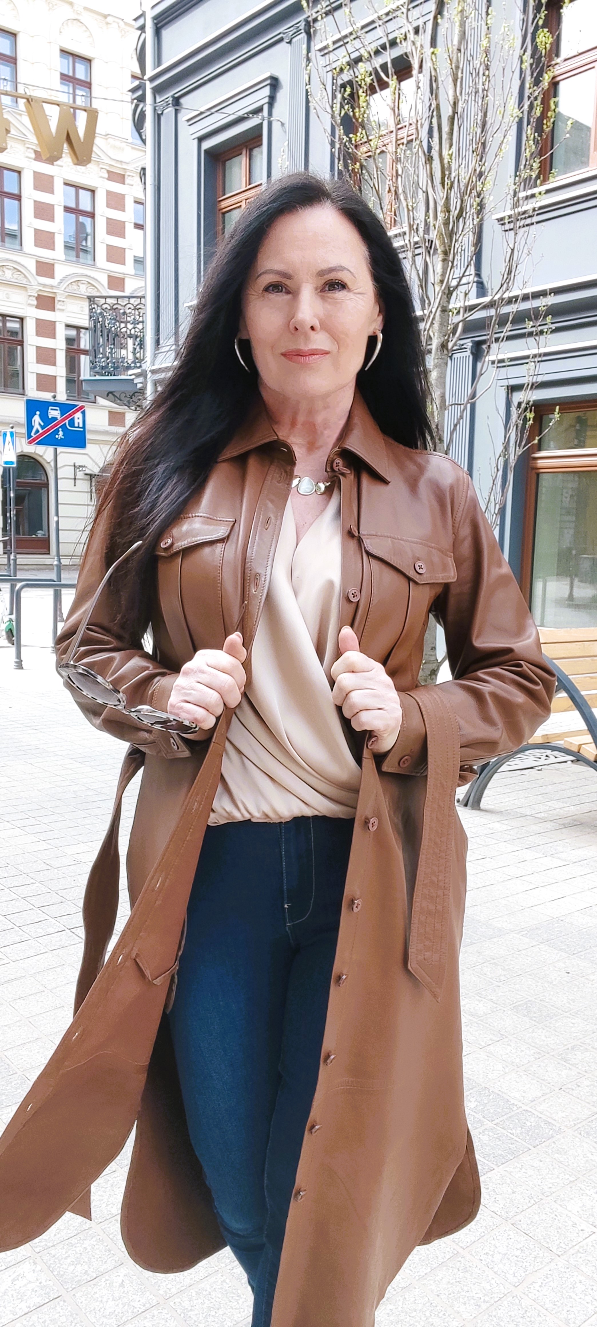Skórzana sukienka w formie szmizjerki, w dzisiejszej stylizacji zastapiła mi trench. To uniwersalny i jednocześnie ponadczasowy model. Można nosić ją cały rok, z czółenkami, kozakami i obuwiem spotrowym. Włożyłam pod nią rurki z ciemnego denimu i satynową bluzkę bez rekawów. Z dodatków wybrałam zamszowe czółenka i biżuterię w kolorze jasnego złota.