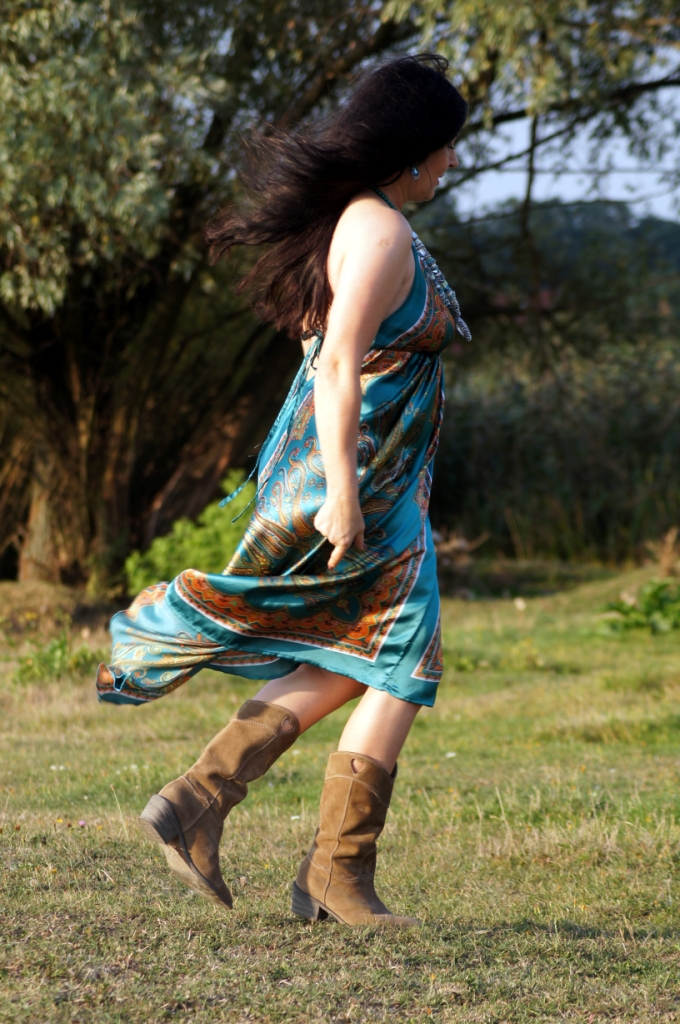 Turkusowa sukienka w orientalny wzór